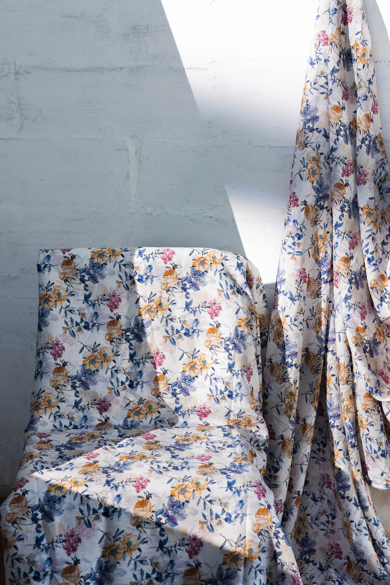 100% Pure European Linen Printed Fabric - Floral - Blue/Indigo/Beige