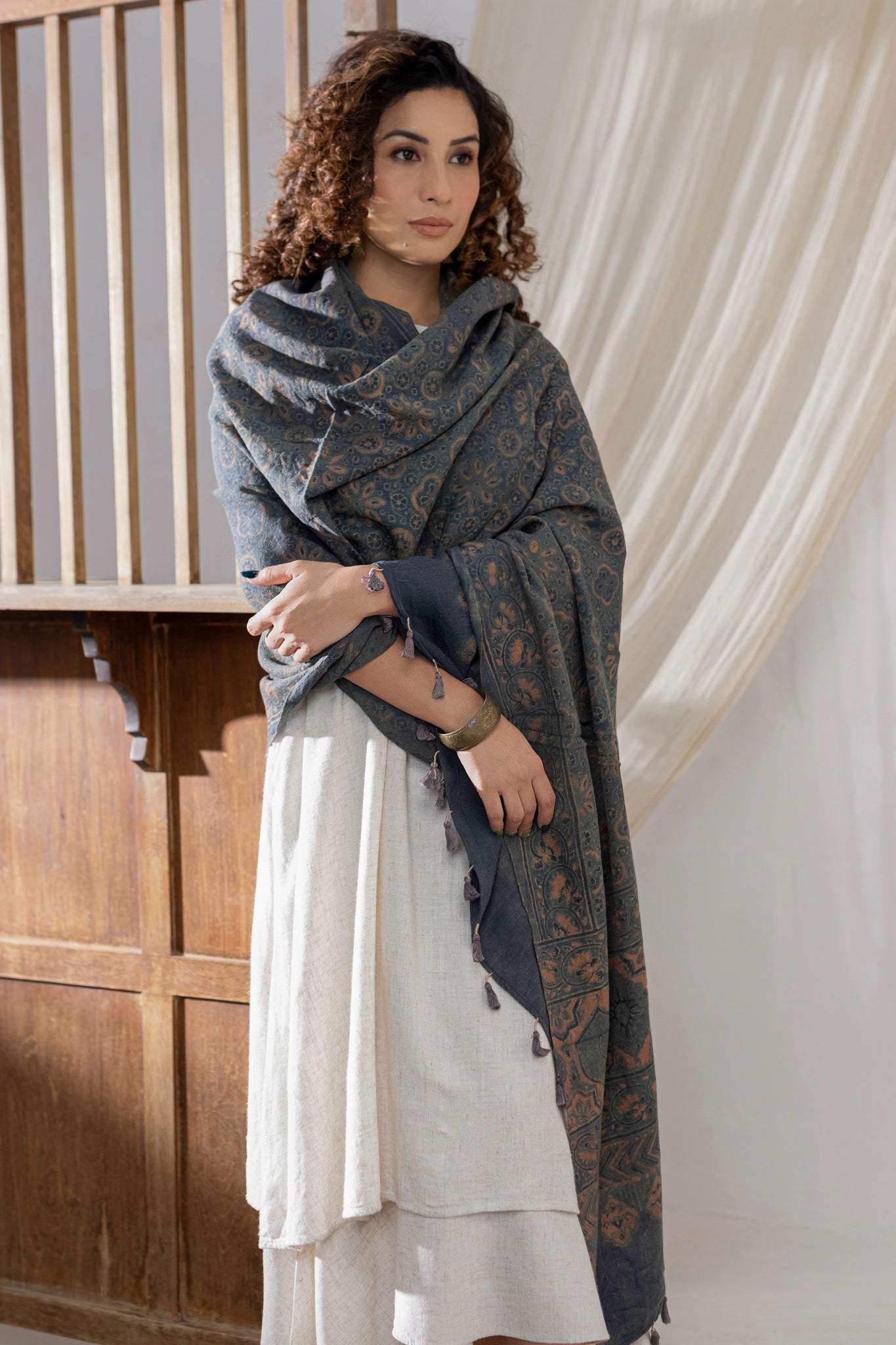 Ajrakh Hand Block Printed - Handloom Woolen Dupatta