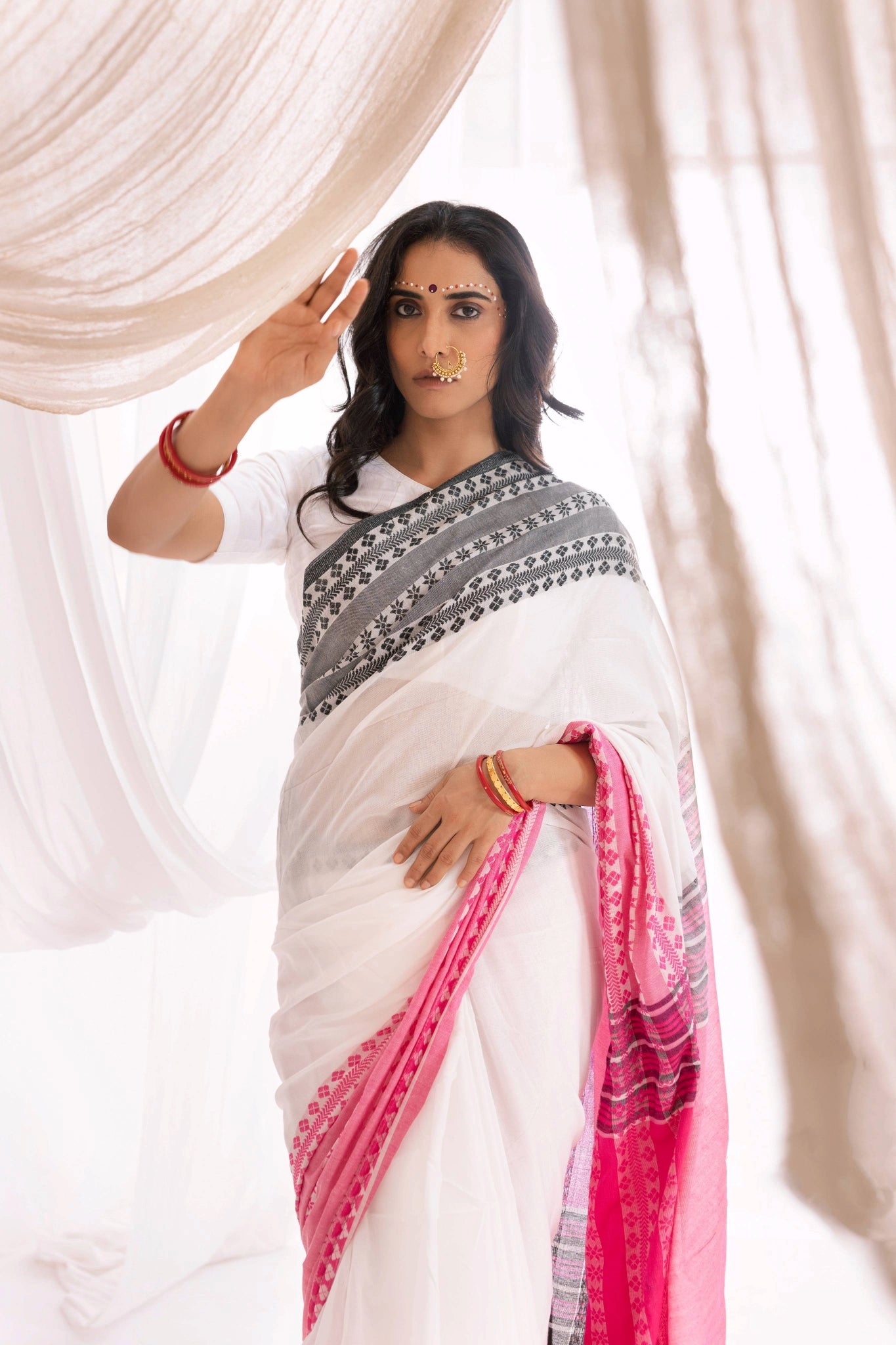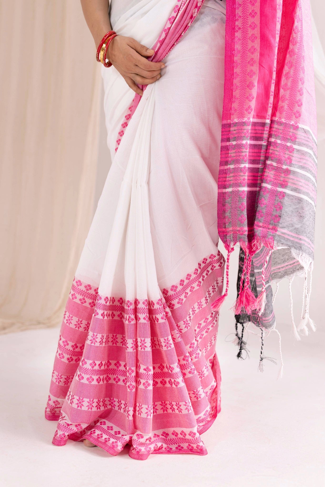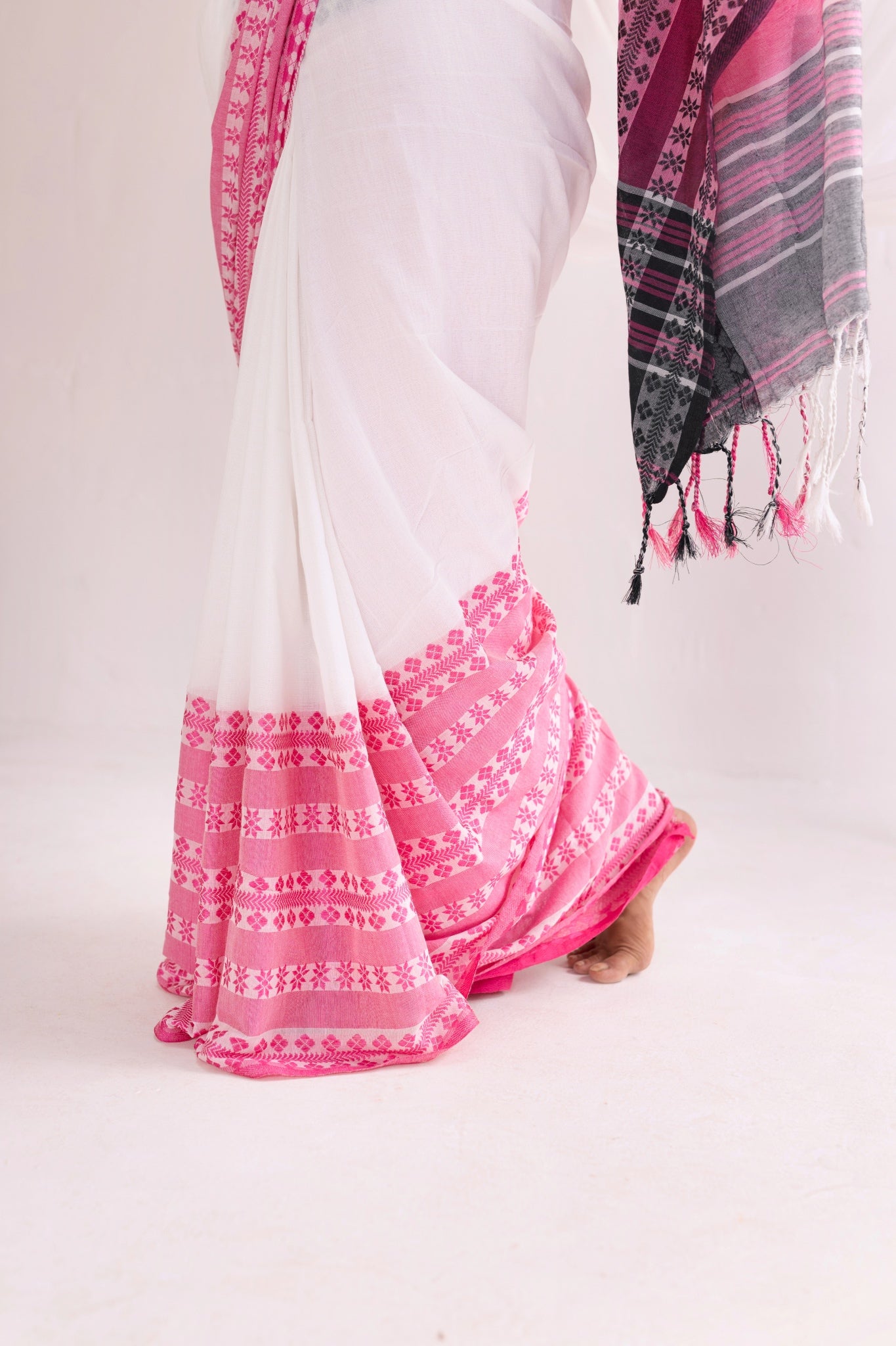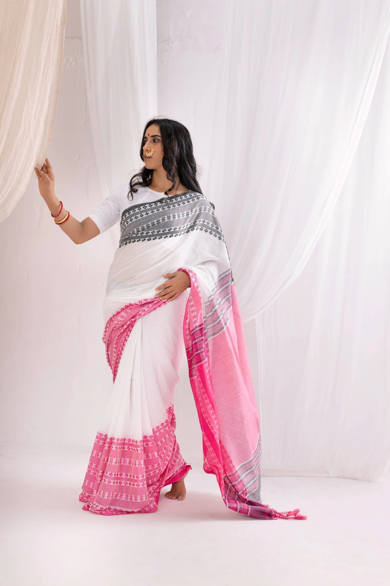 Begumpuri Handloom Cotton Saree - White/Grey/Pink