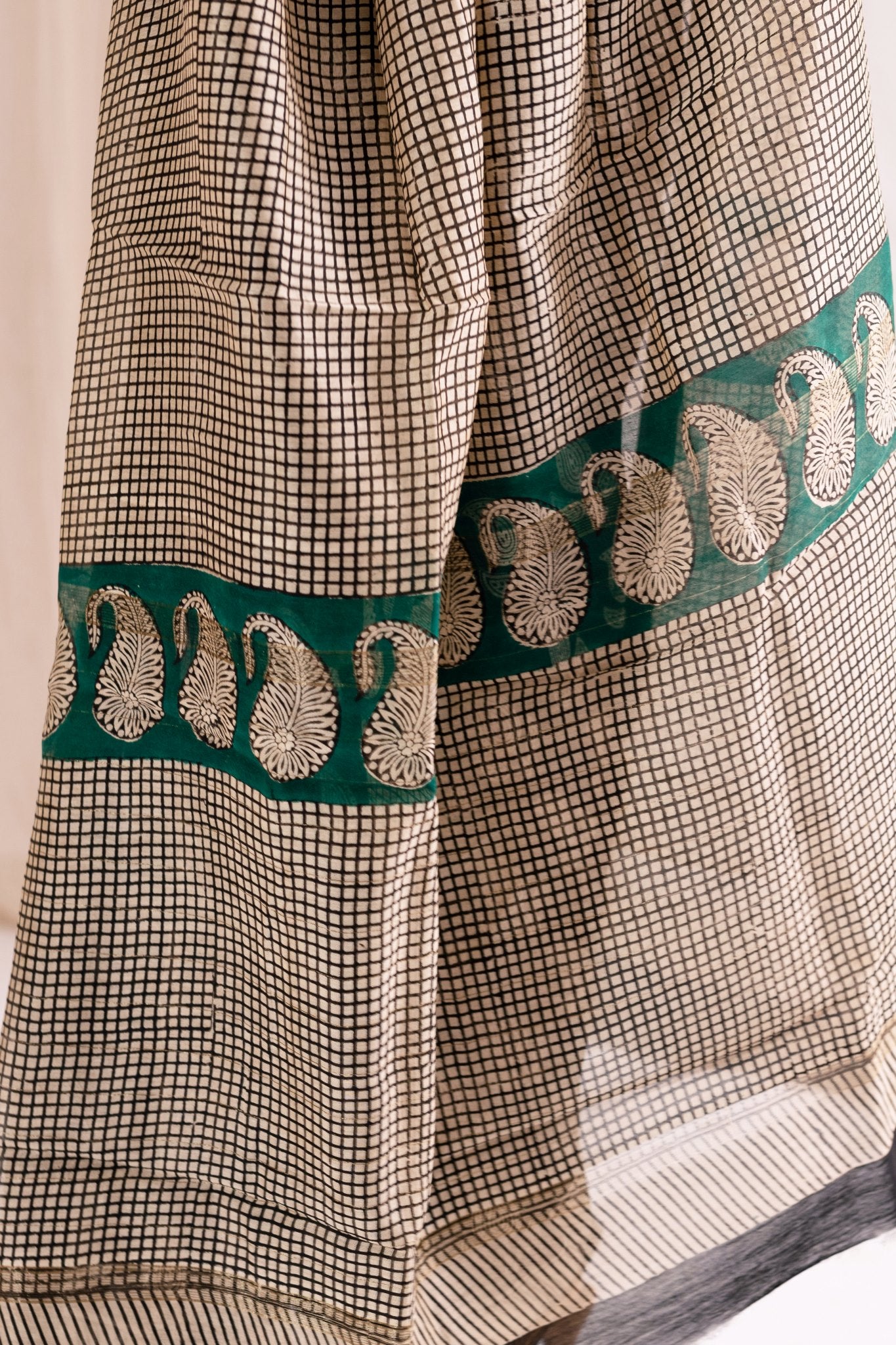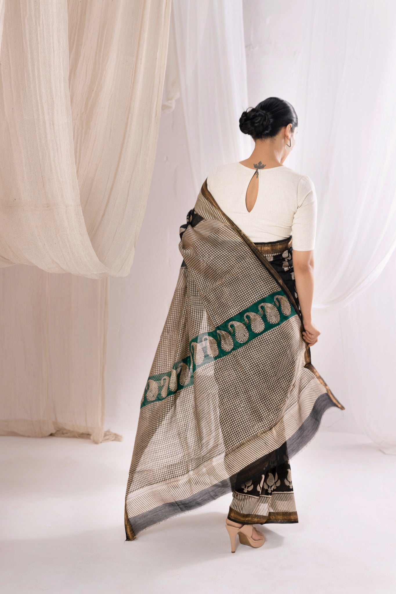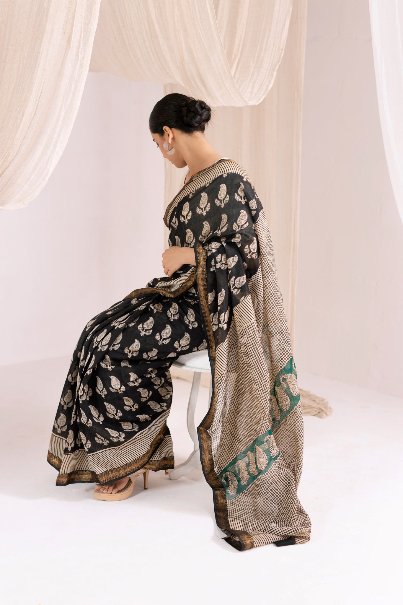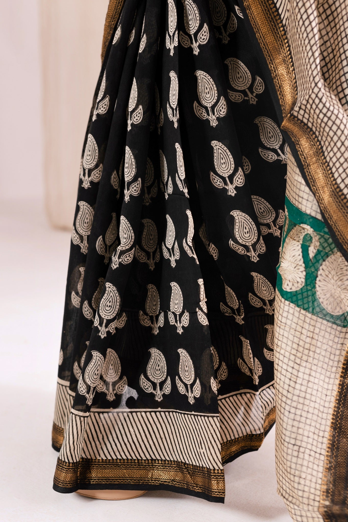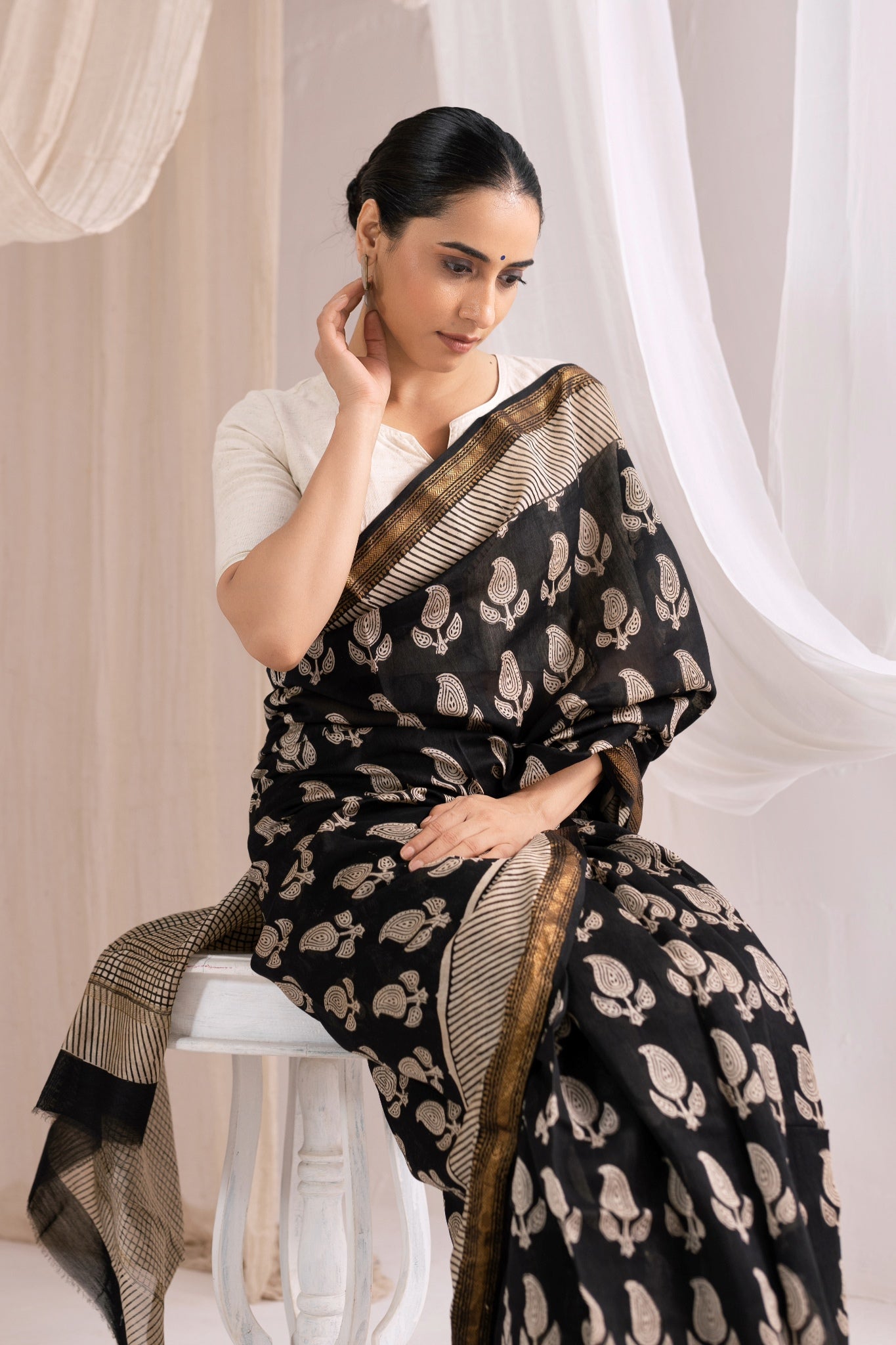 Black - Bagru Handblock Printed Maheshwari Silk Saree