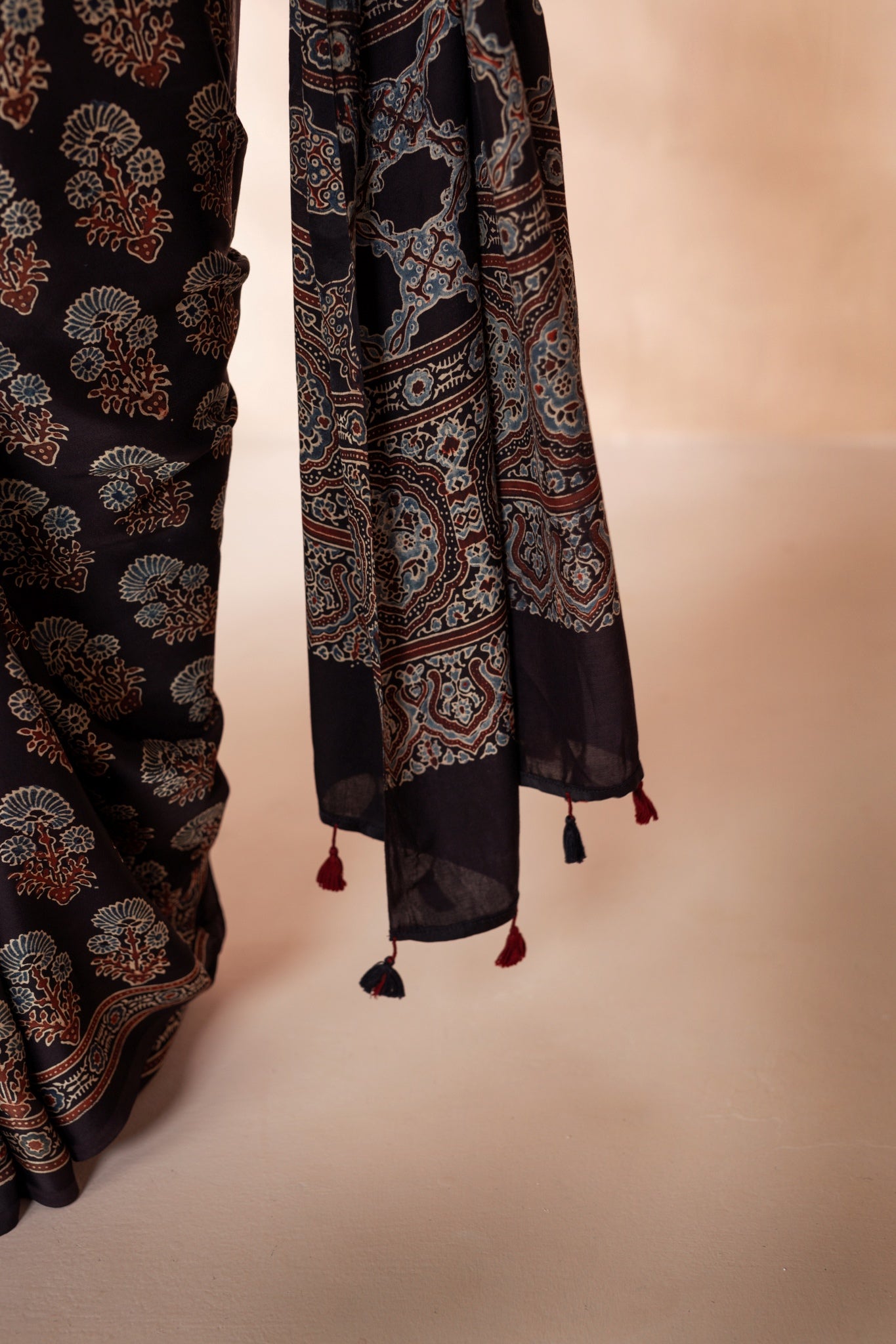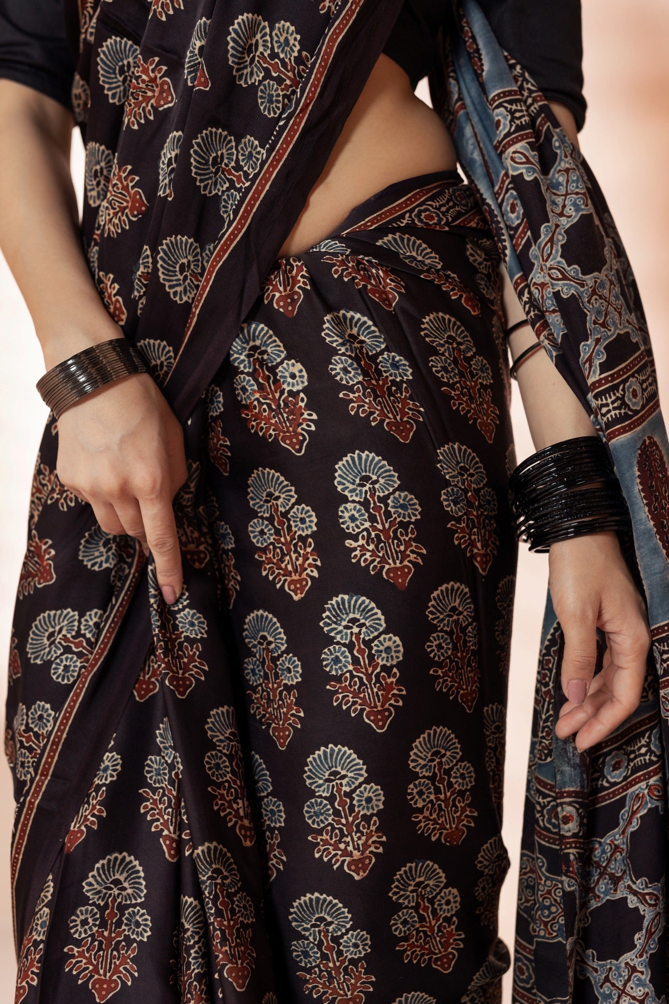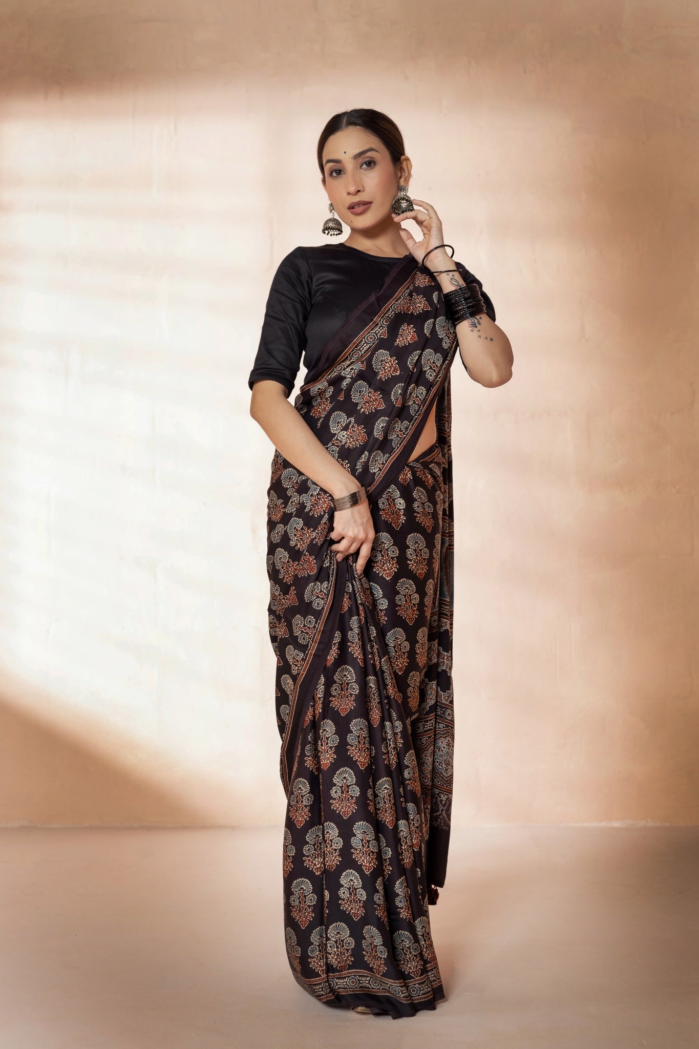 Black Modal Silk Ajrakh Hand Block Printed Saree