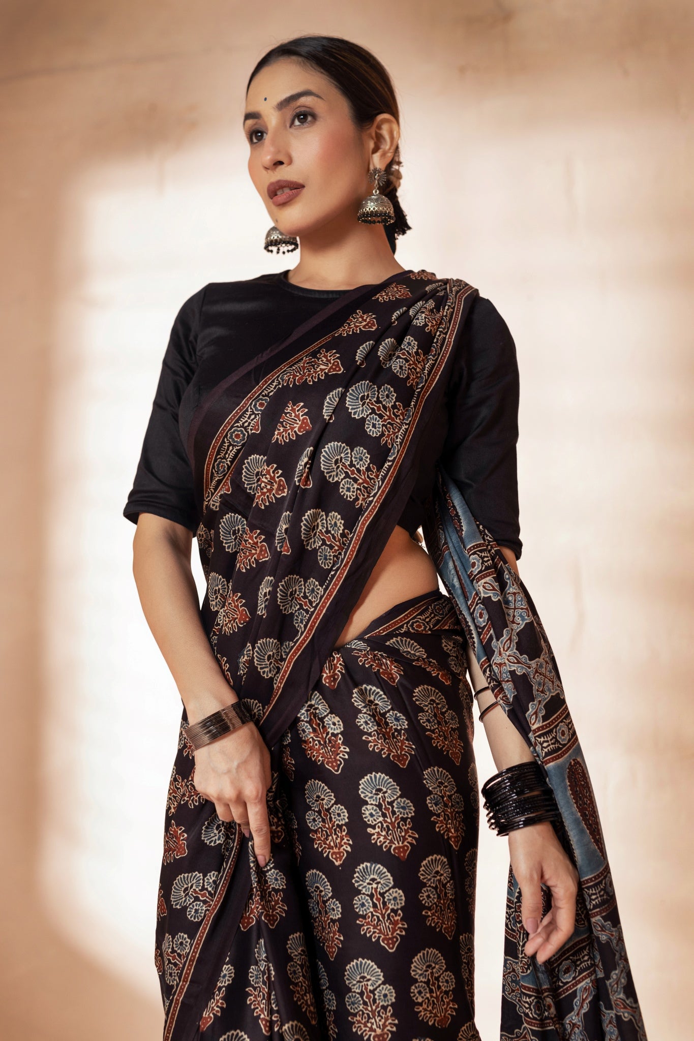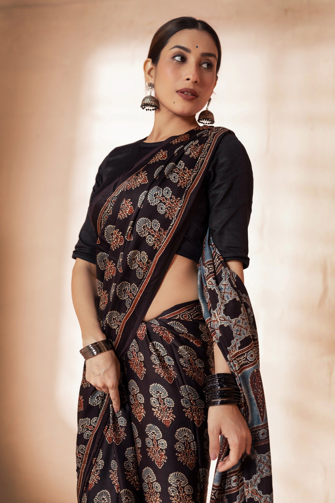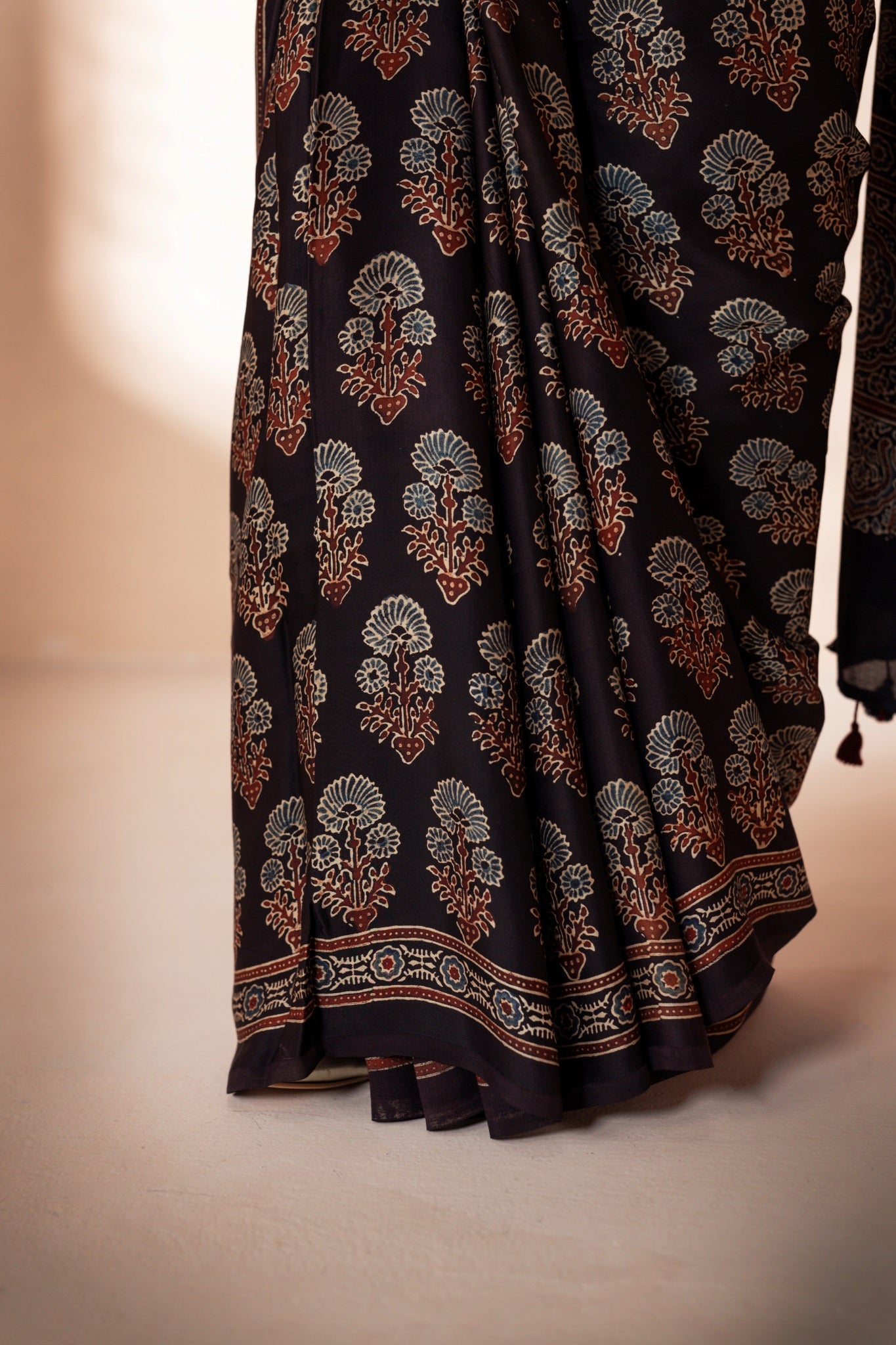 Black Modal Silk Ajrakh Hand Block Printed Saree
