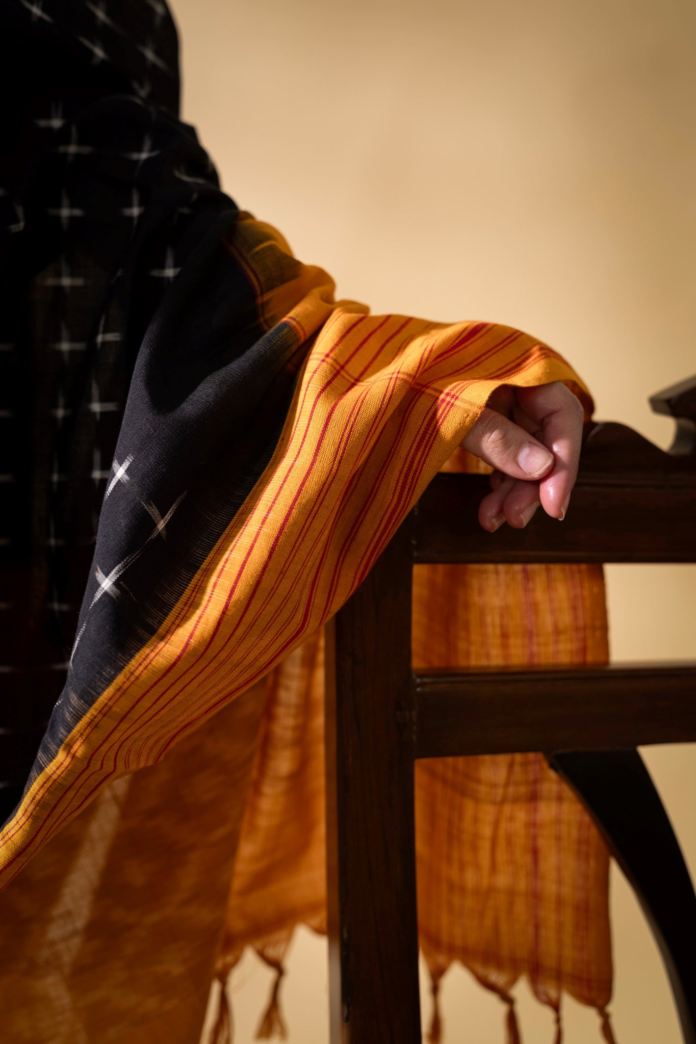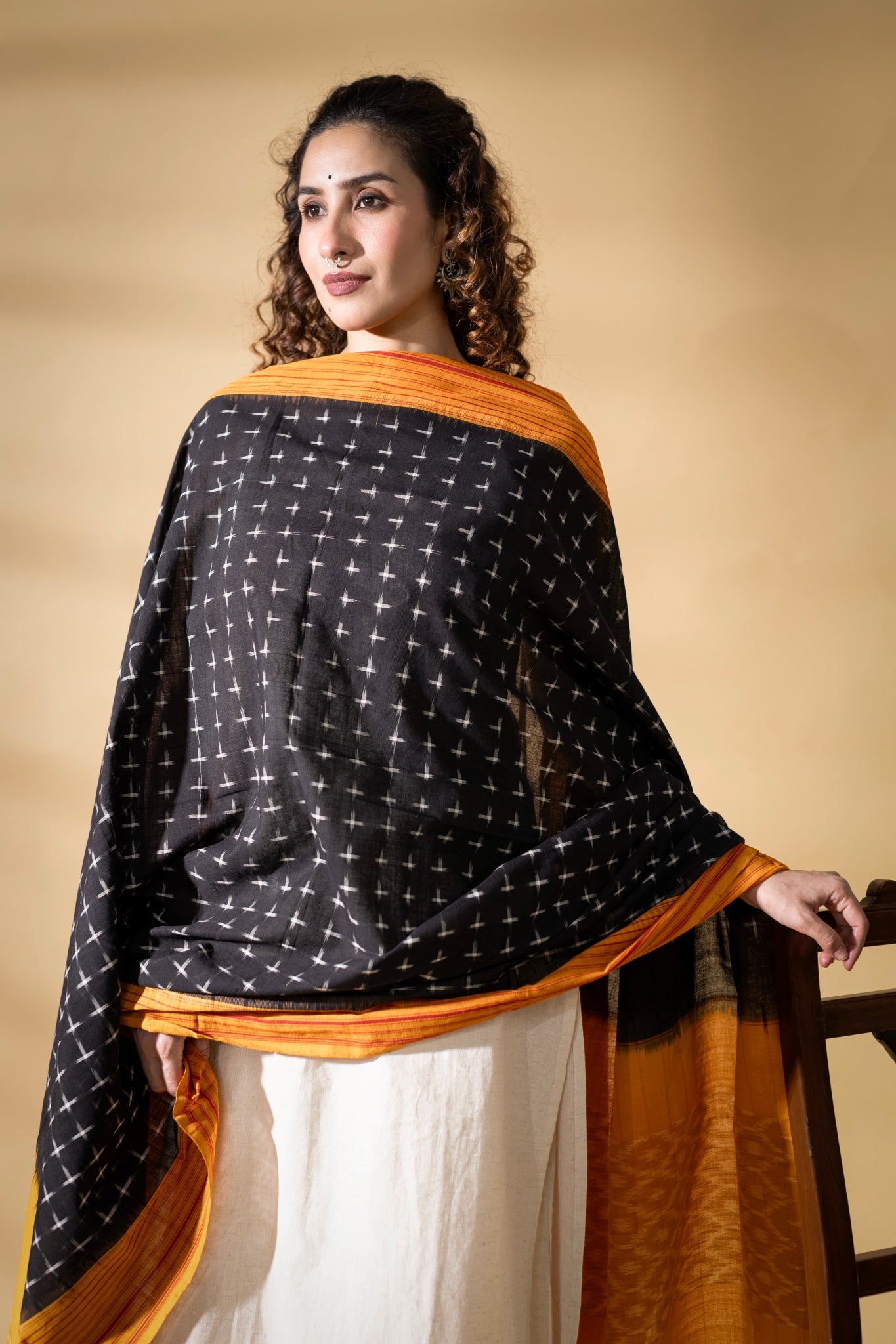 Black/Yellow - Pochampally double Ikat cotton dupatta