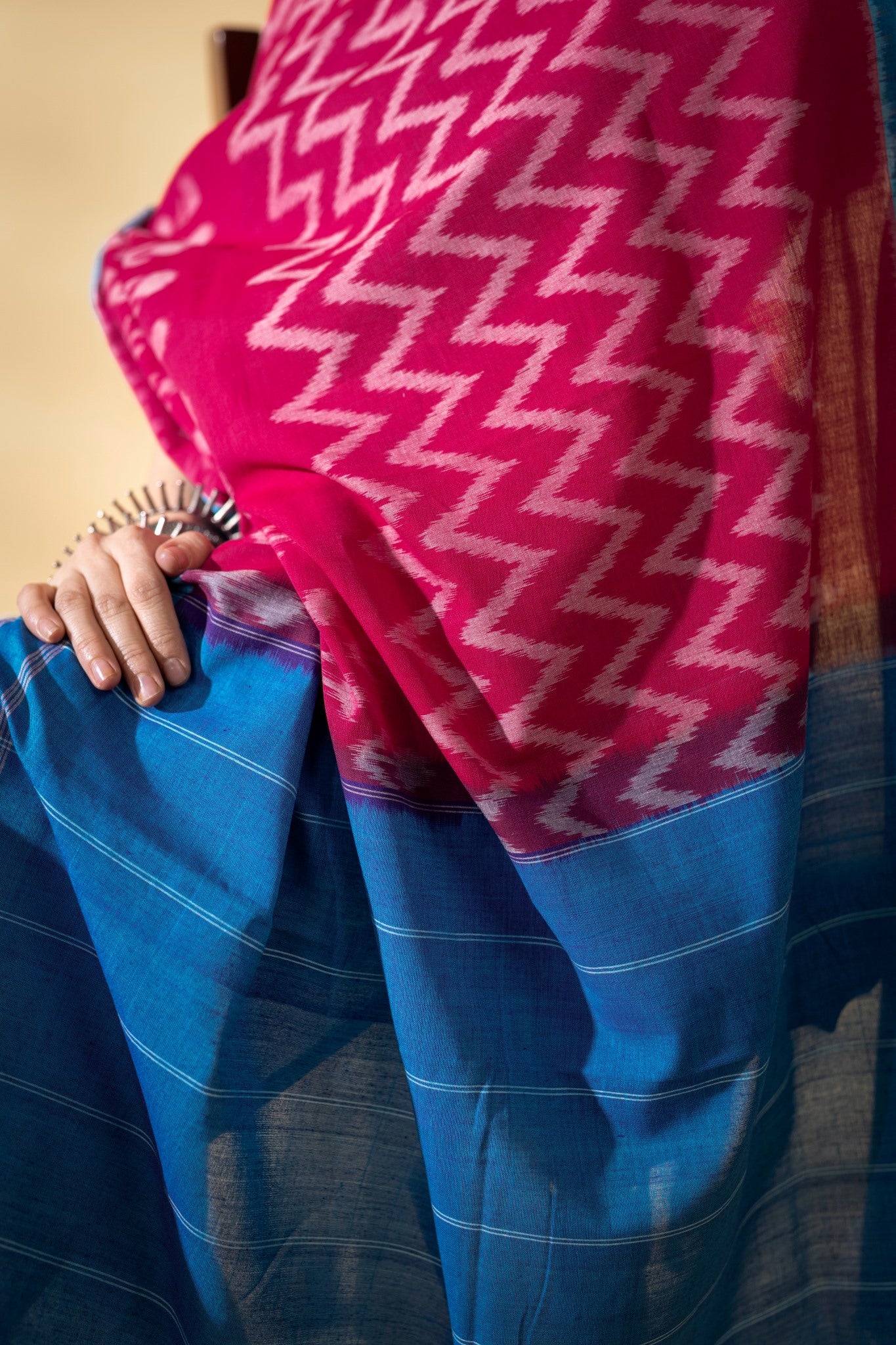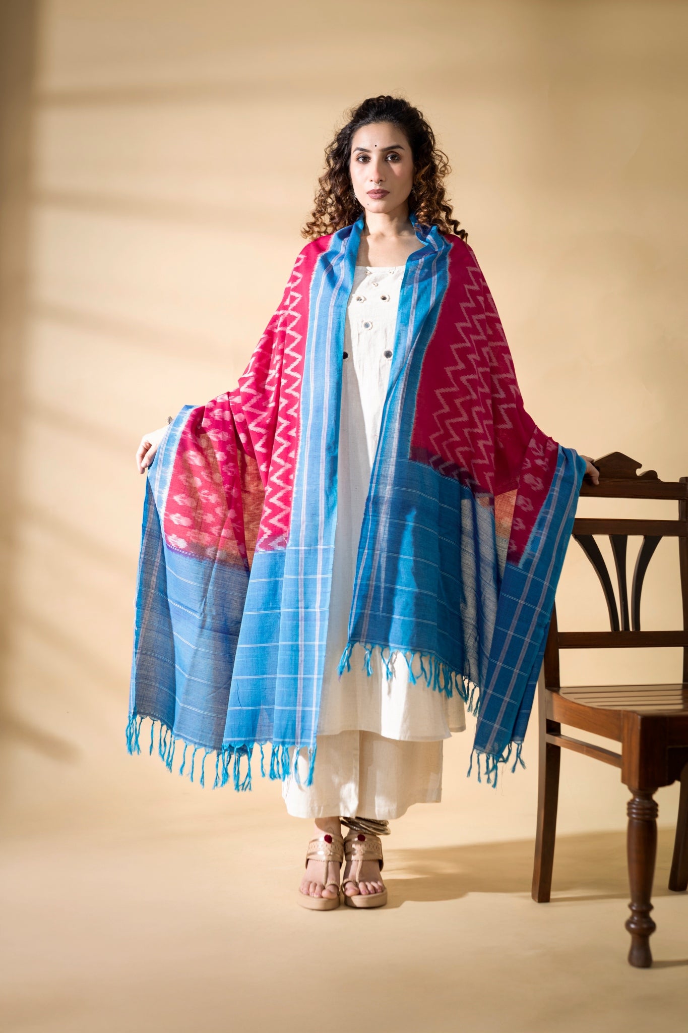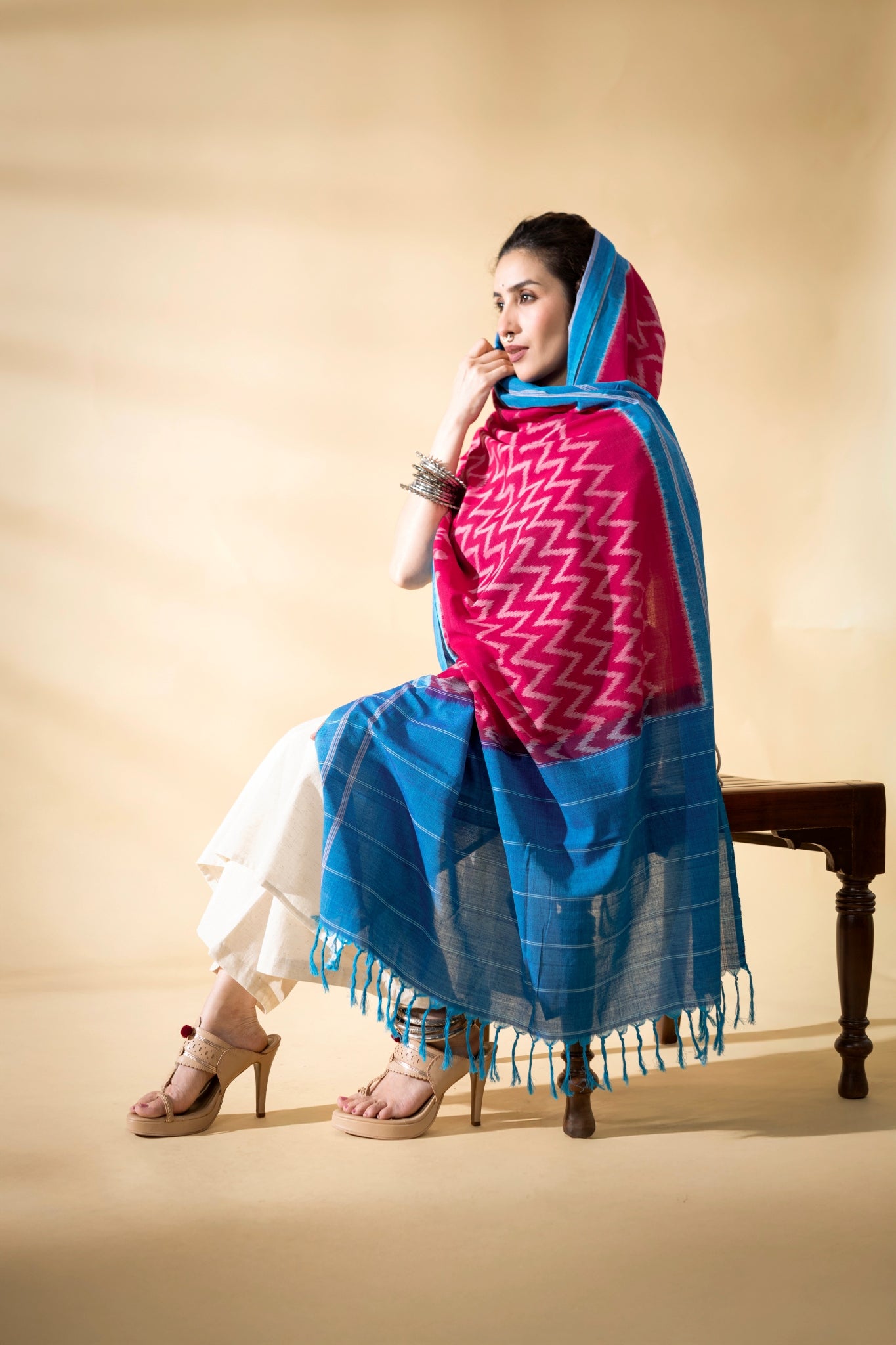 Blue/Pink - Pochampally double Ikat cotton dupatta