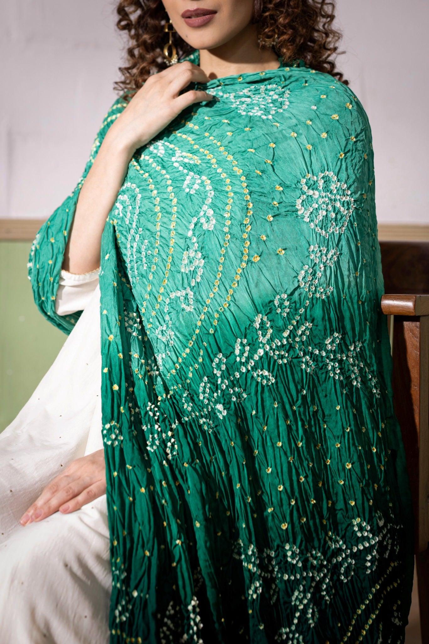 Bottle Green - Modal Silk Bandhani Ombre Dyed Dupatta with Lagdi Patta