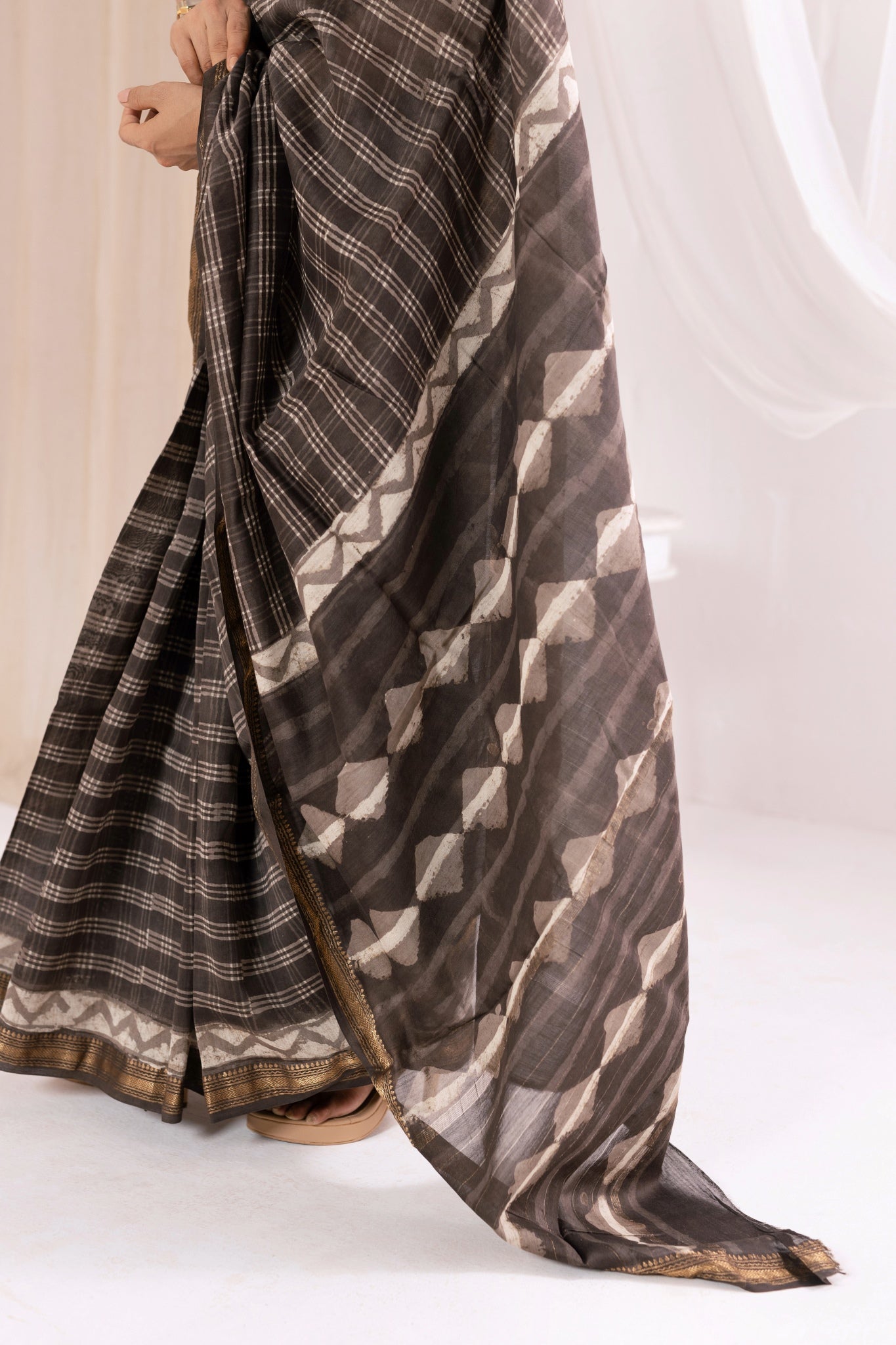 Brown - Bagru Handblock Printed Maheshwari Silk Saree