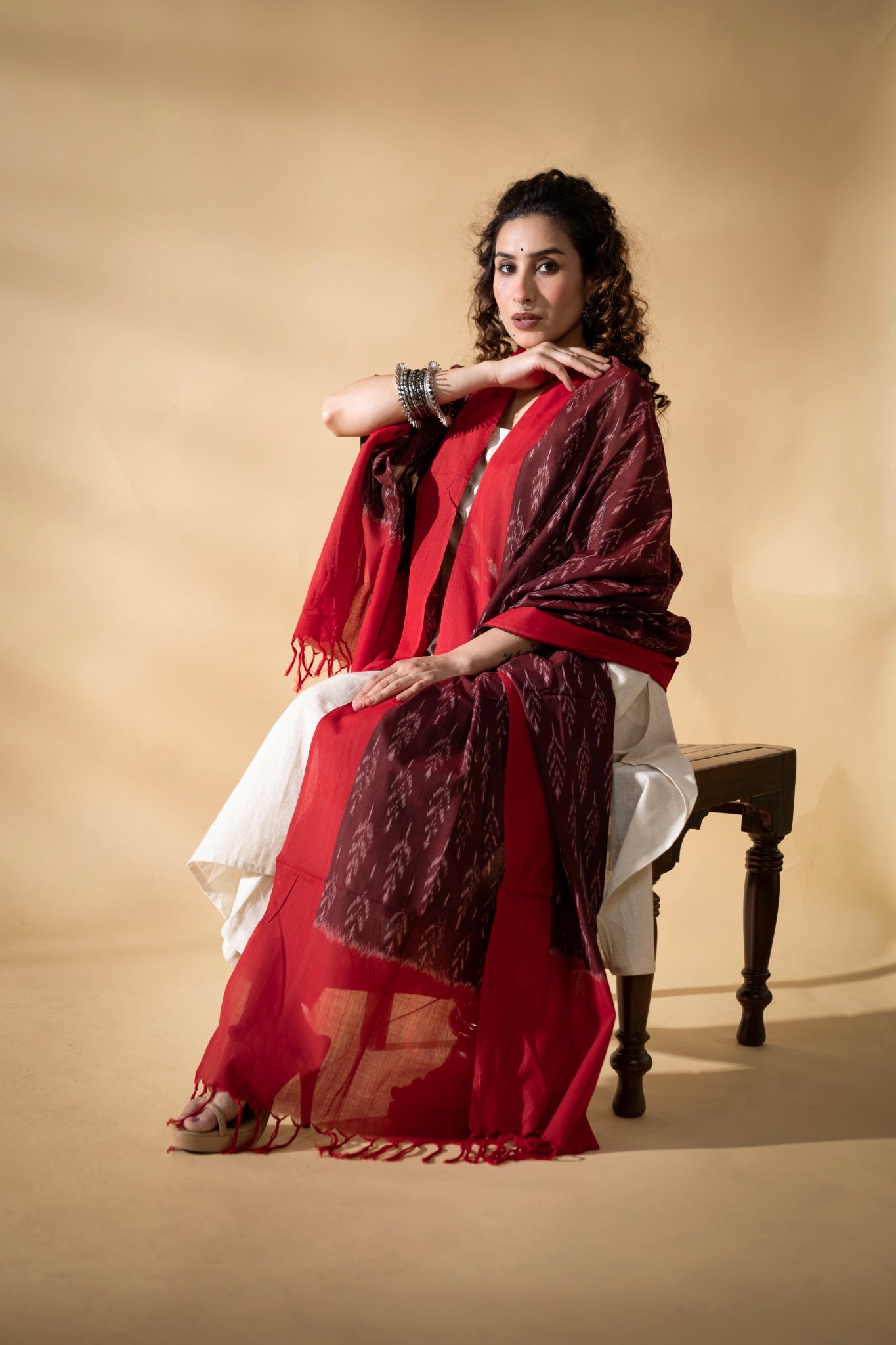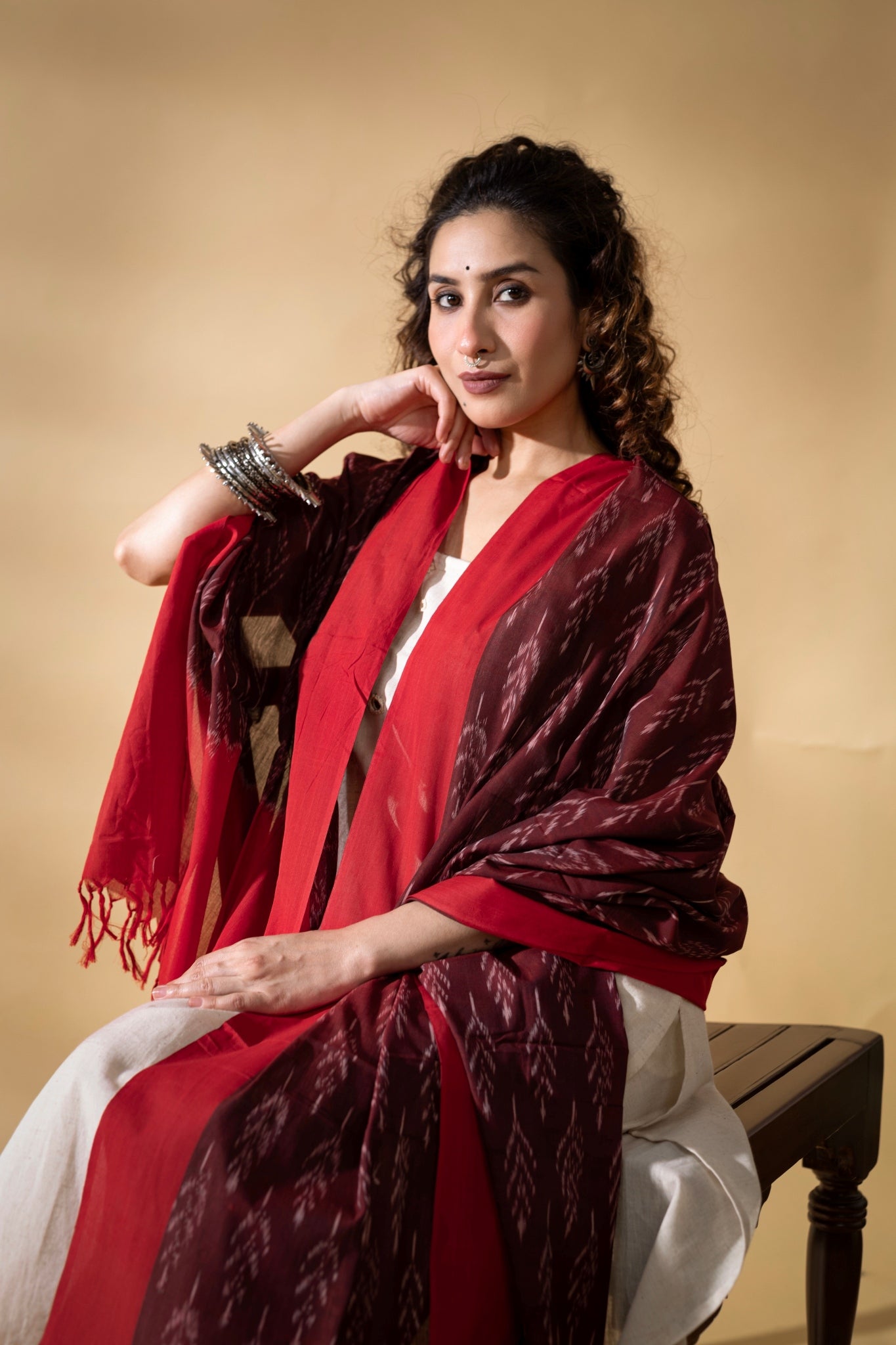 Deep Brown/Red - Pochampally double Ikat cotton dupatta