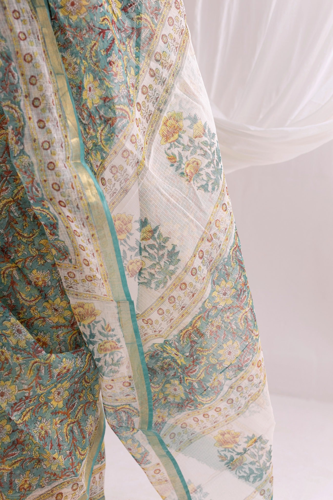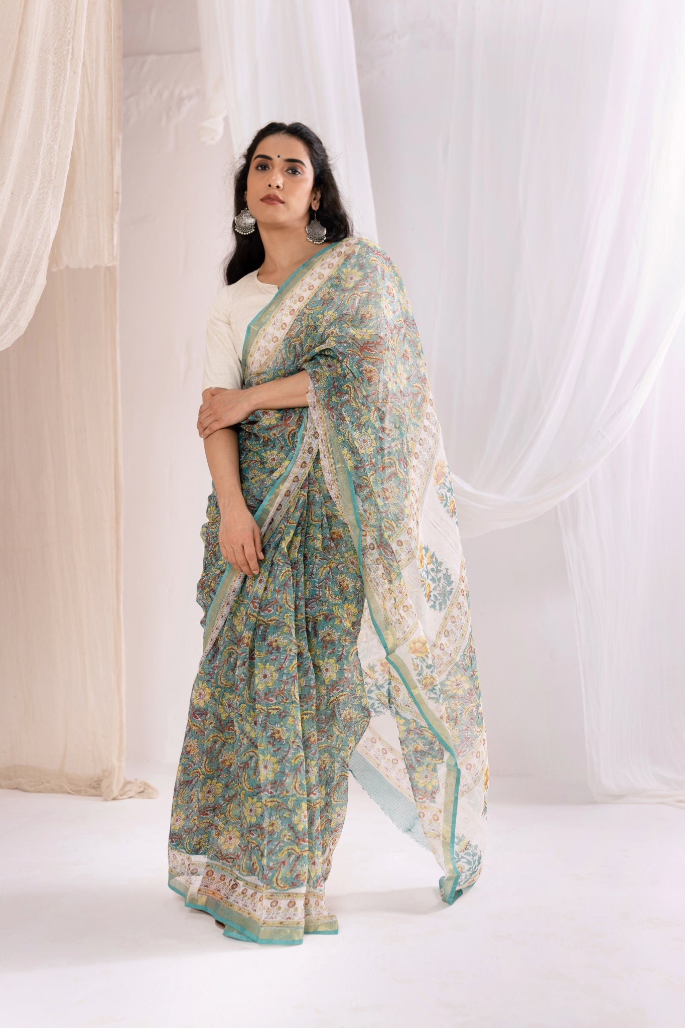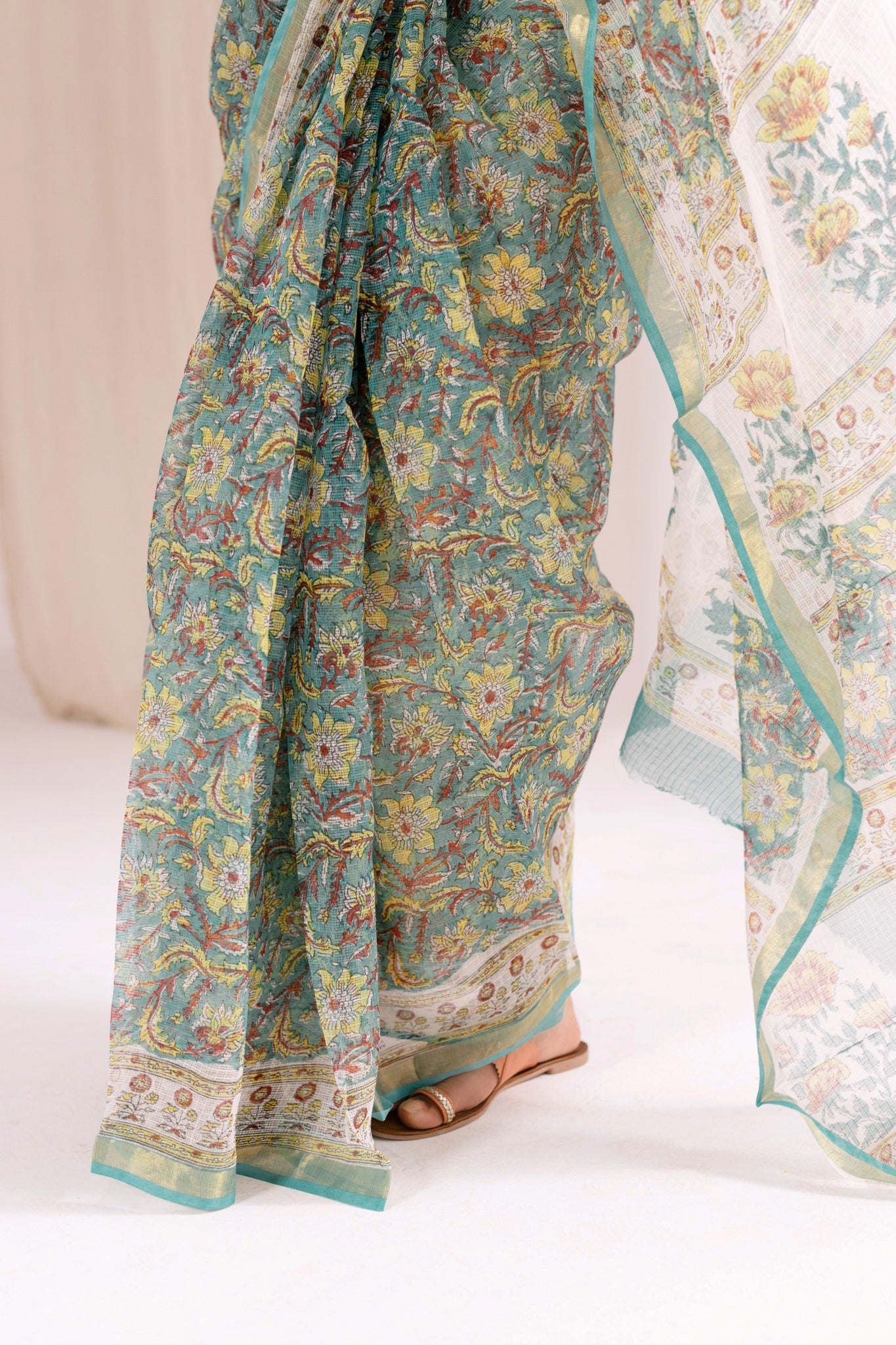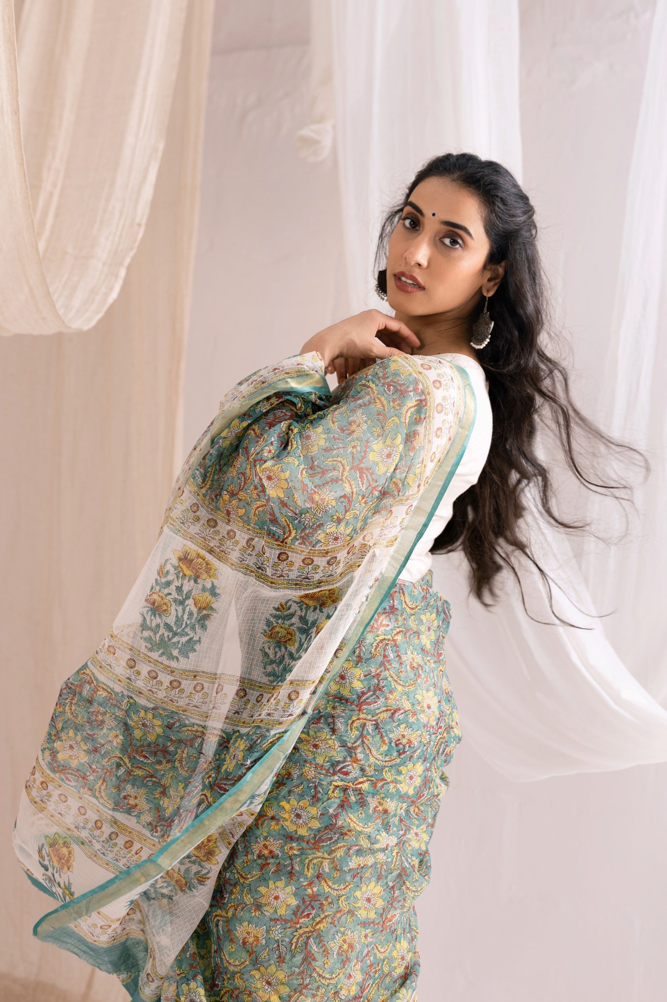 Green - Kota Doria Bagru Hand Block Printed Saree