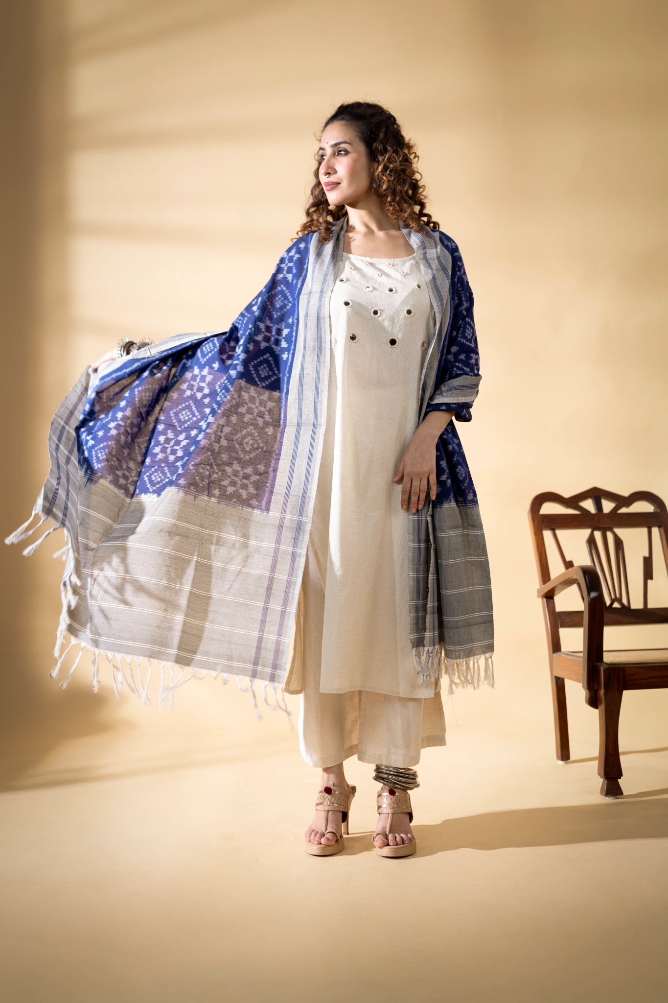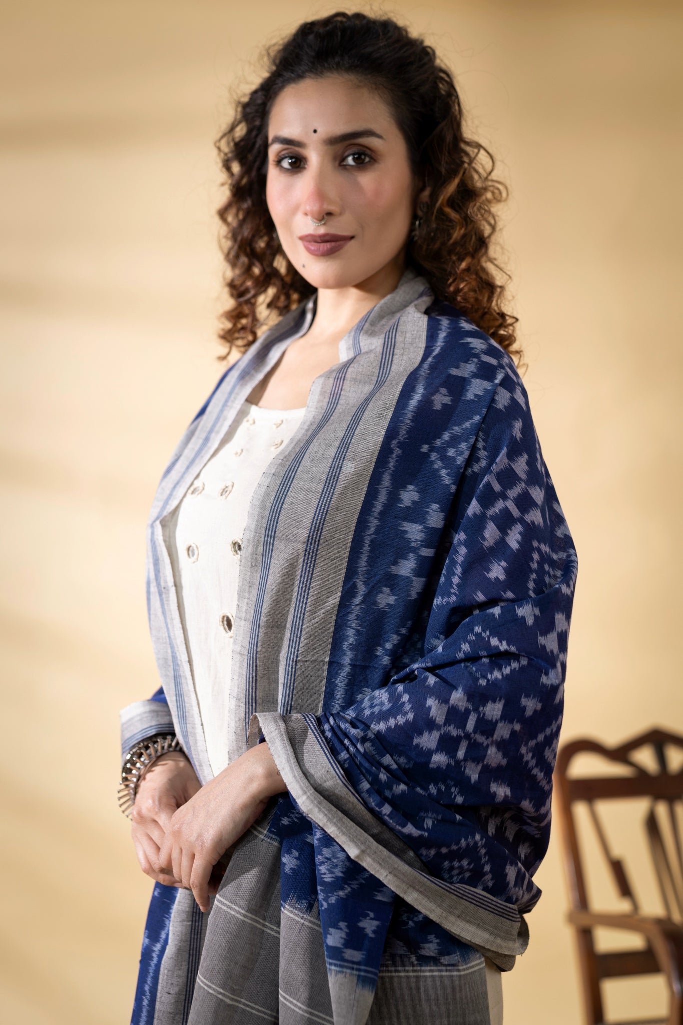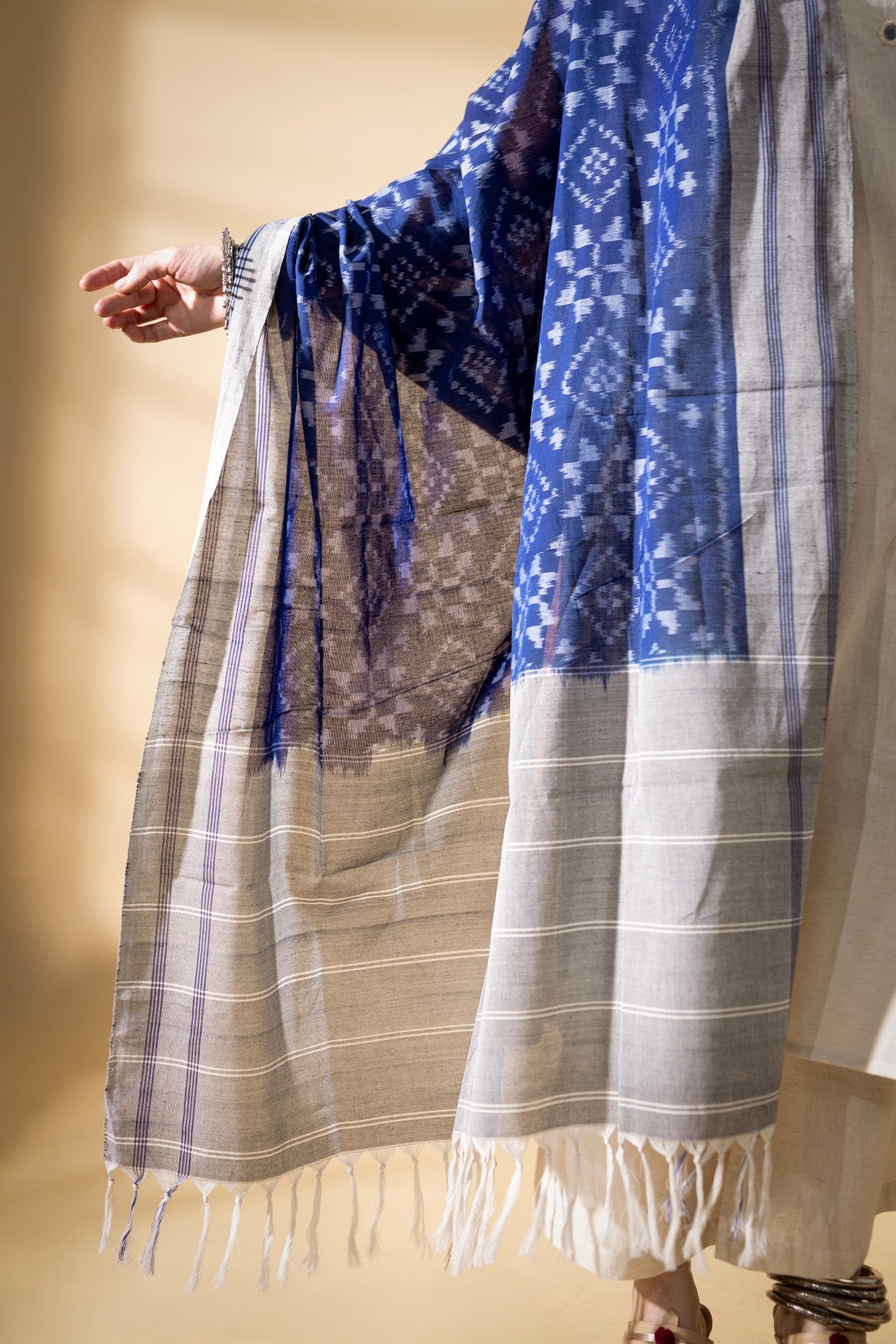 Grey/Blue - Pochampally double Ikat cotton dupatta