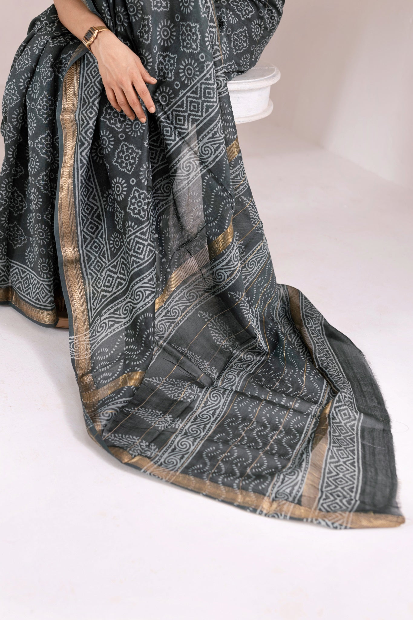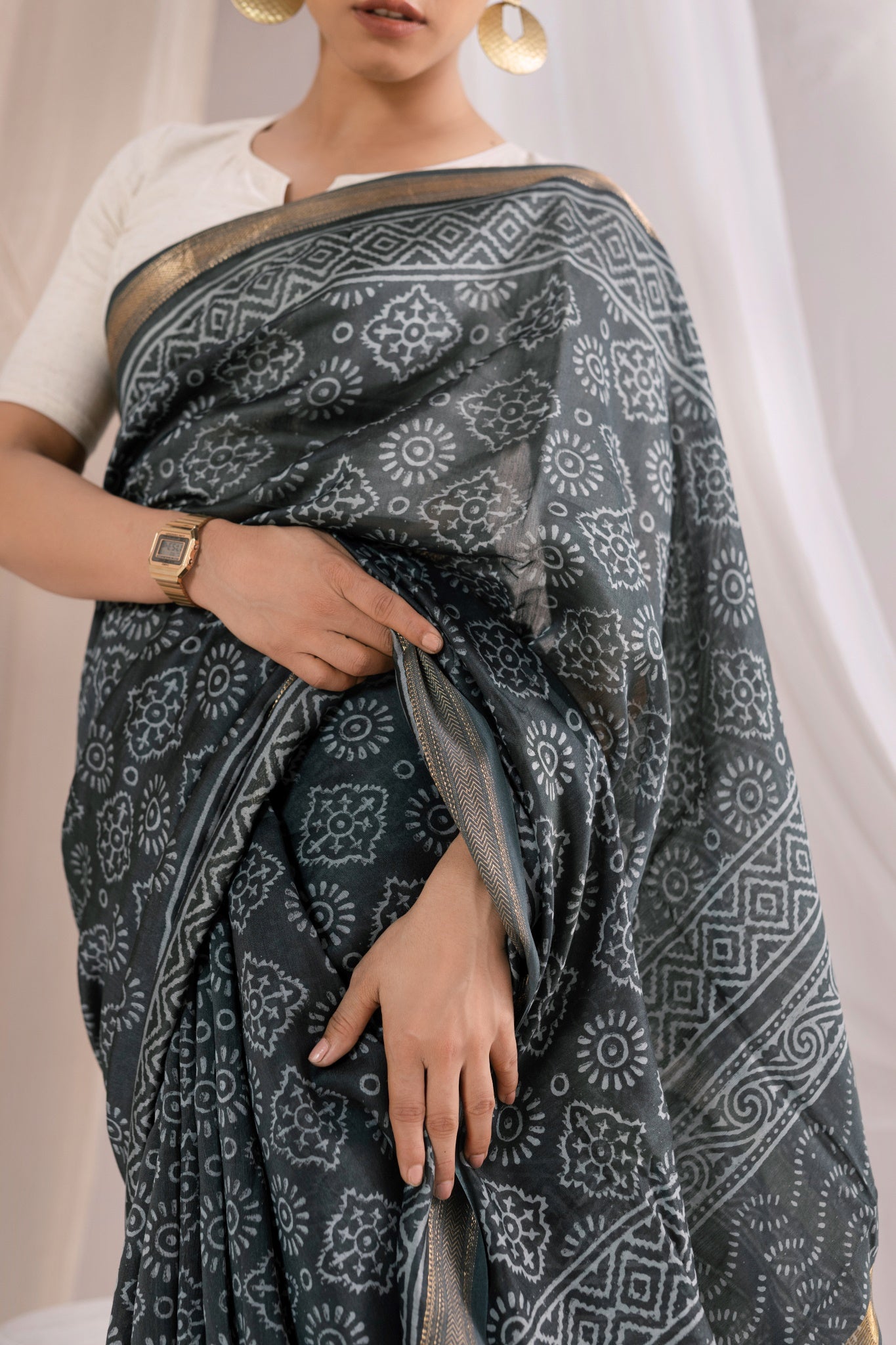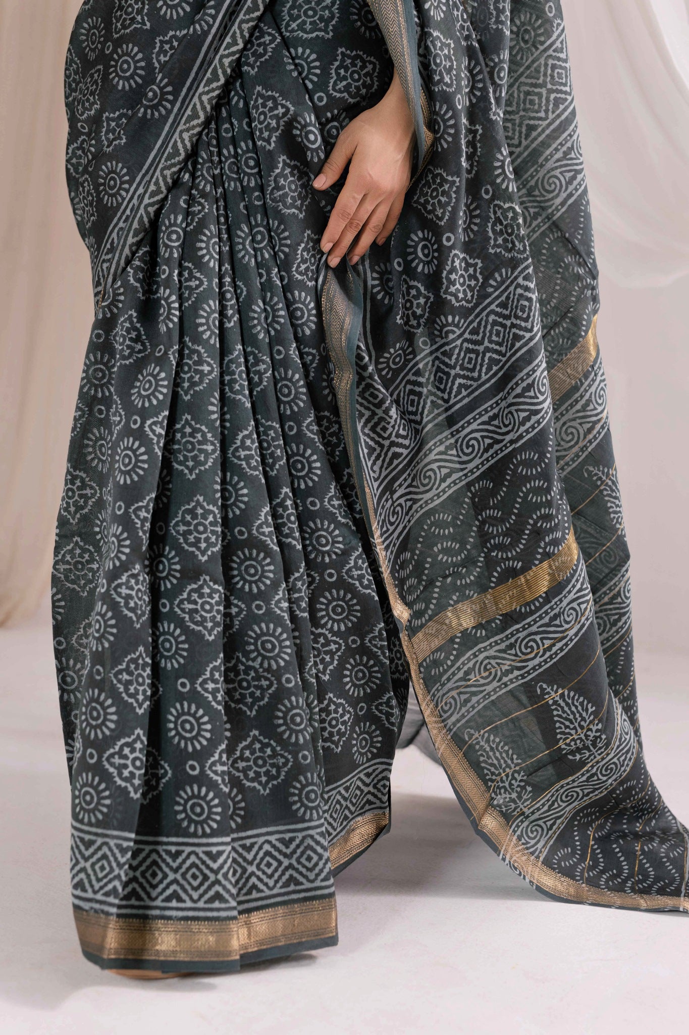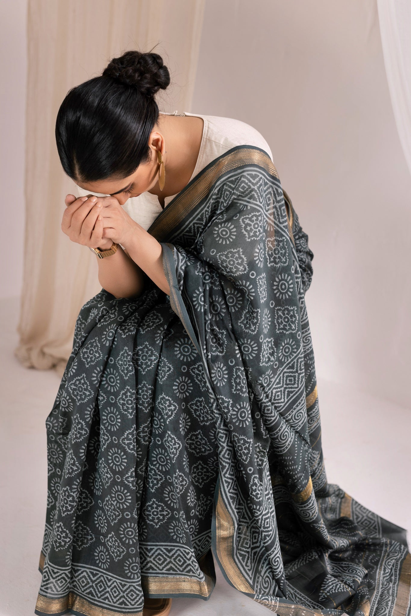 Grey - Bagru Handblock Printed Maheshwari Silk Saree