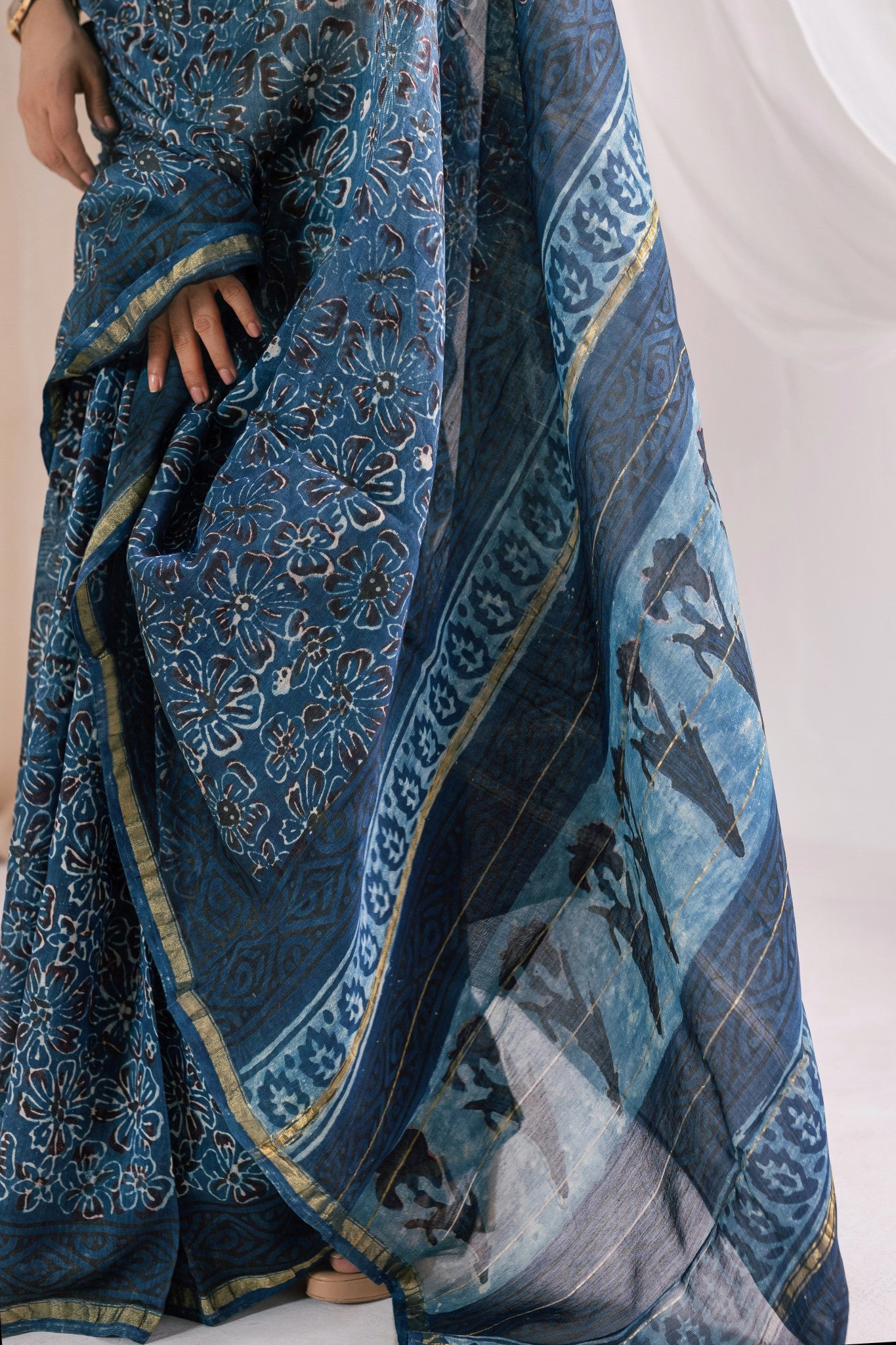 Indigo - Chanderi Silk Ajrakh Hand block Printed Saree | Natural Vanaspati Dyes