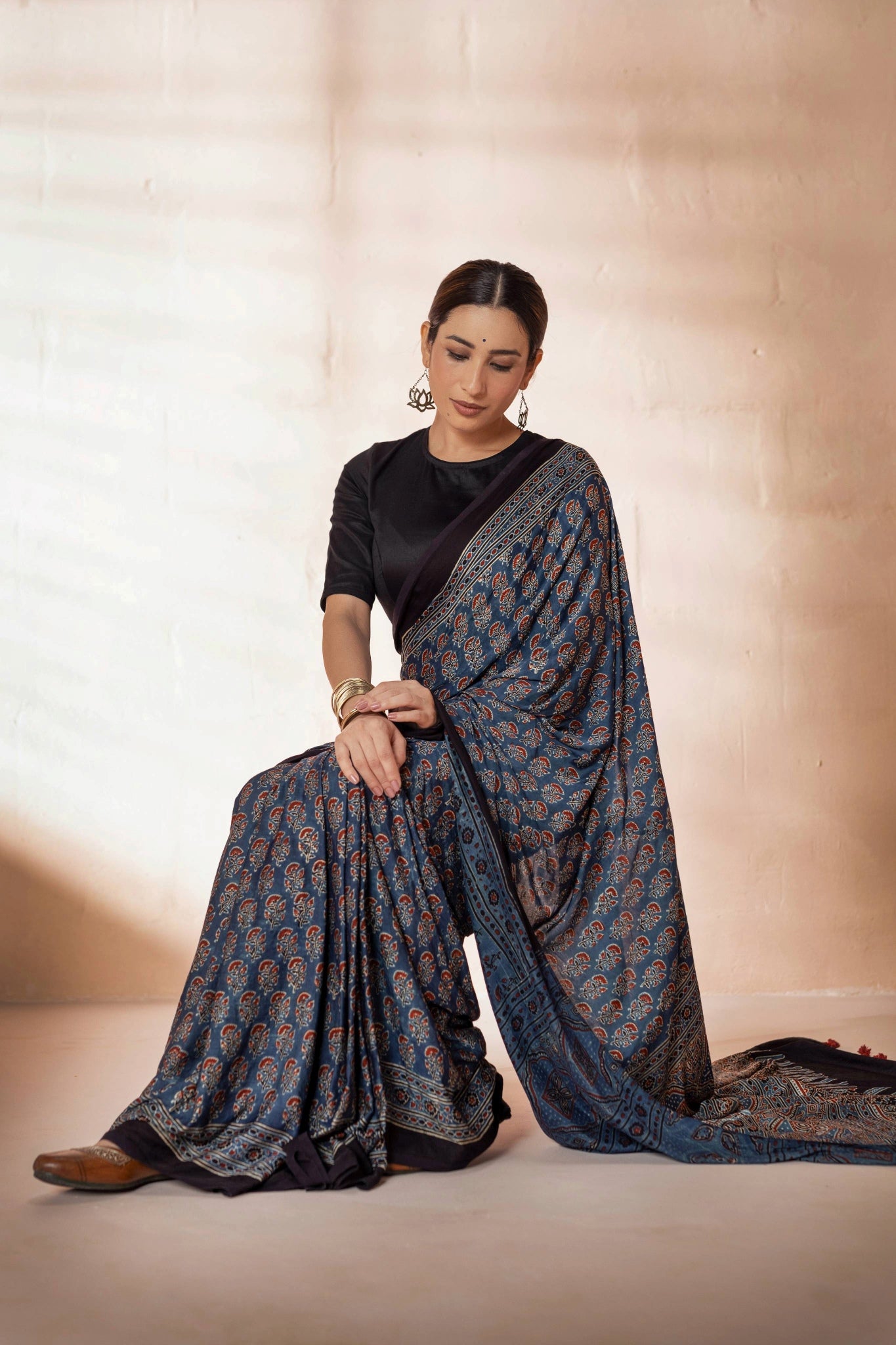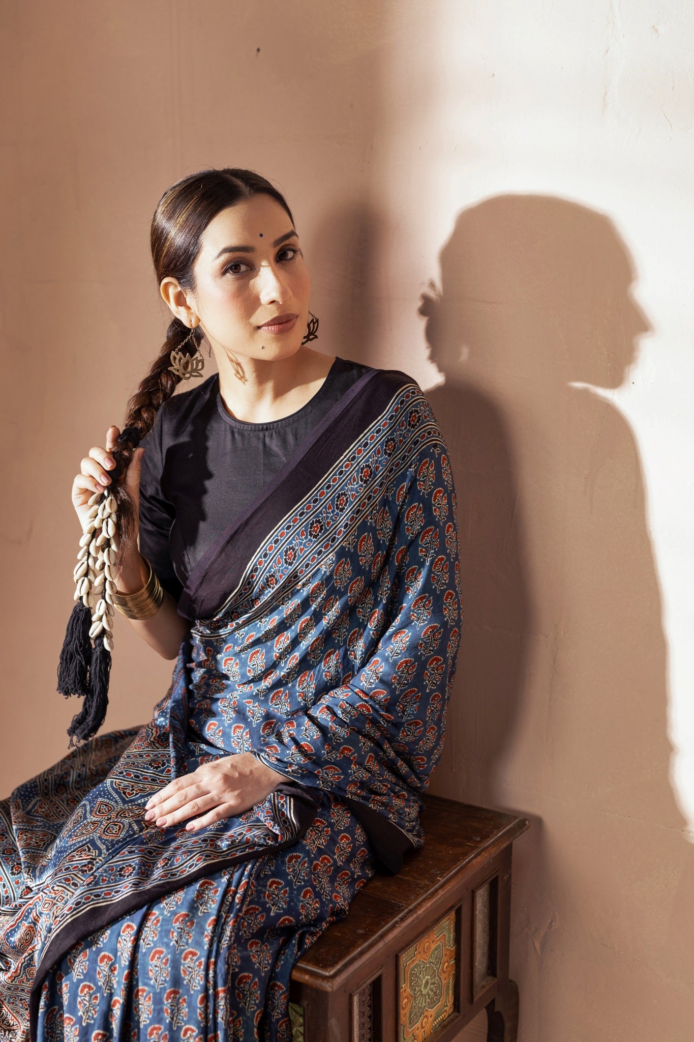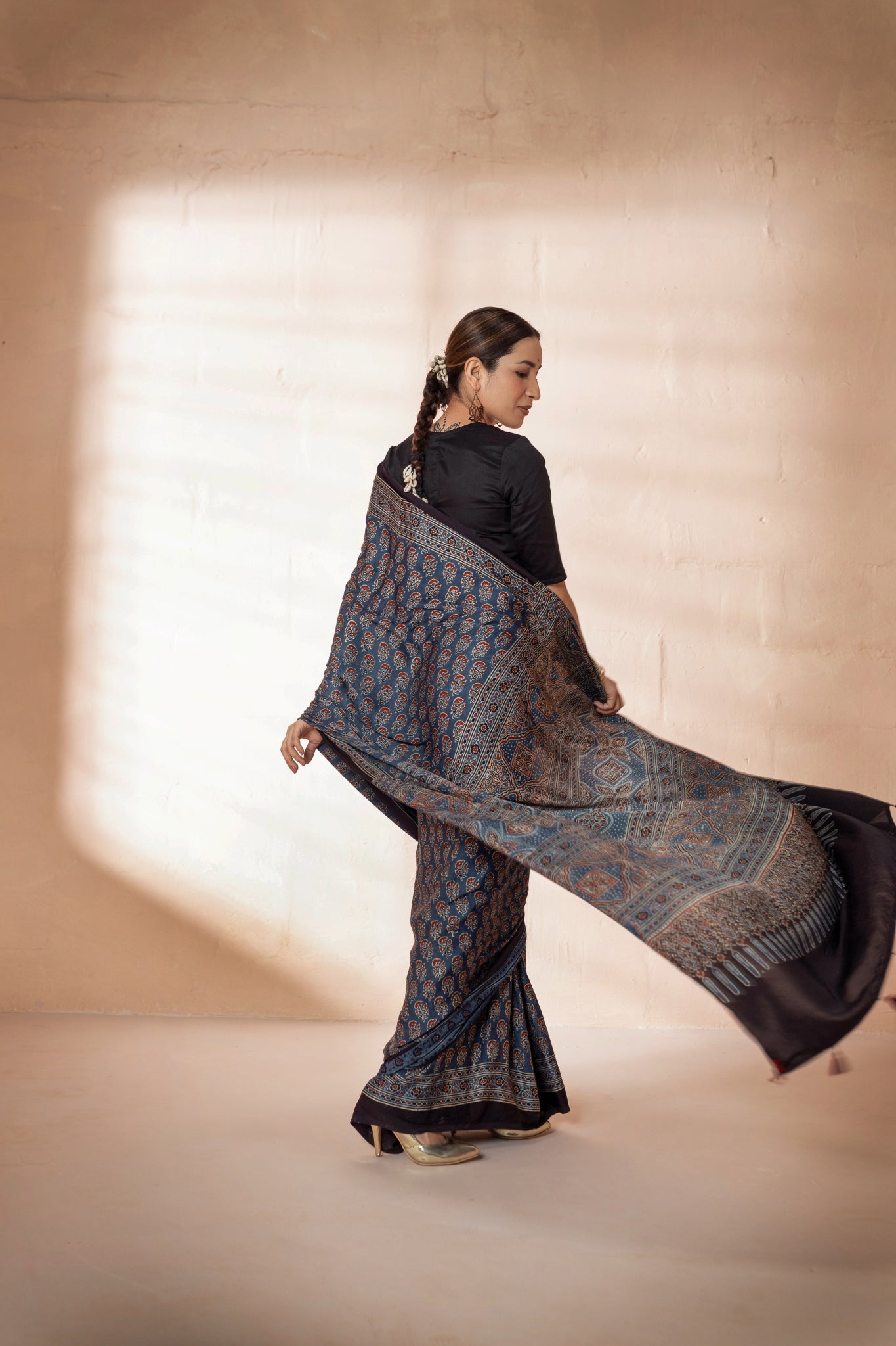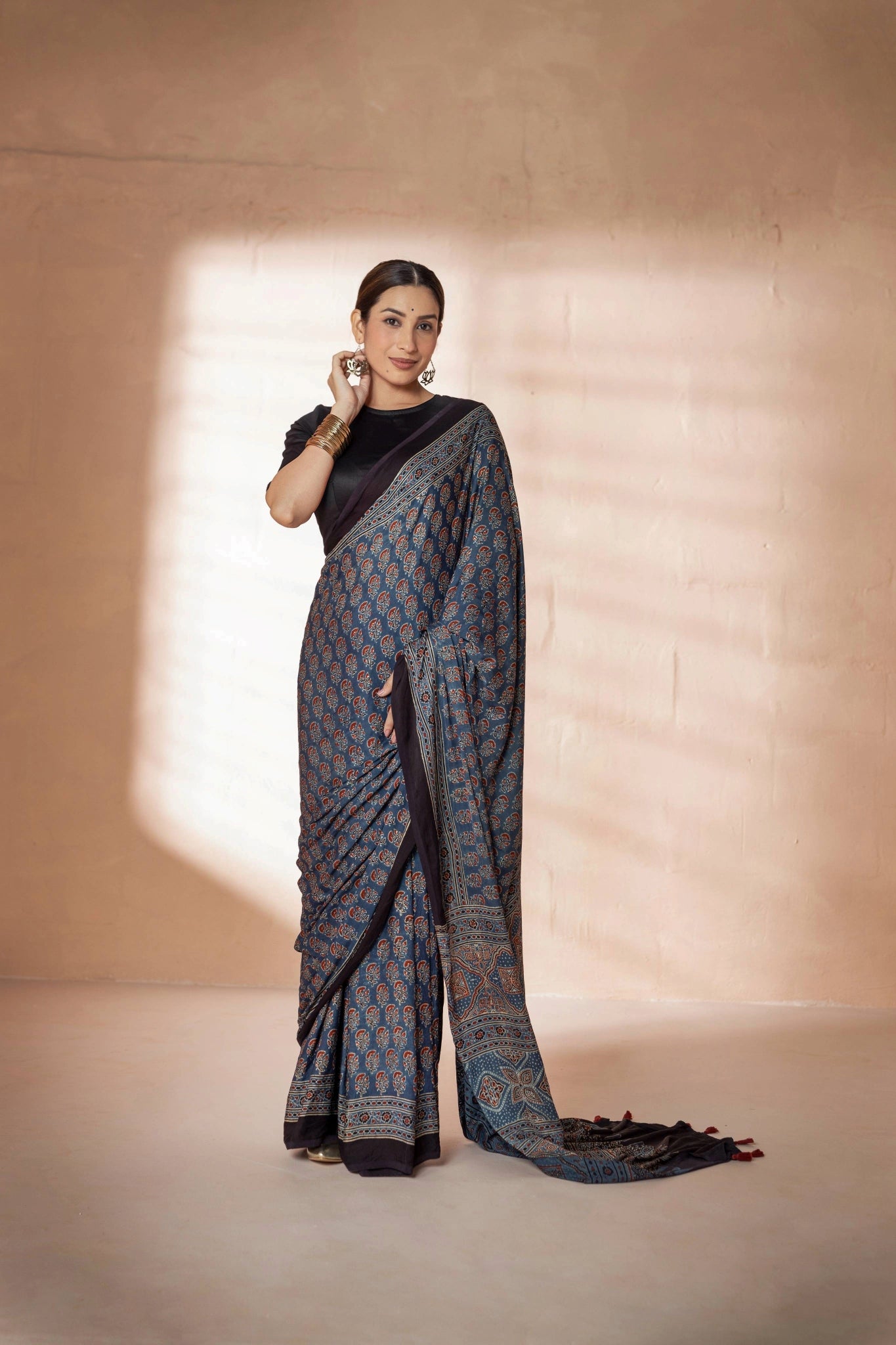 Indigo Modal Silk Ajrakh Hand Block Printed Saree