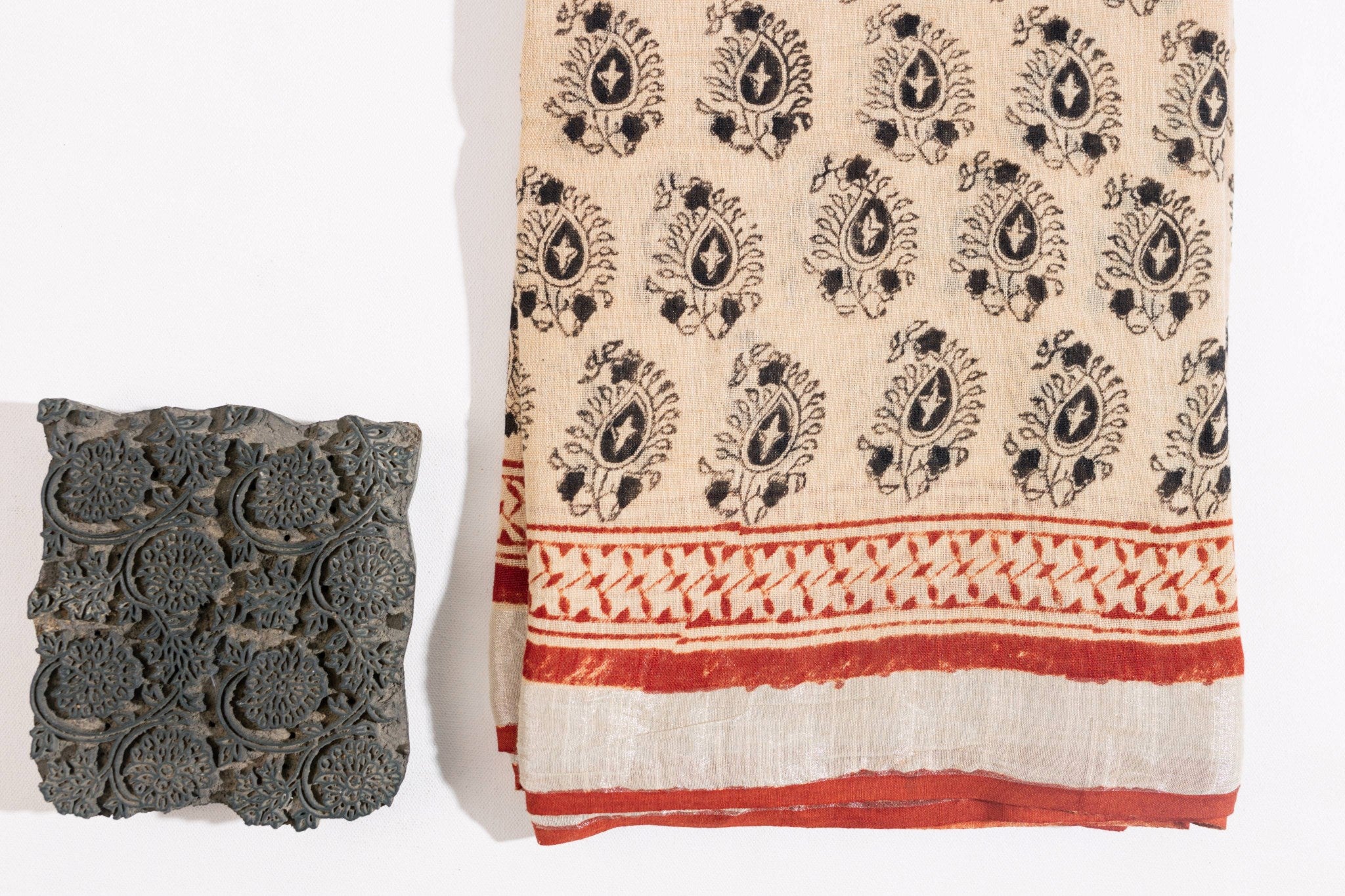 Red Linen Hand Block Saree