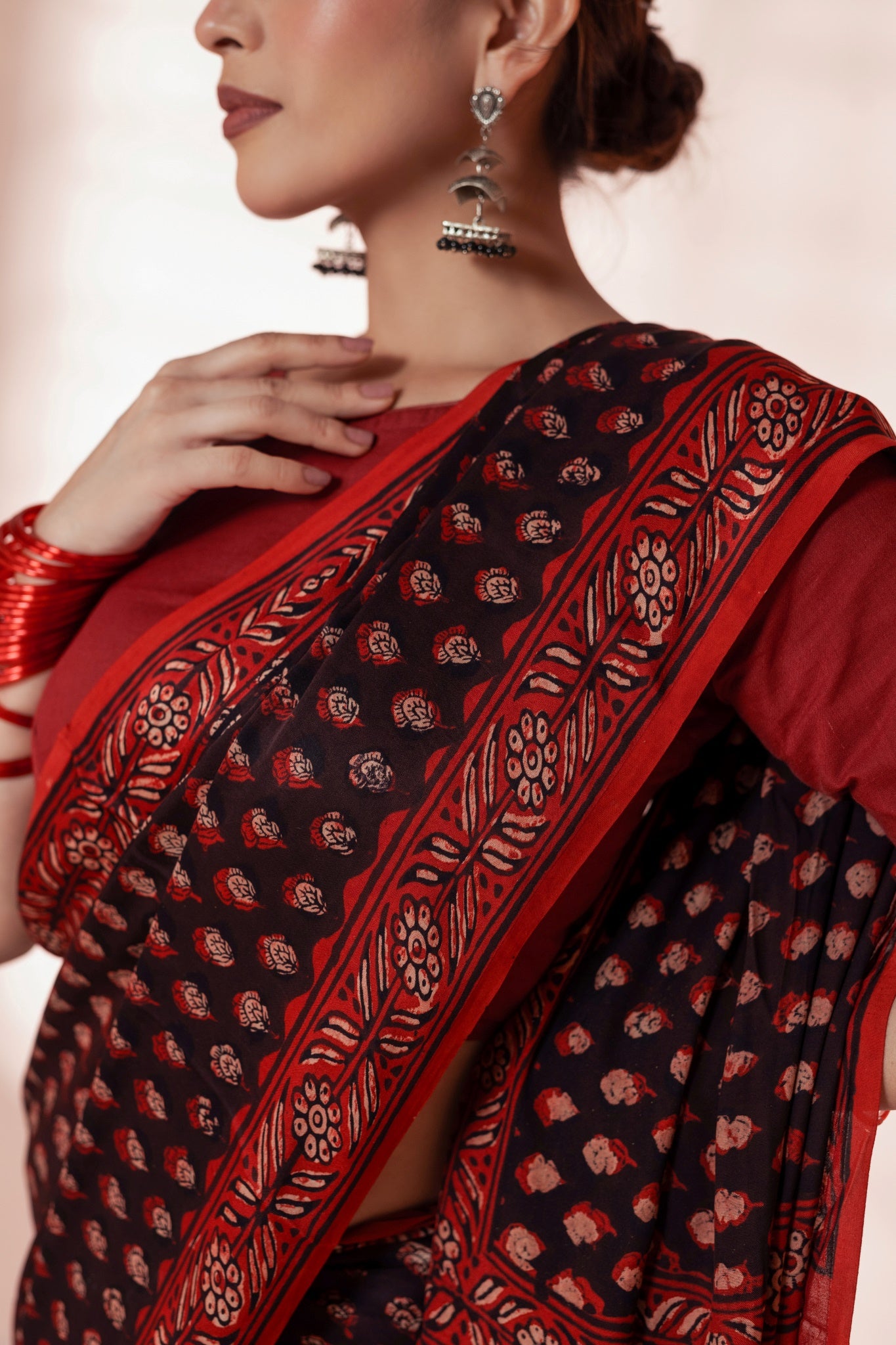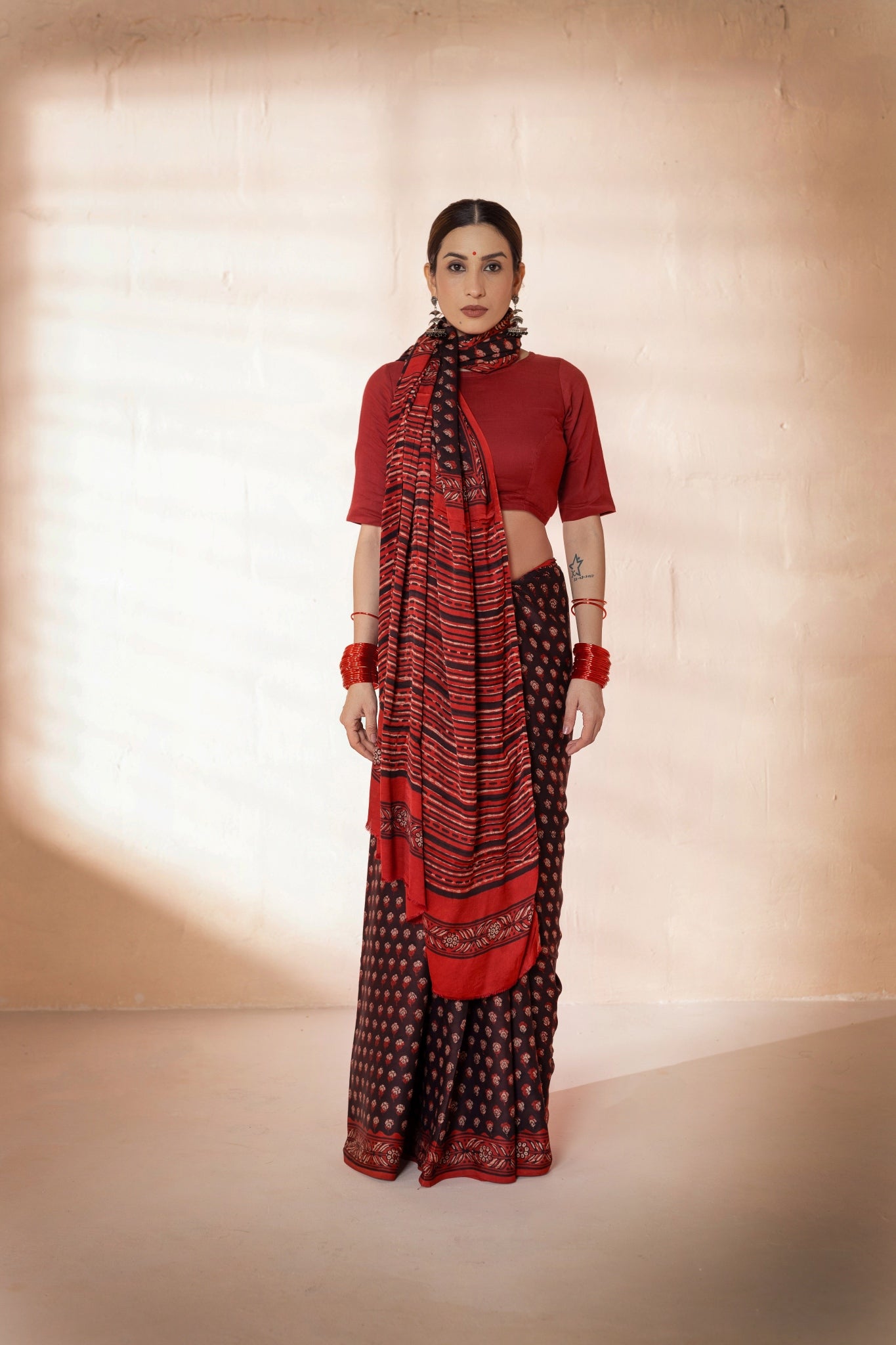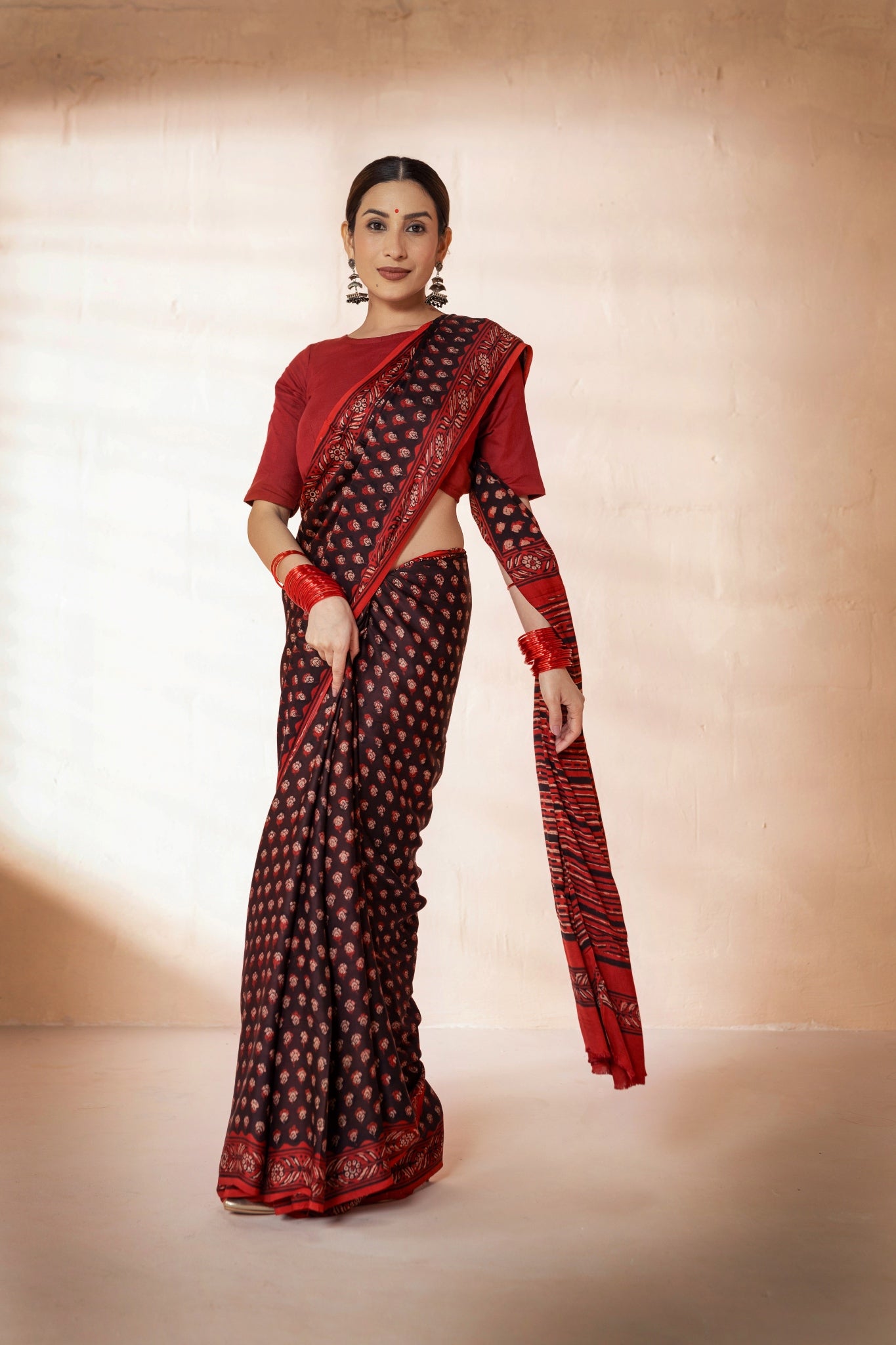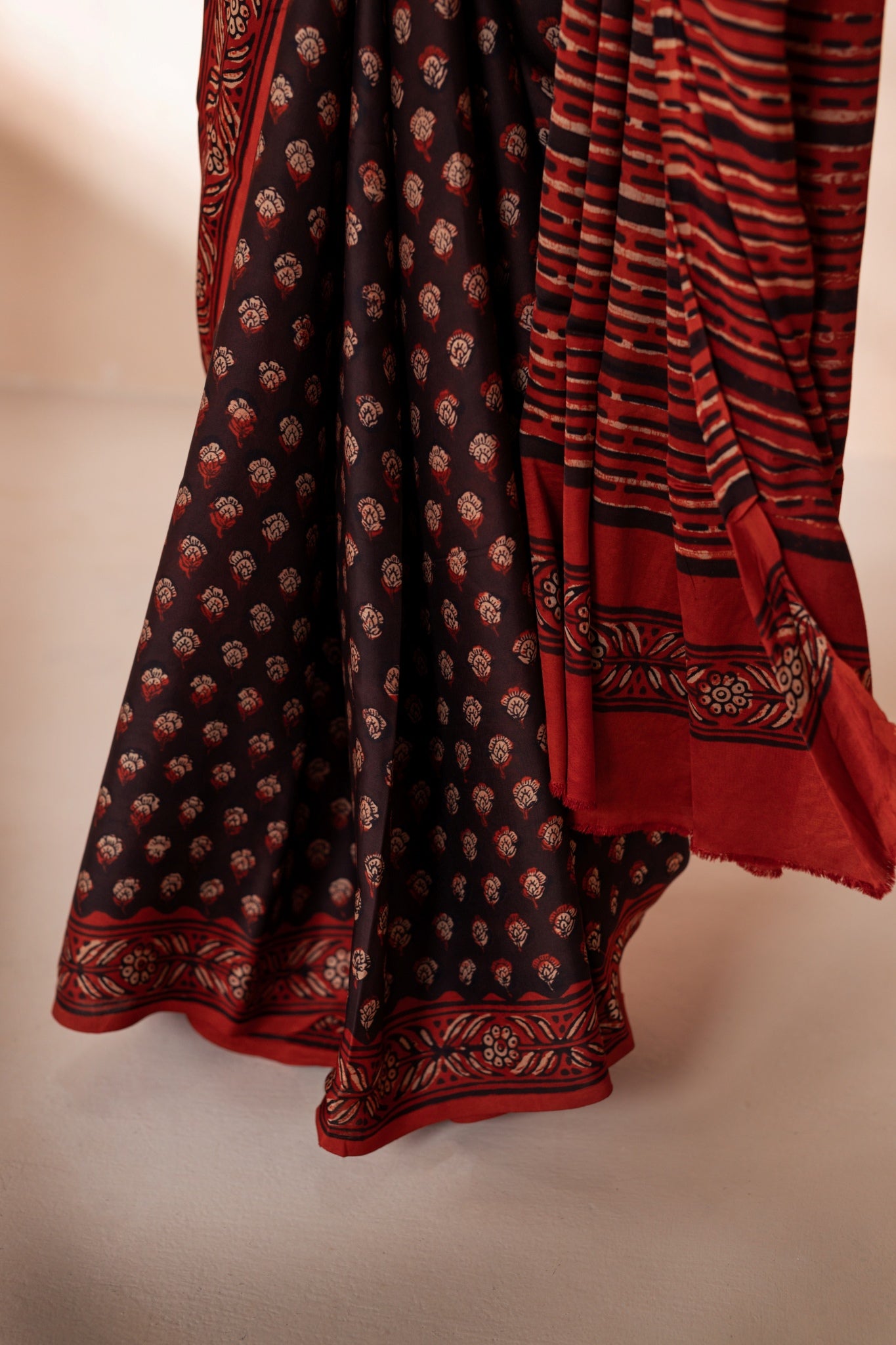 Maroon/Black Modal Silk Bagru Hand Block Printed Saree