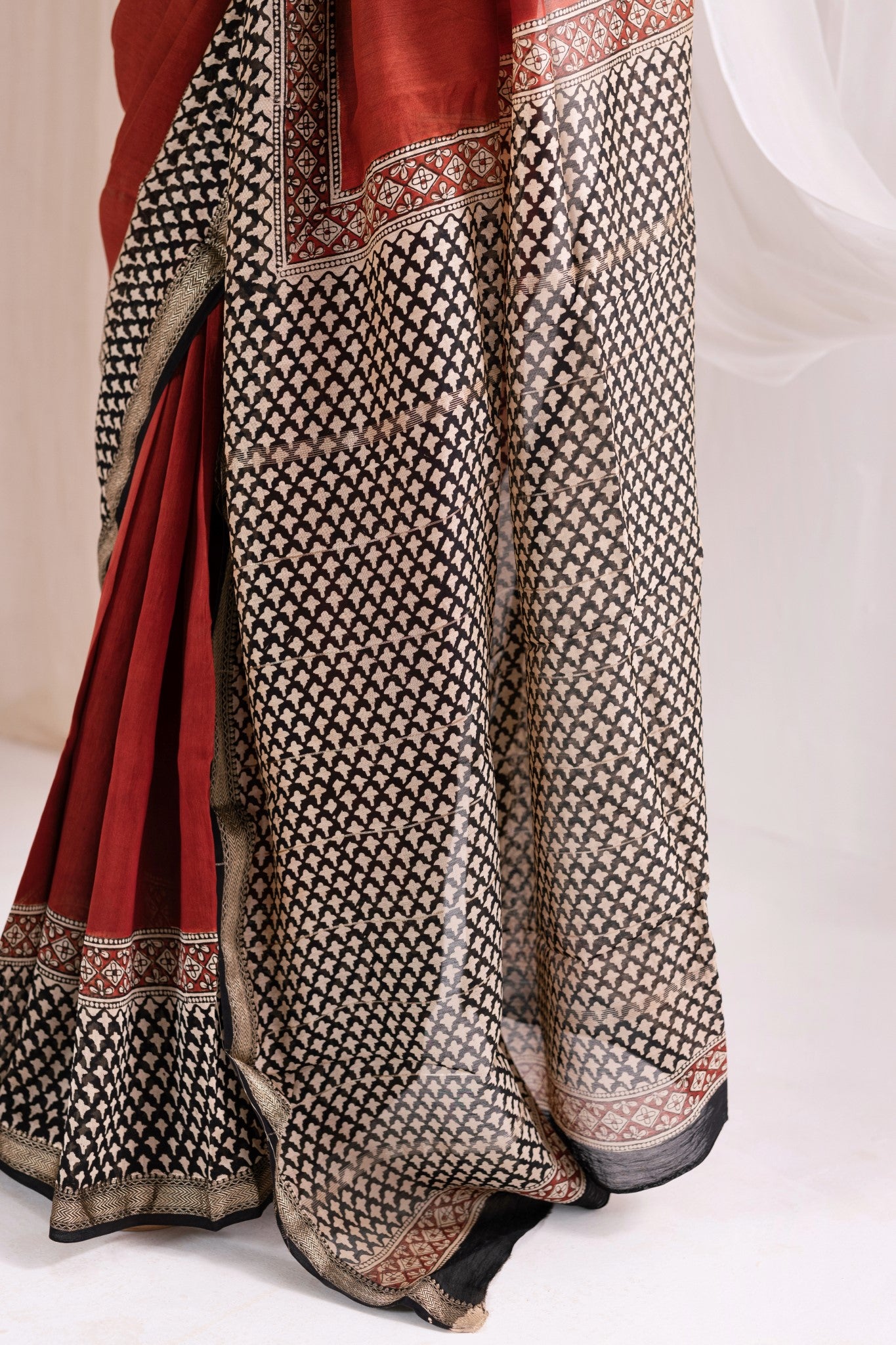 Maroon - Bagru Handblock Printed Maheshwari Silk Saree