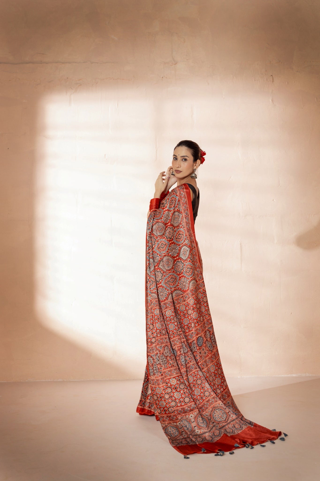Red Modal Silk Ajrakh Hand Block Printed Saree