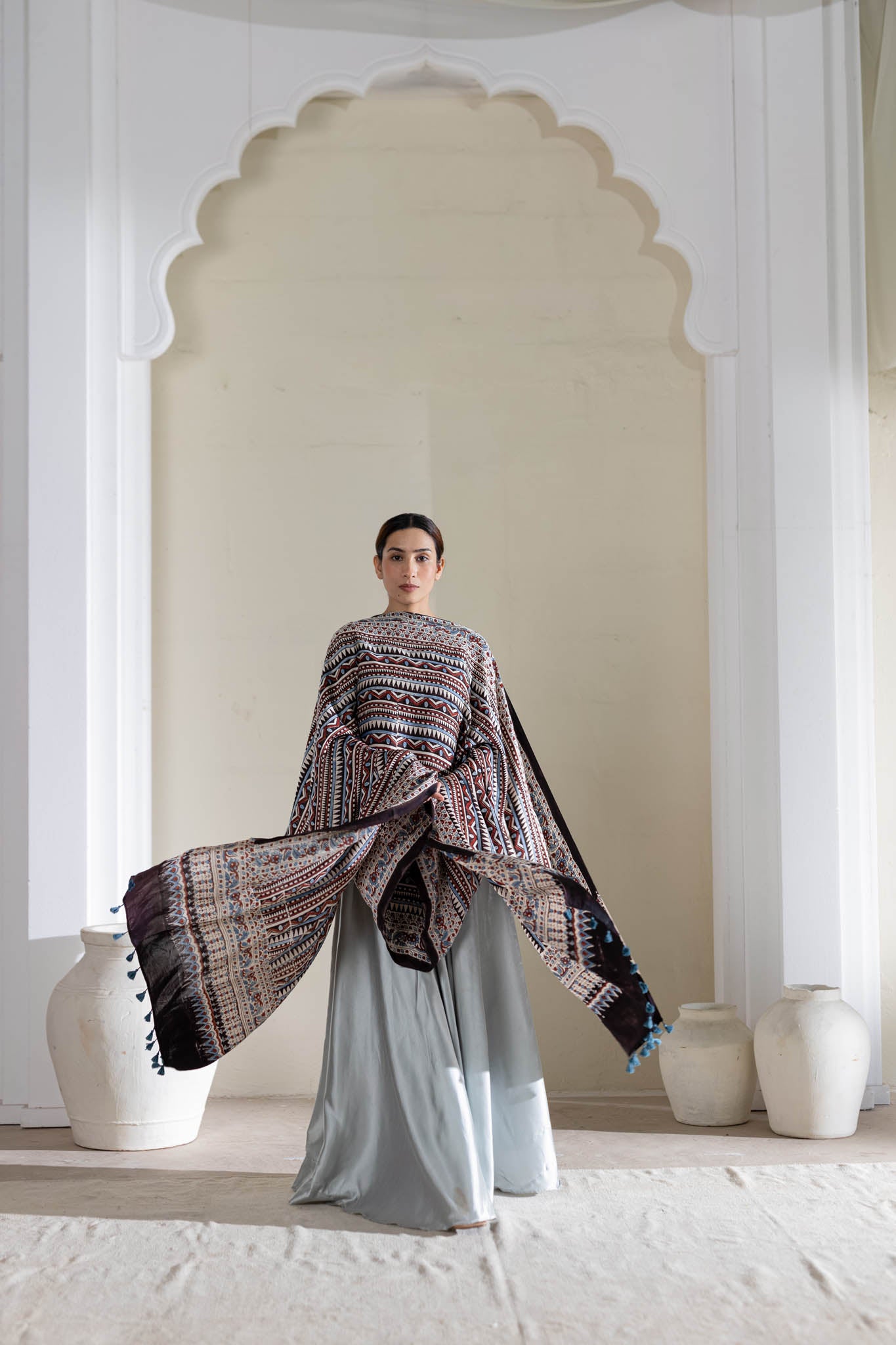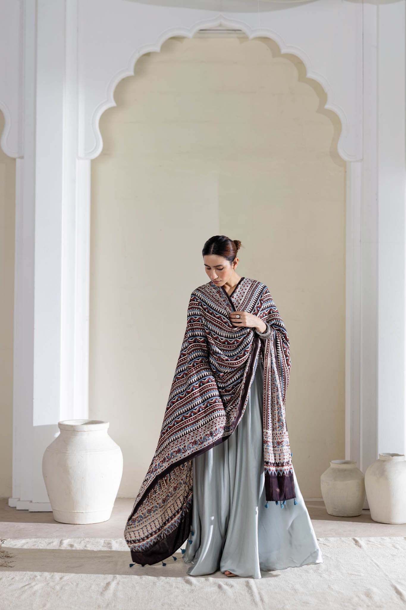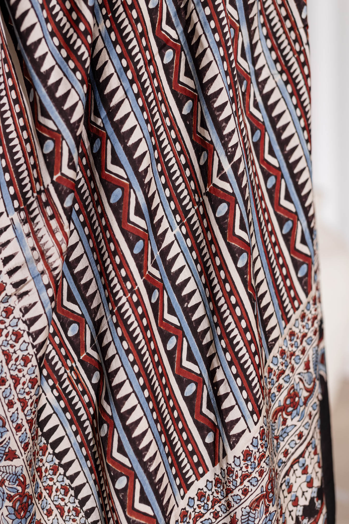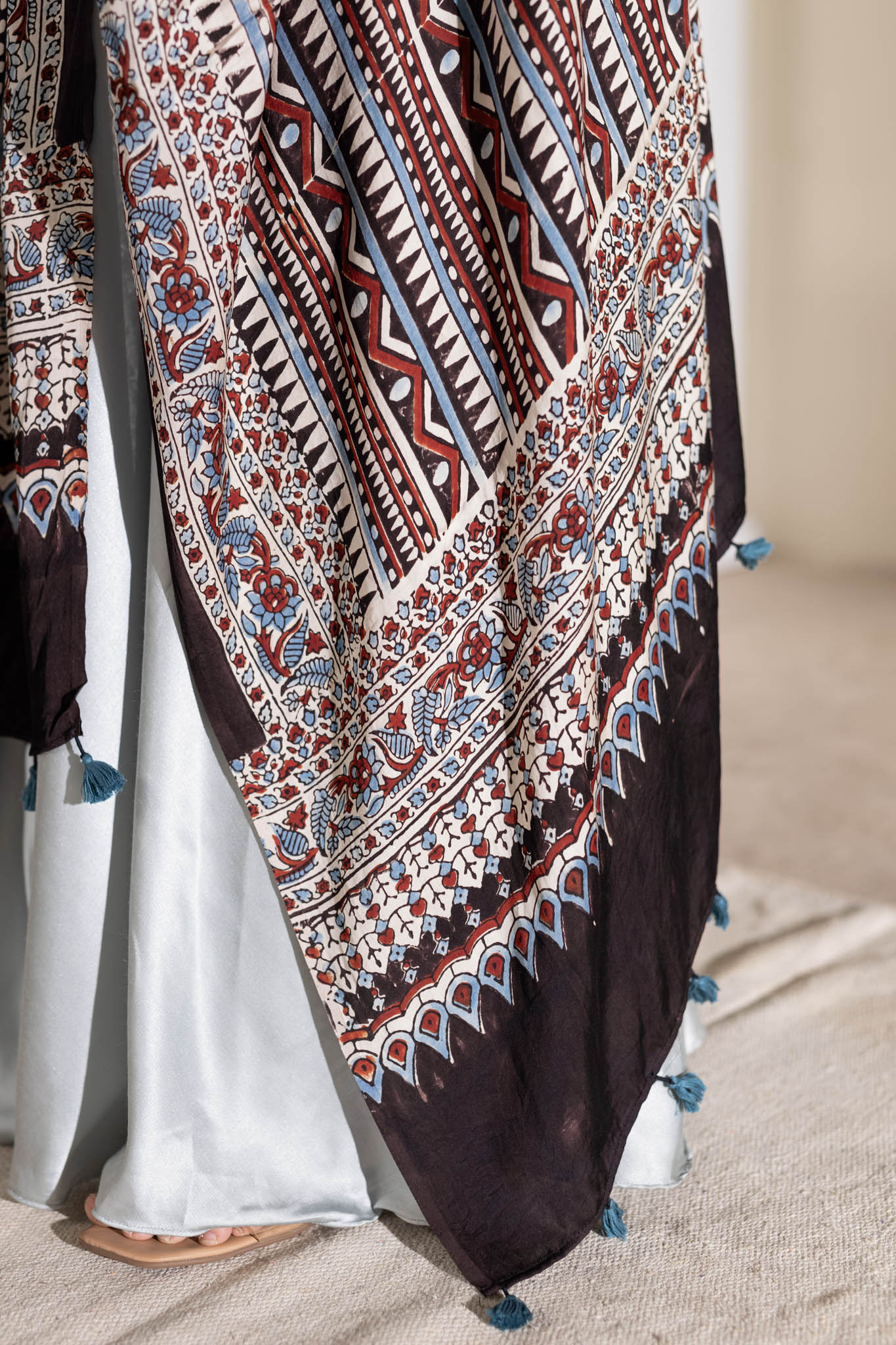 Cream/Maroon/Blue - Modal Silk Ajrakh Hand Block Dupatta