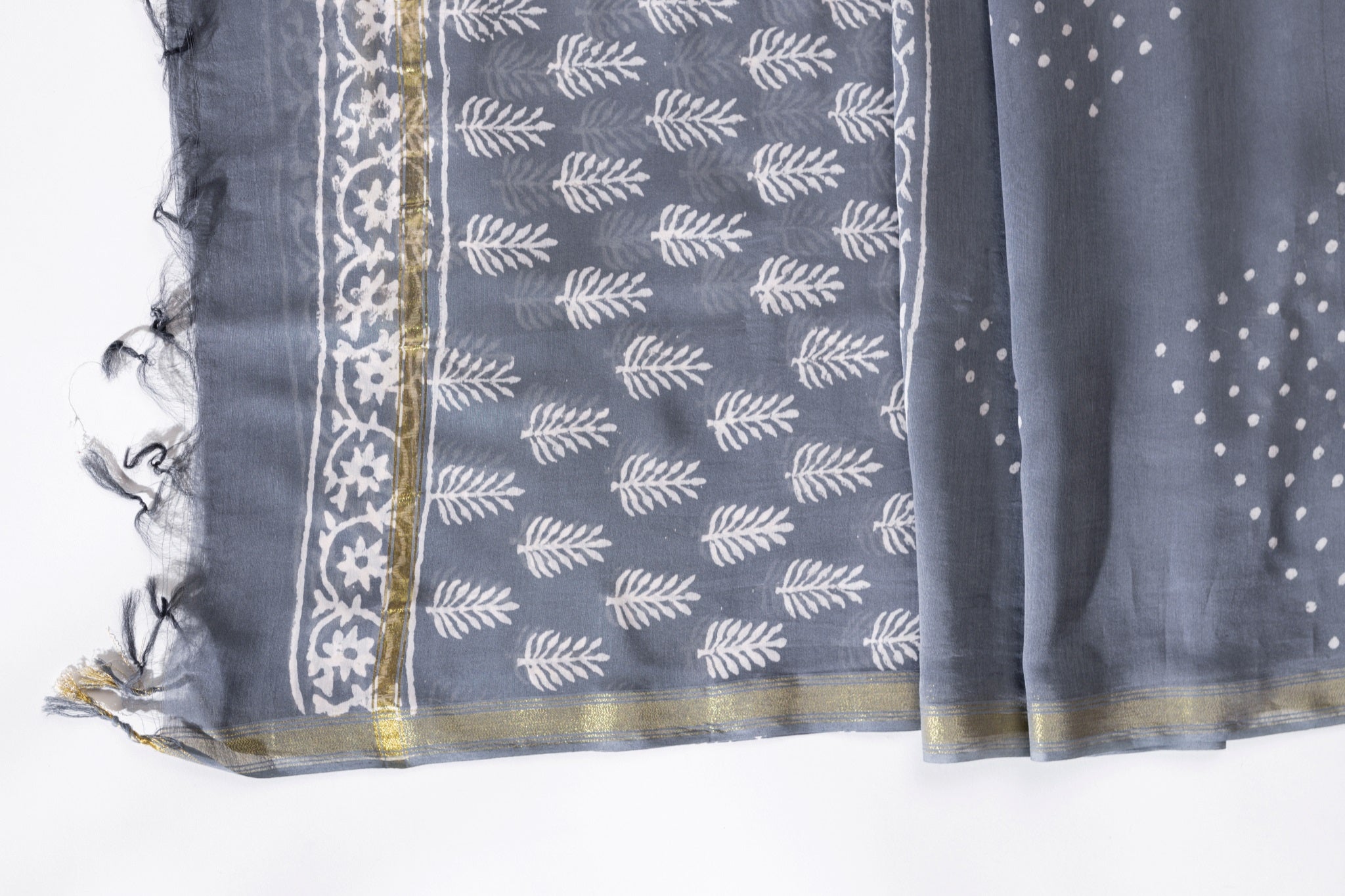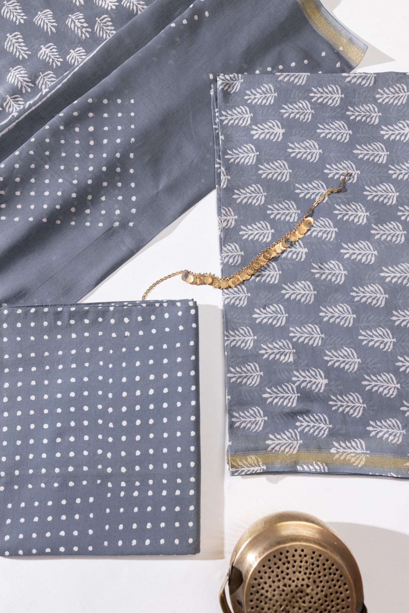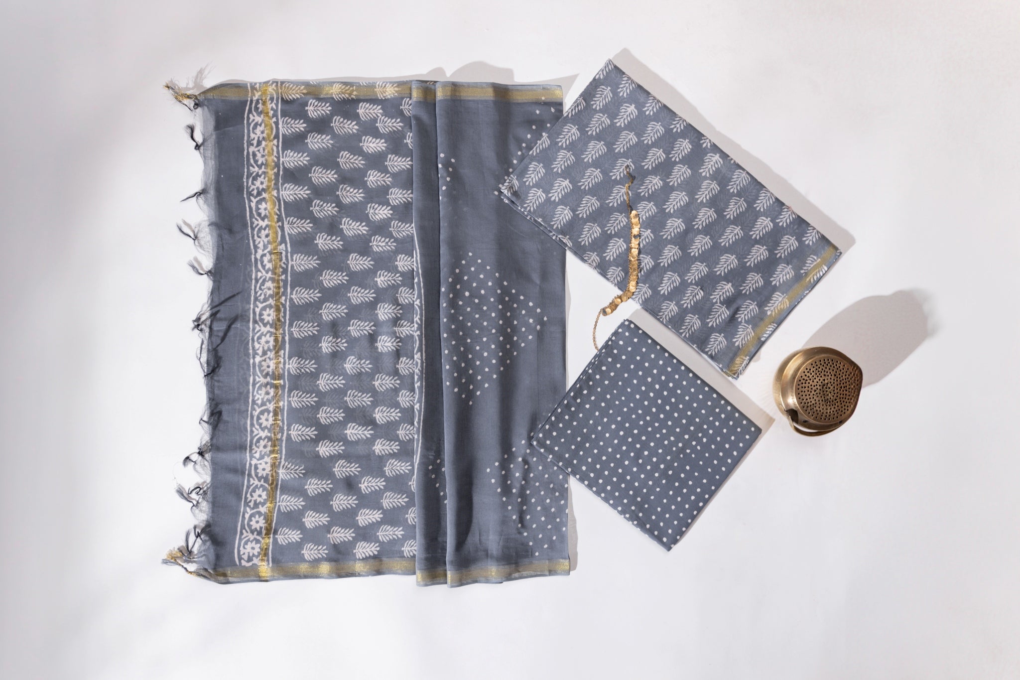 Pure Chanderi Silk Hand Block Printed 3 PC Suit - Grey