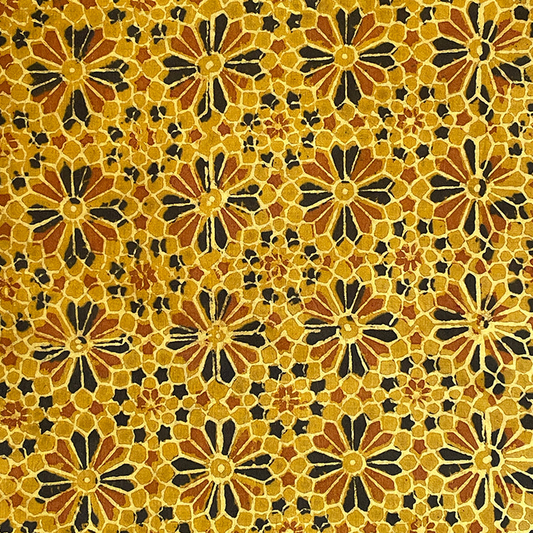 Pure Cotton Hand Block Ajrakh Printed Fabric - Floral Geometrical - Mustard Yellow
