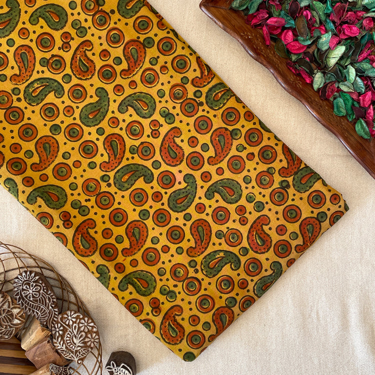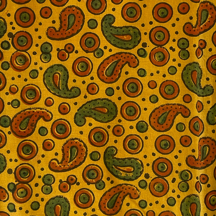 Pure Cotton Hand Block Ajrakh Printed Fabric - Small Mango/Circle - Mustard Yellow