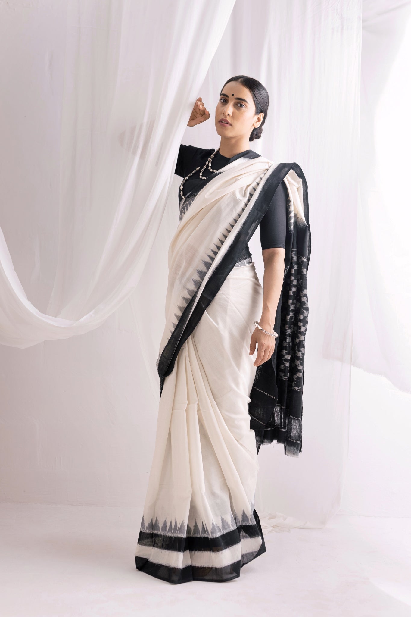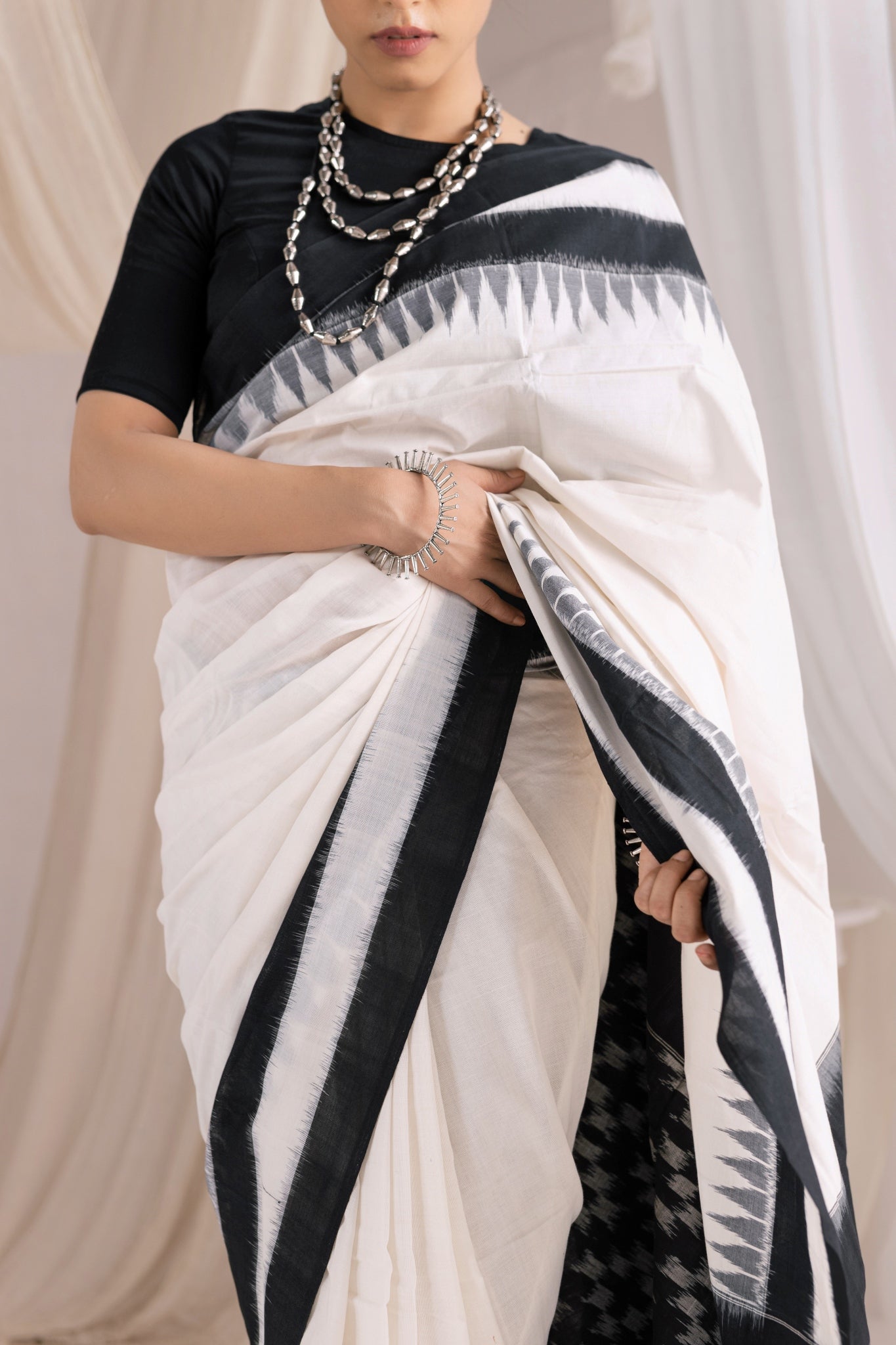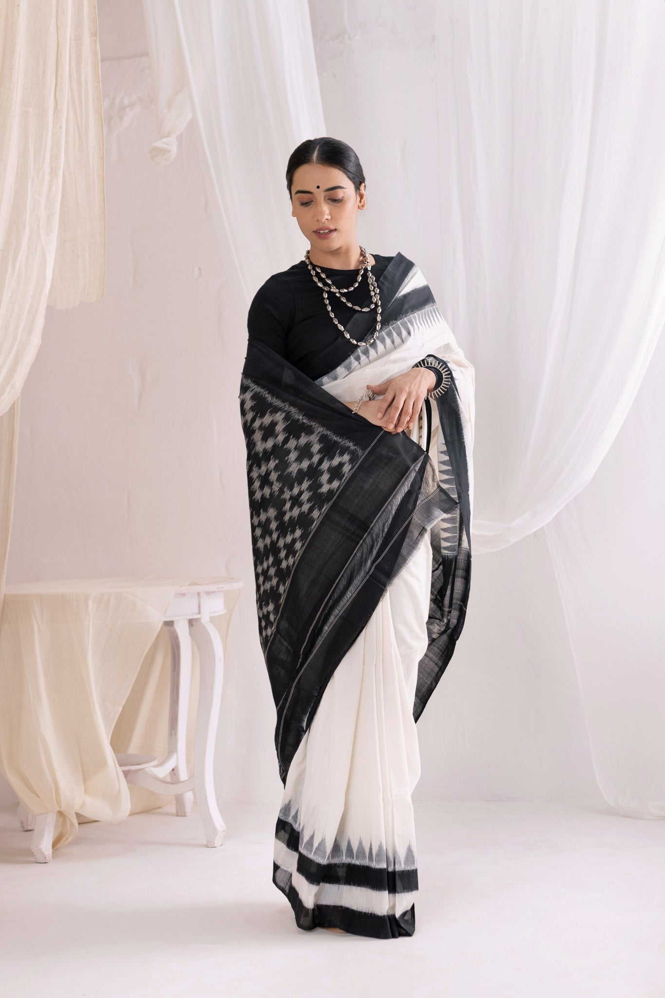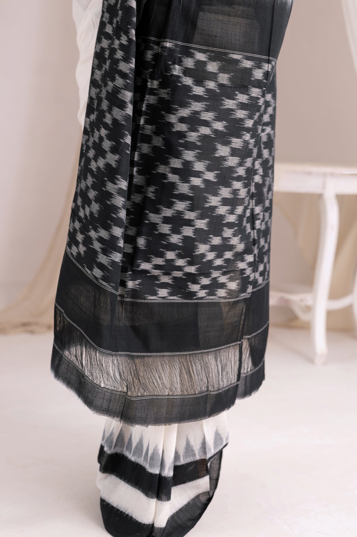 Pochampally Double Ikat Cotton Handloom Saree - Black/White