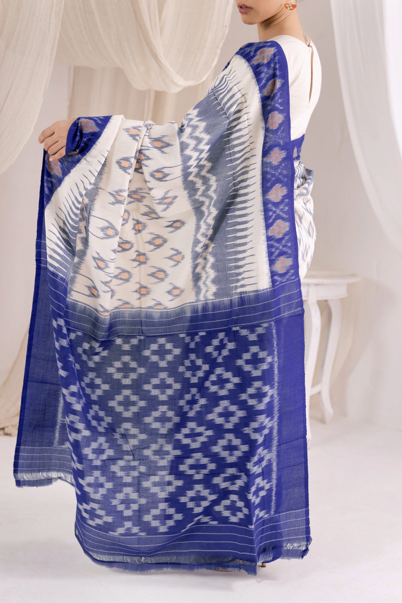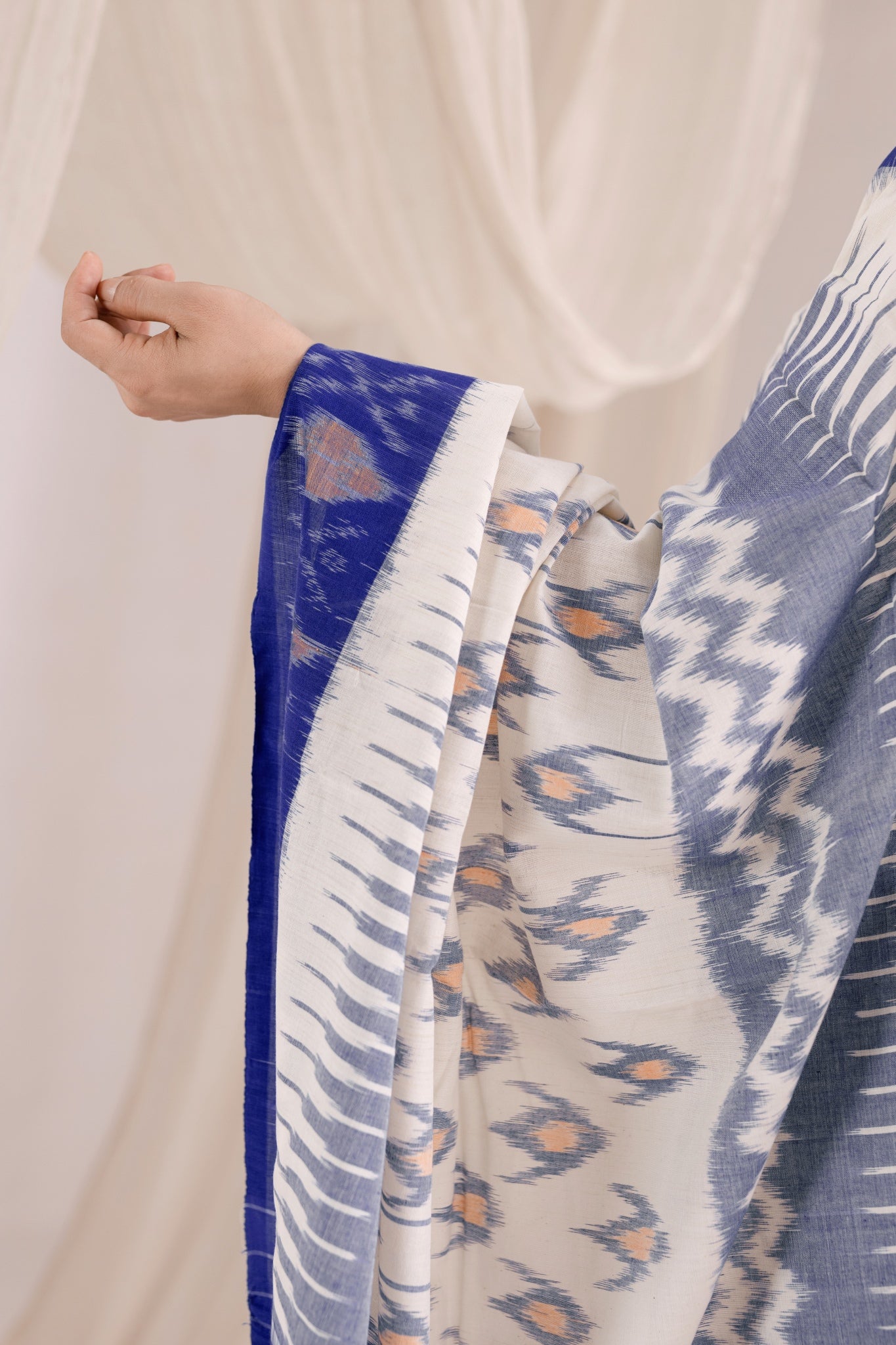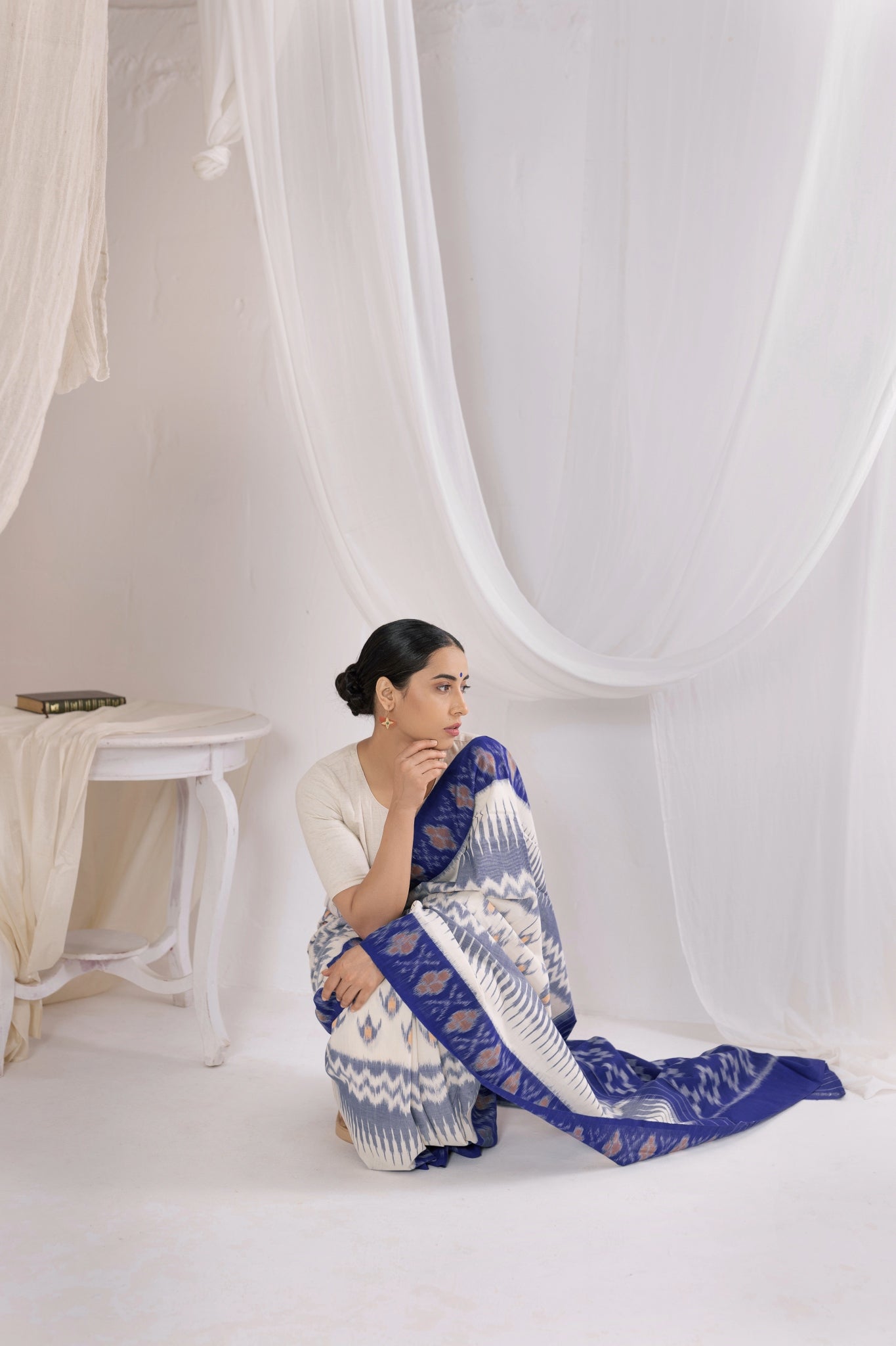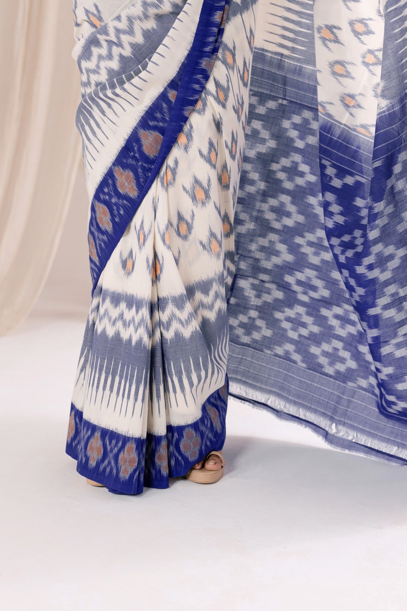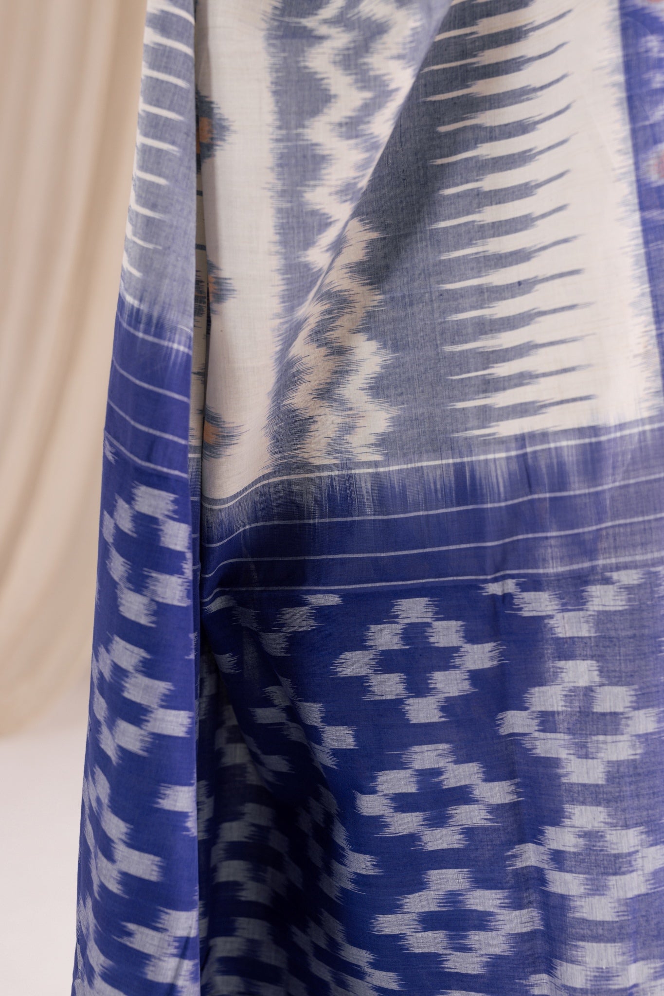 Pochampally Double Ikat Cotton Handloom Saree - Blue/White
