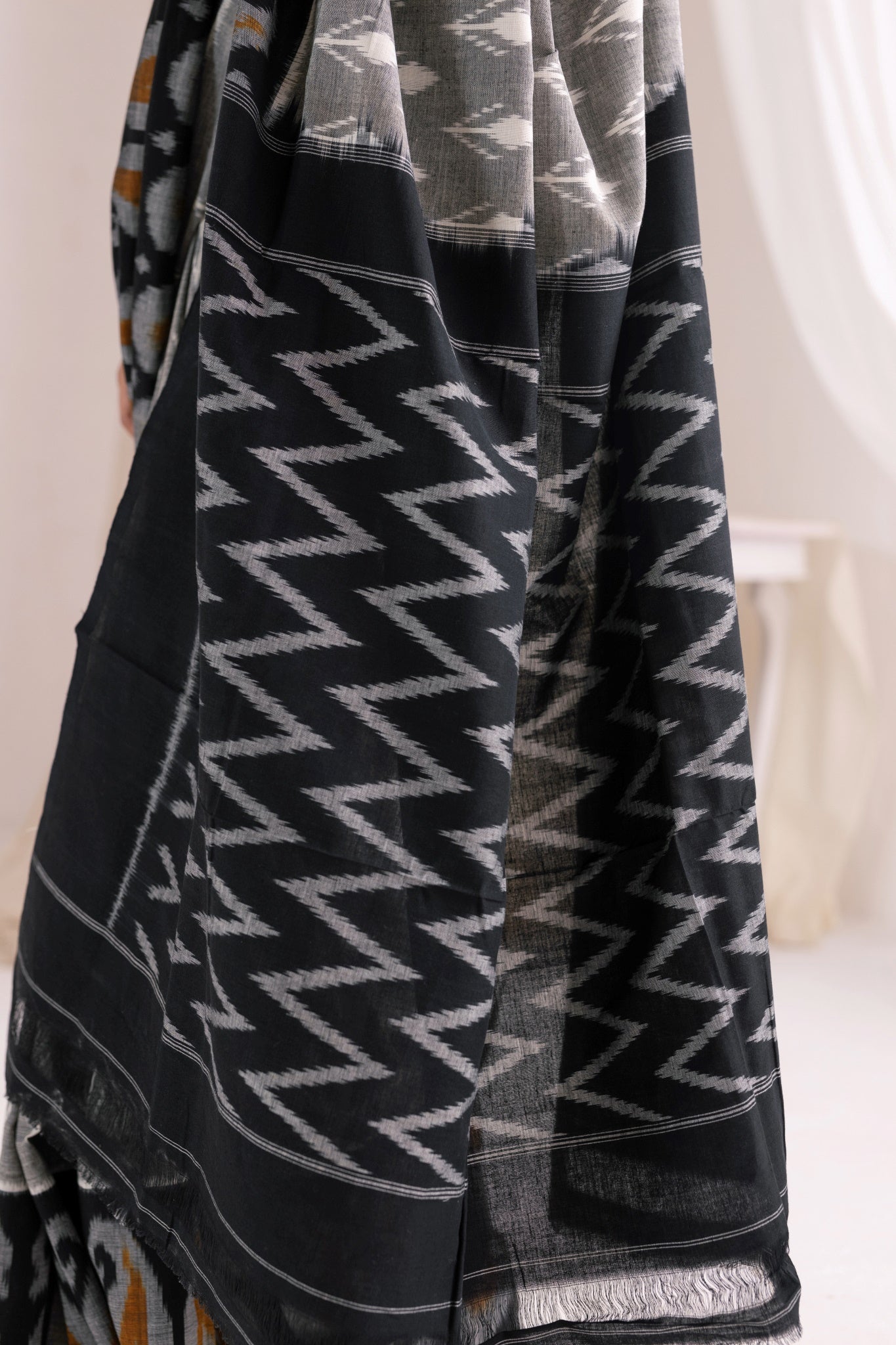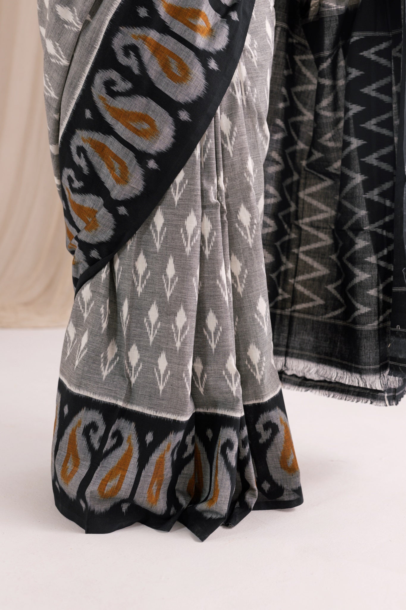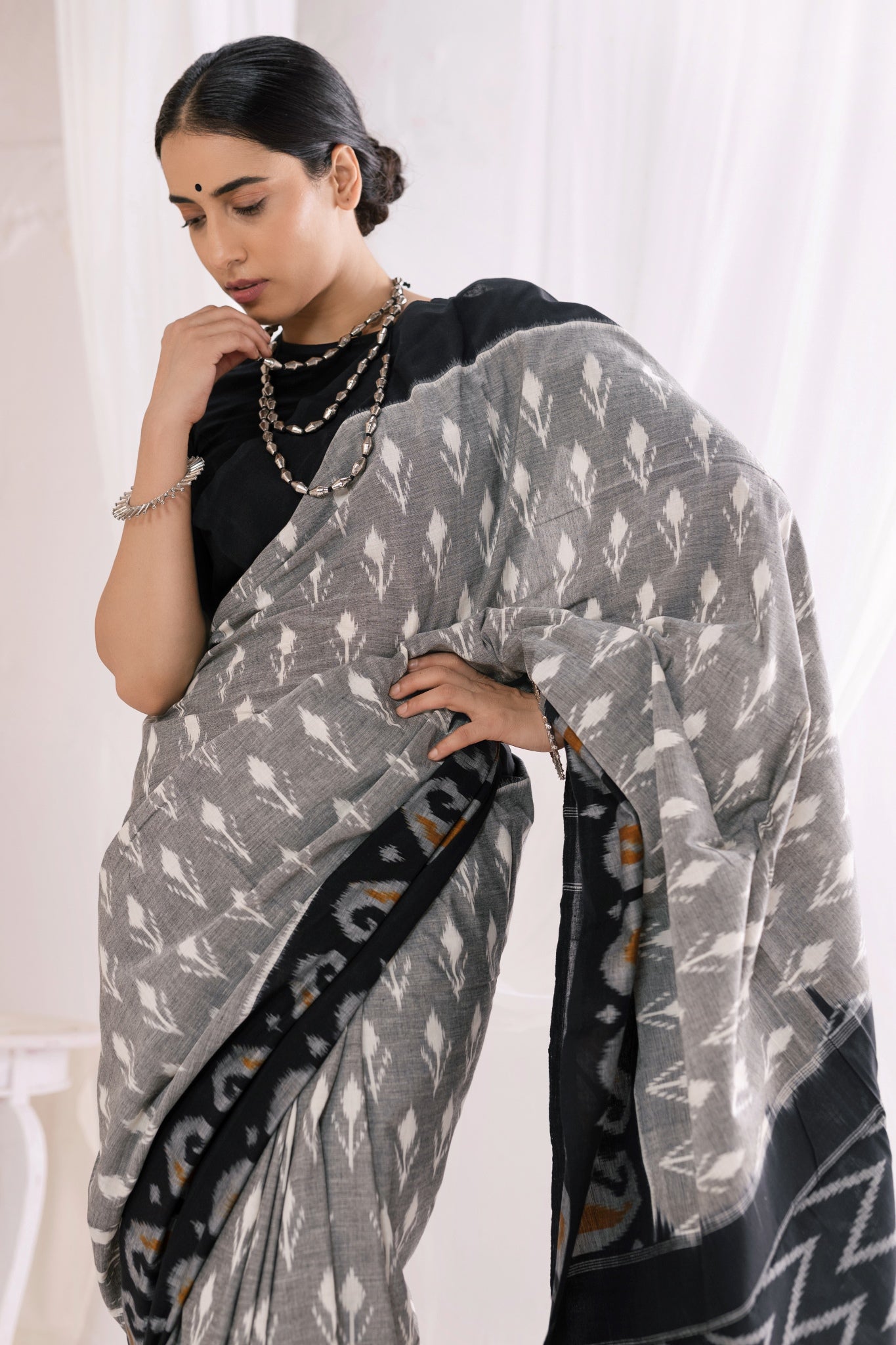 Pochampally Double Ikat Cotton Handloom Saree - Grey/Black