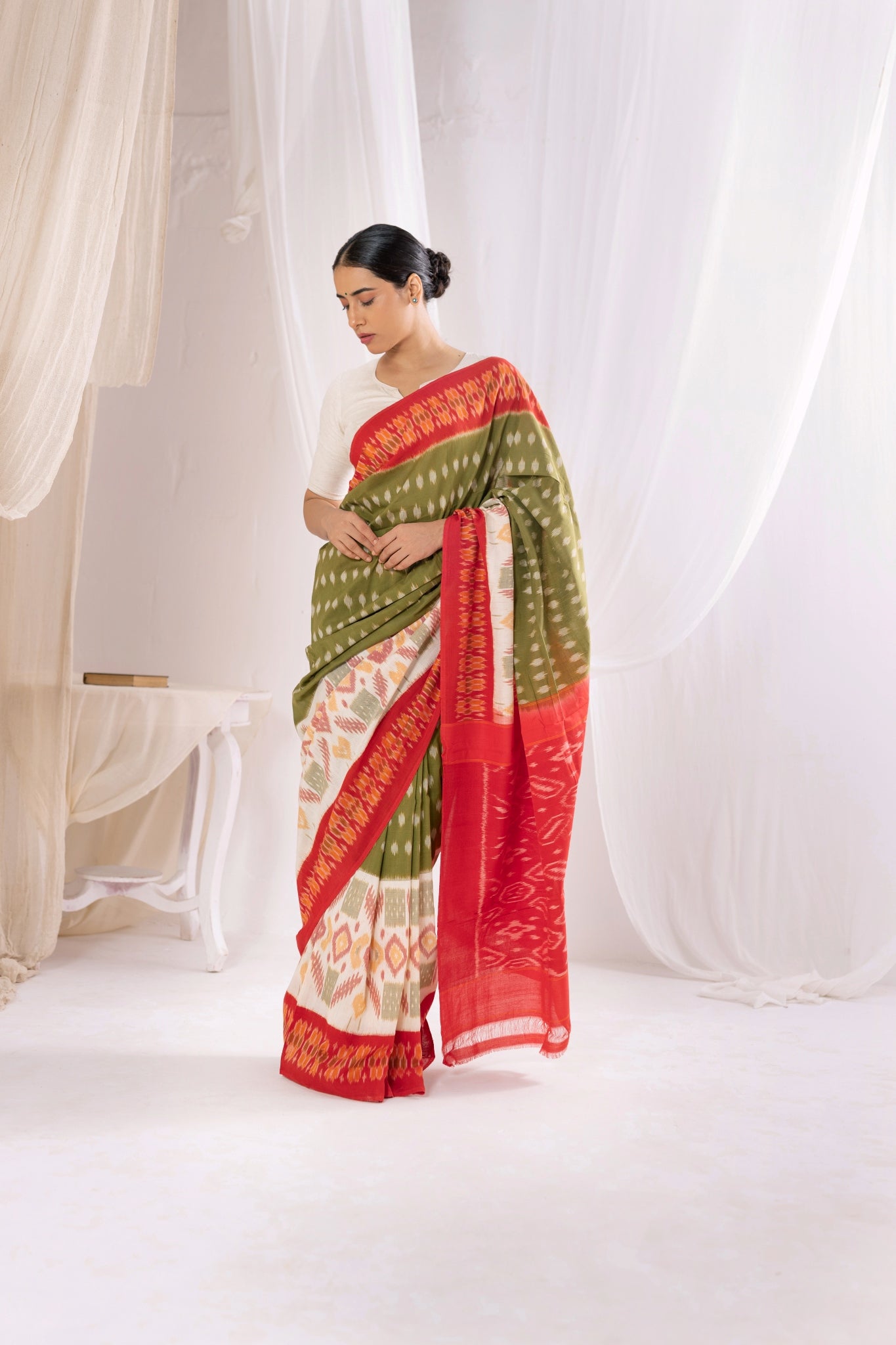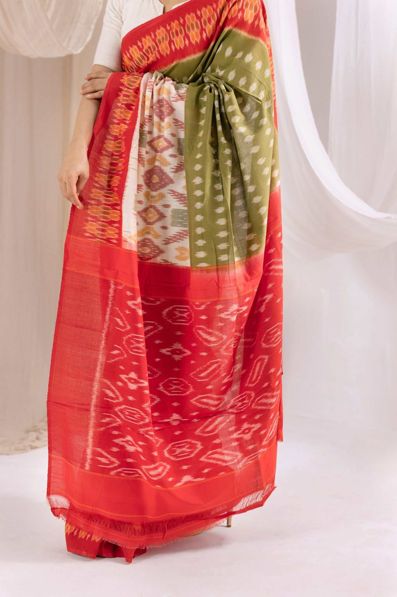 Pochampally Double Ikat Cotton Handloom Saree - Moss Green/Red