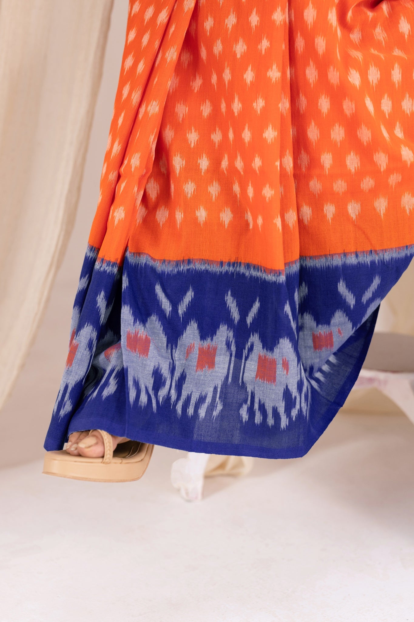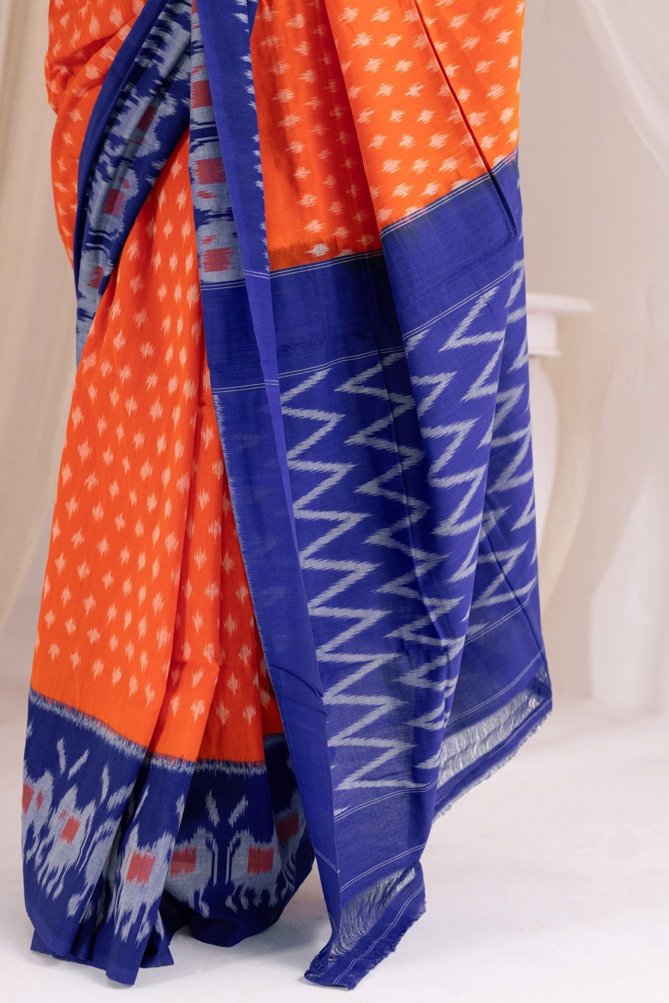 Pochampally Double Ikat Cotton Handloom Saree - Orange/Blue