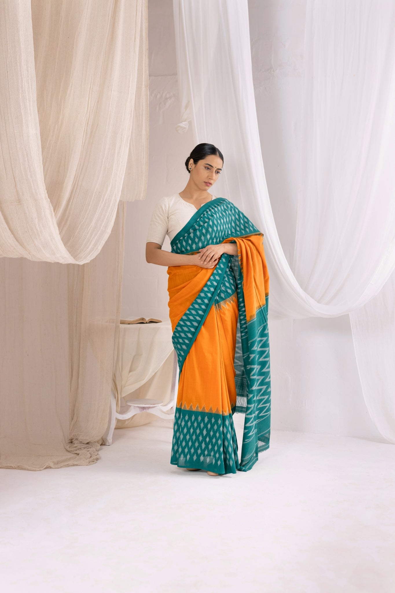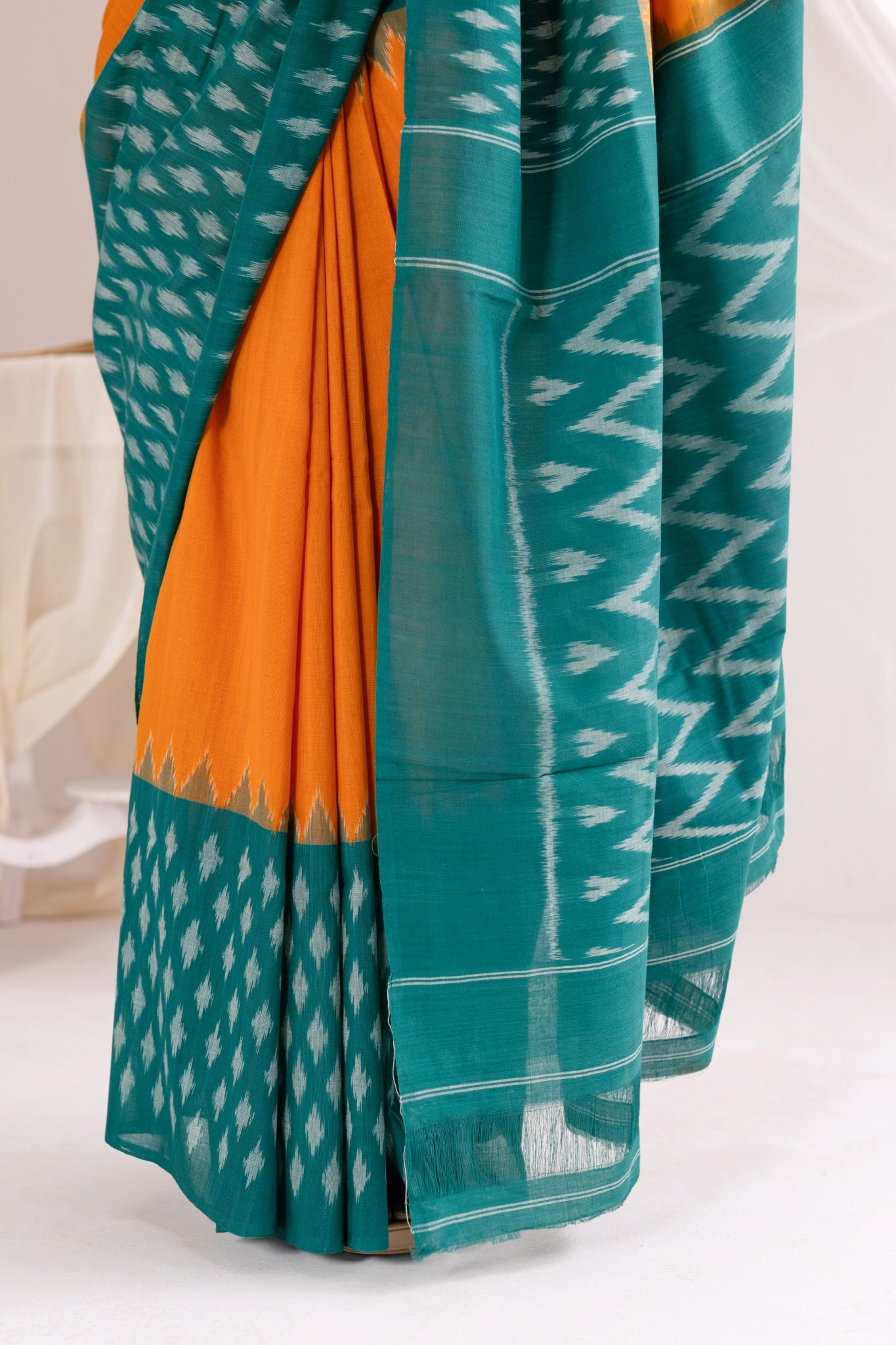 Pochampally Double Ikat Cotton Handloom Saree - Teal/Yellow