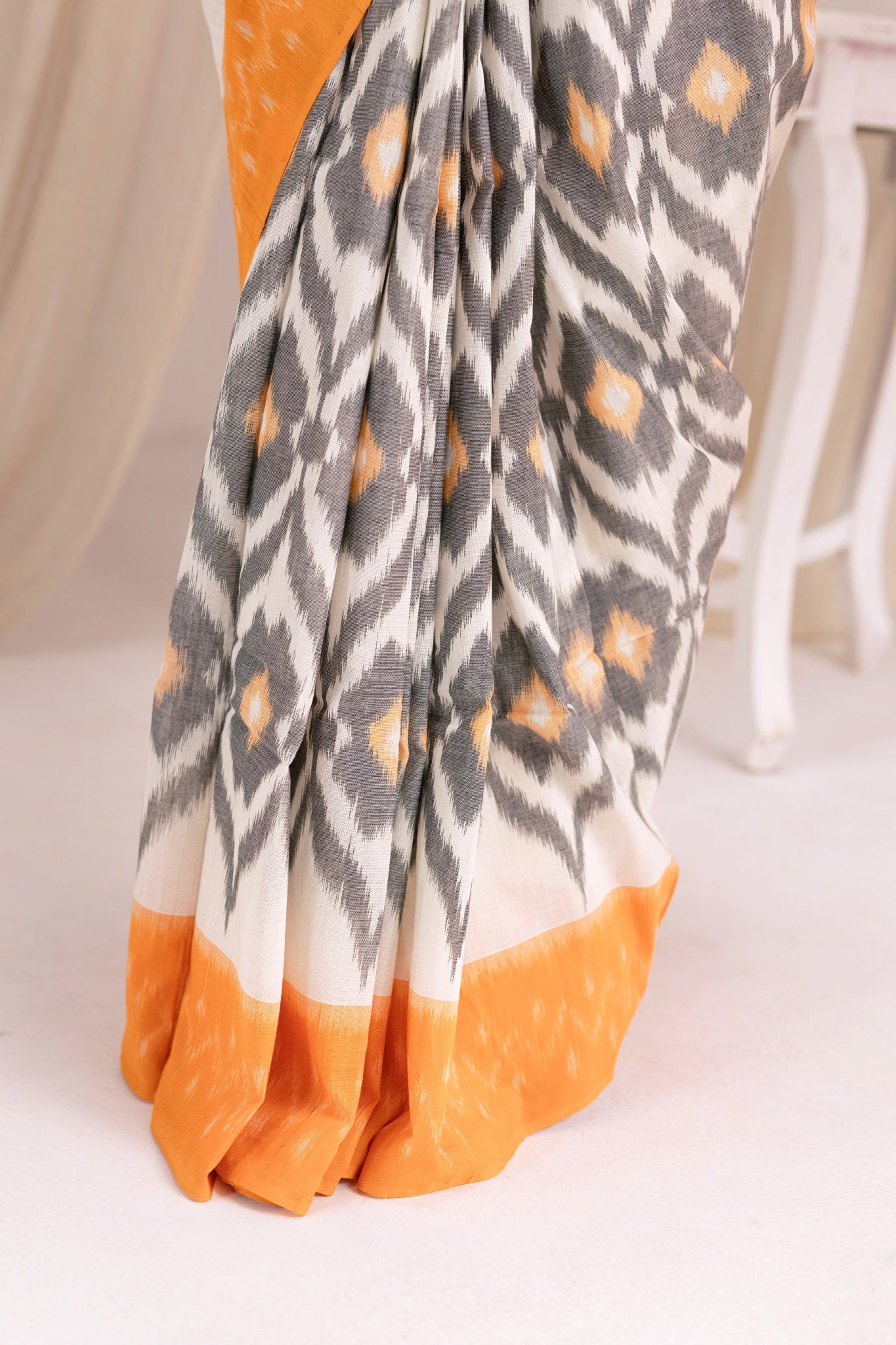 Pochampally Double Ikat Cotton Handloom Saree - Yellow/Grey