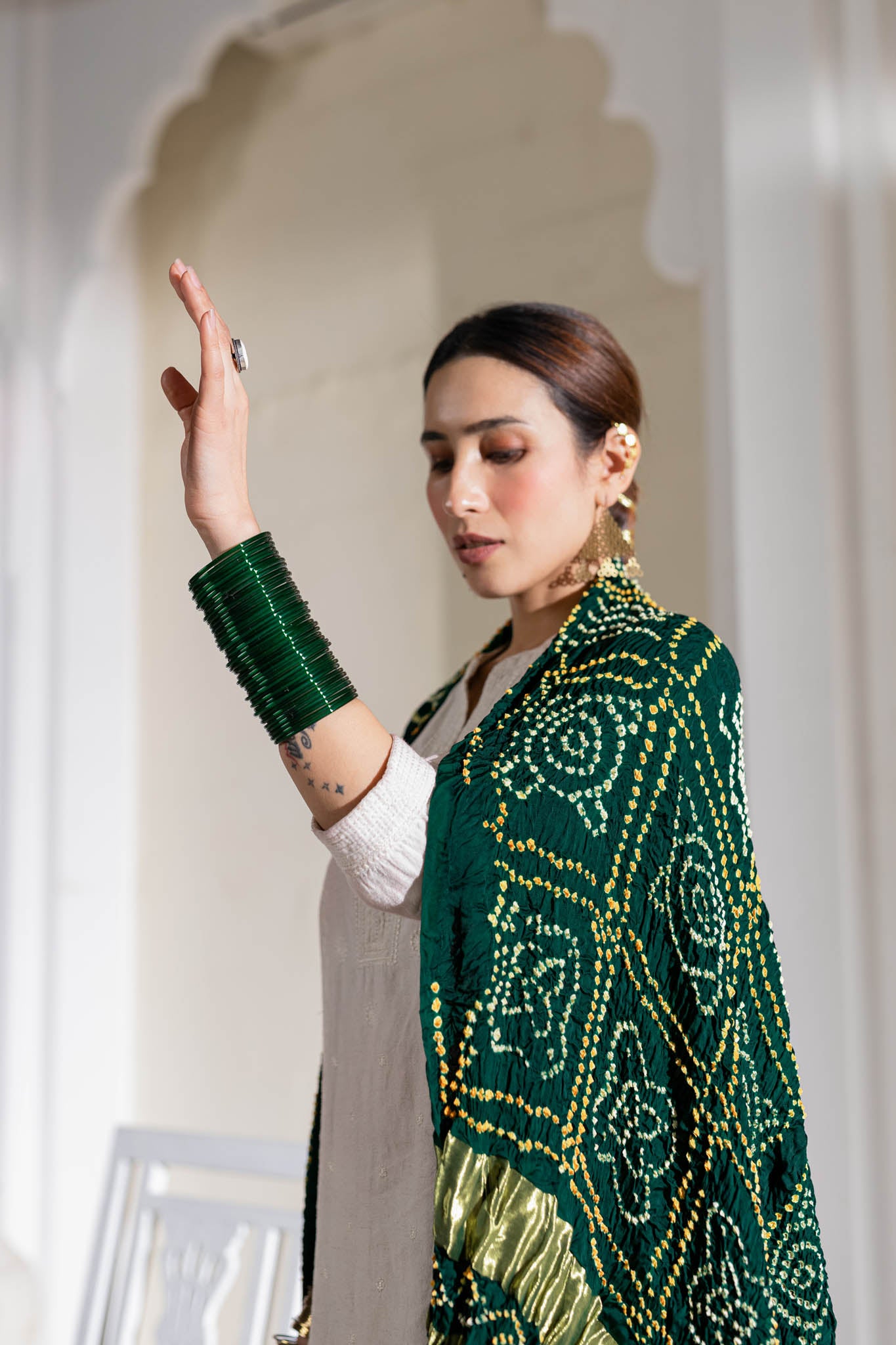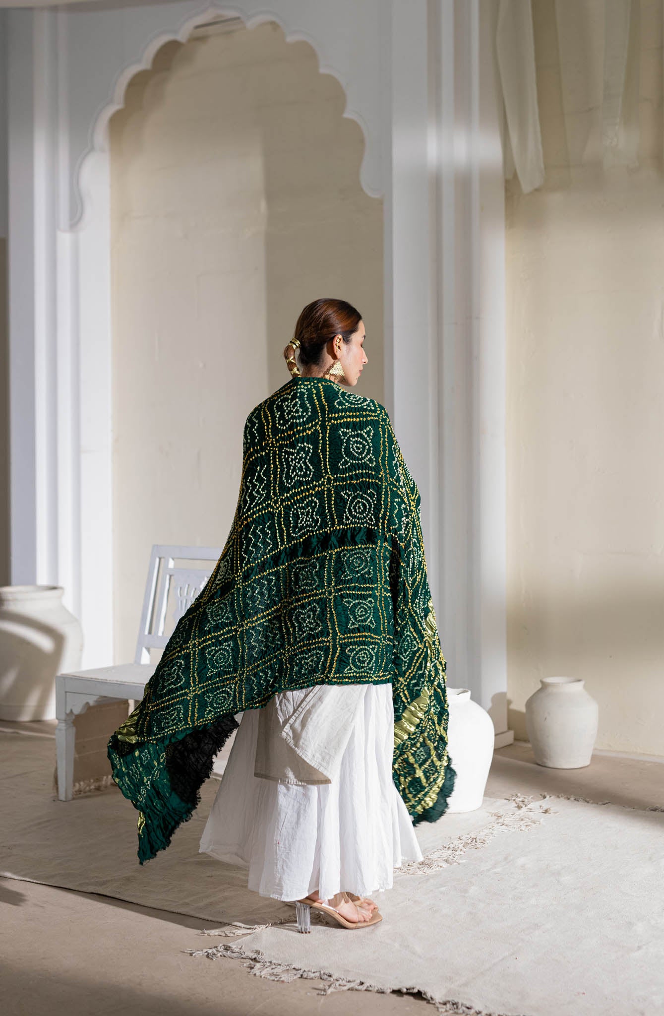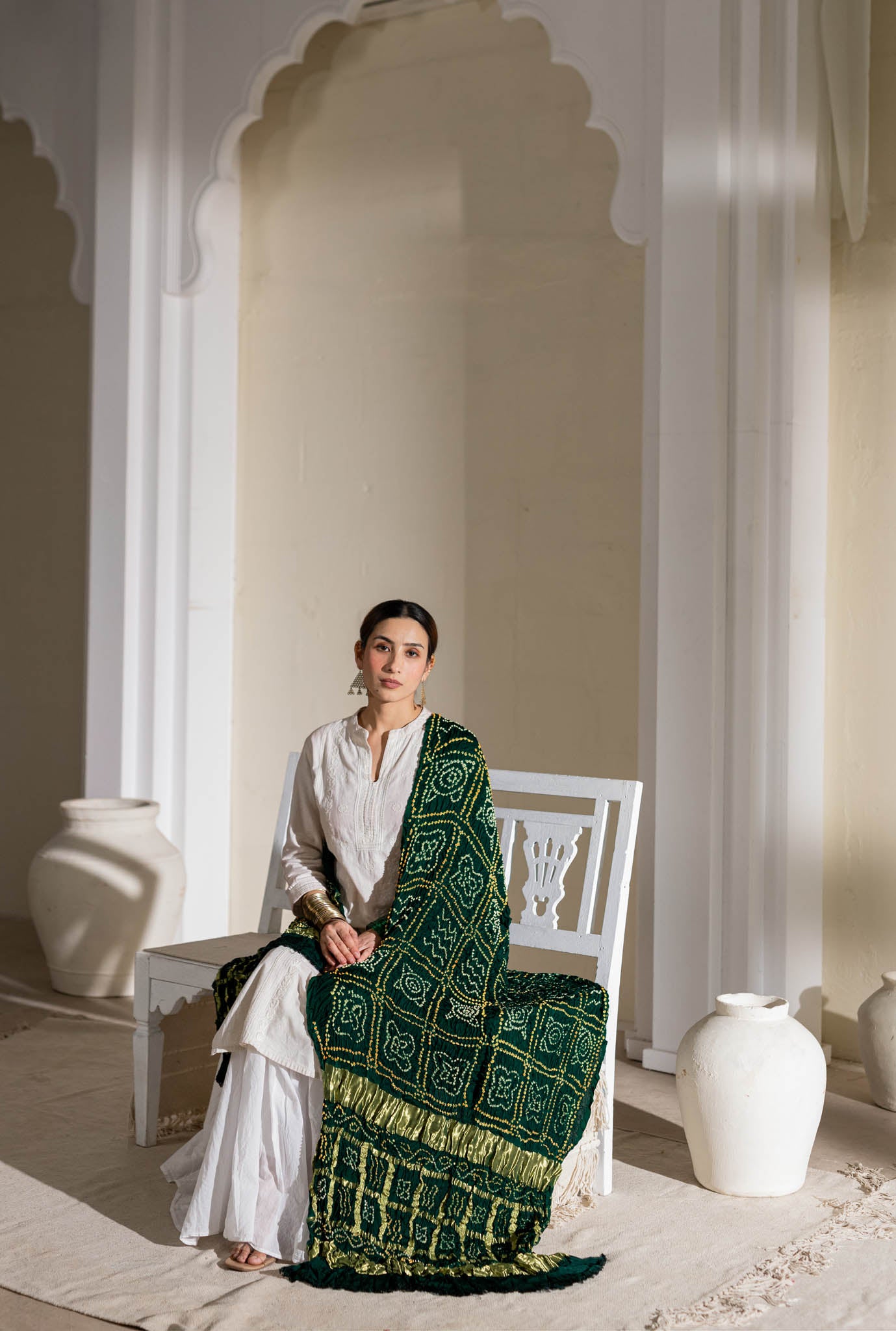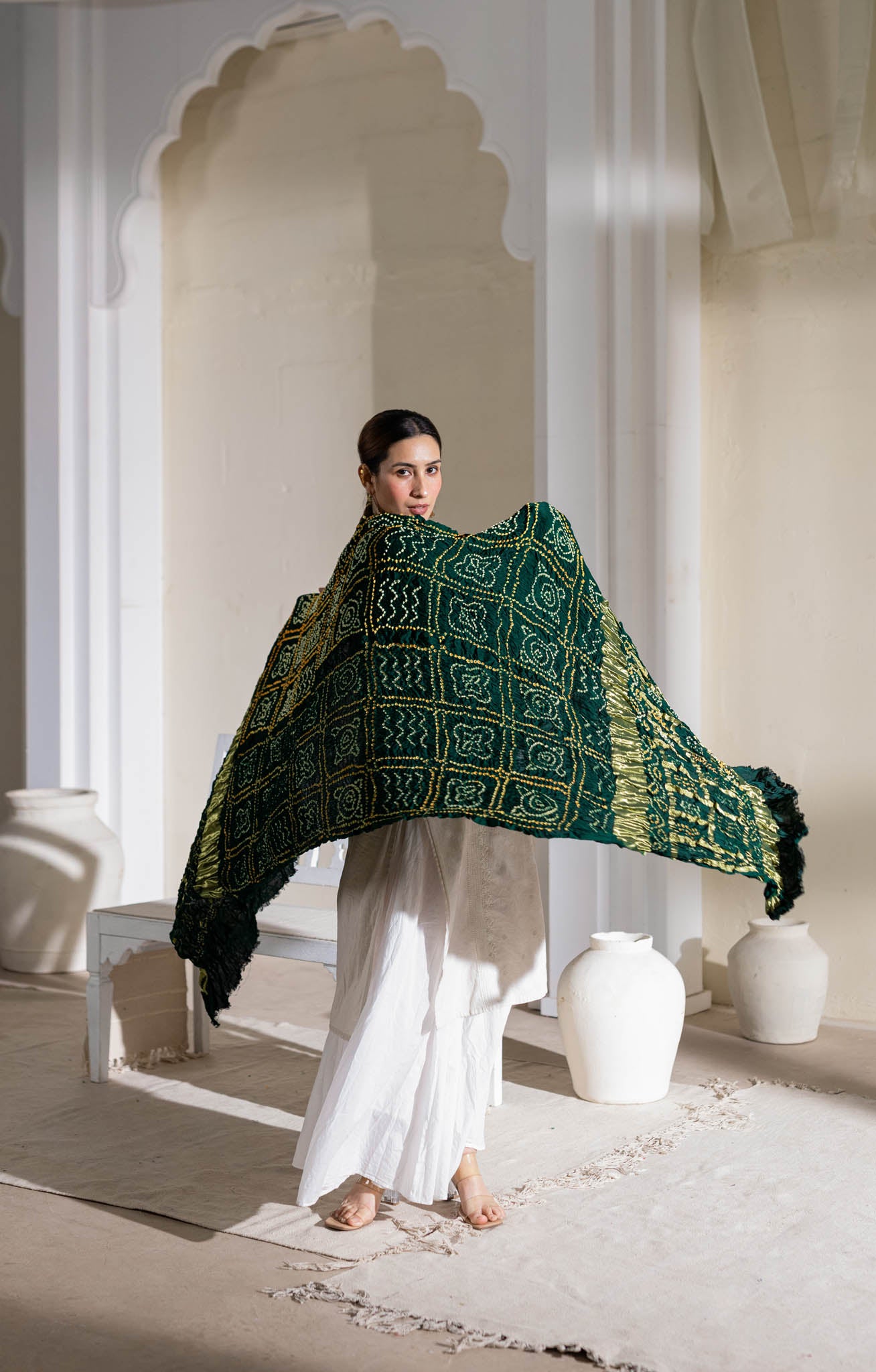 Bottle Green - Pure Modal Silk Bandhani Checks Pallu Dupatta with Zari Lagdi Patta