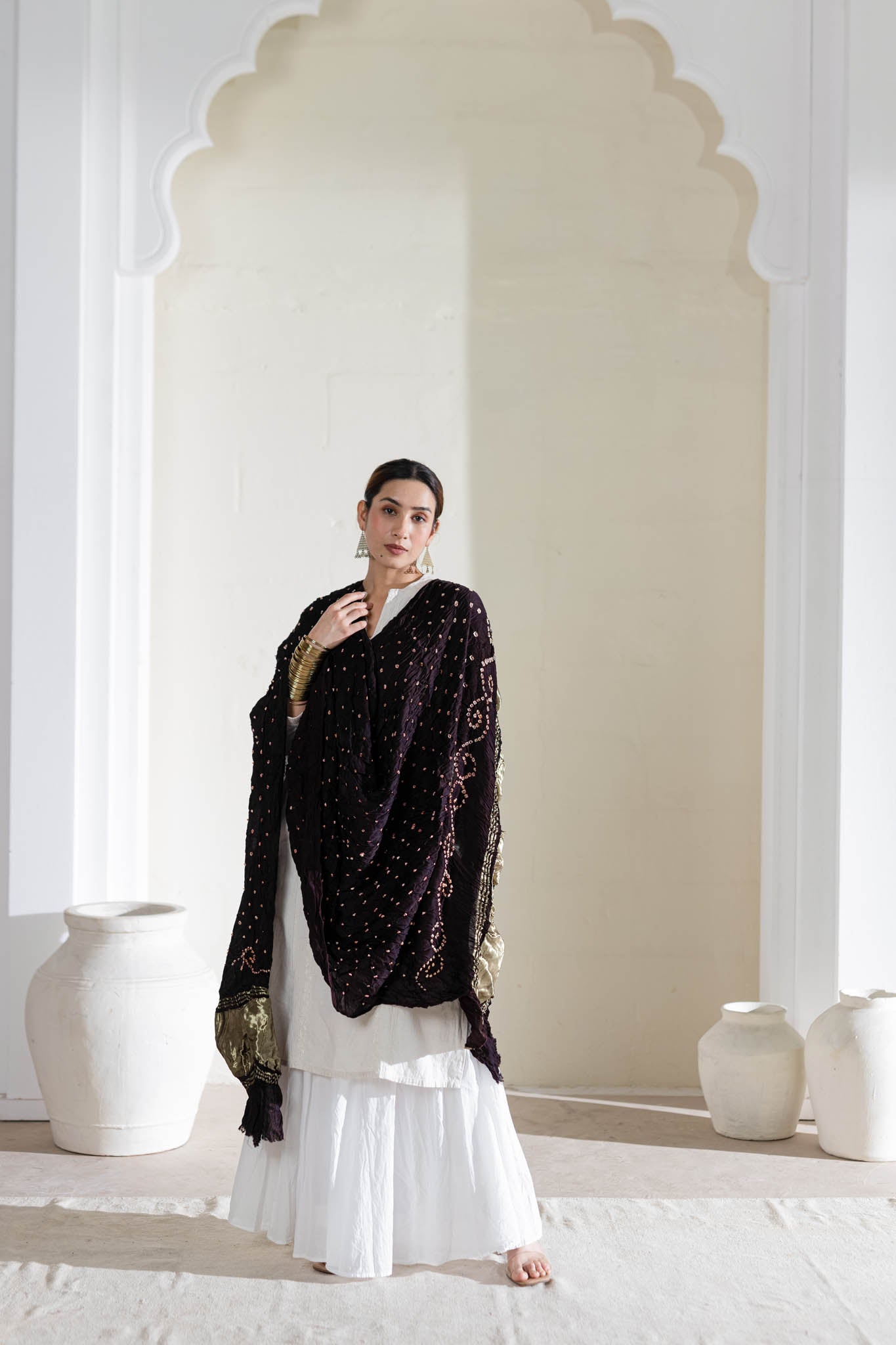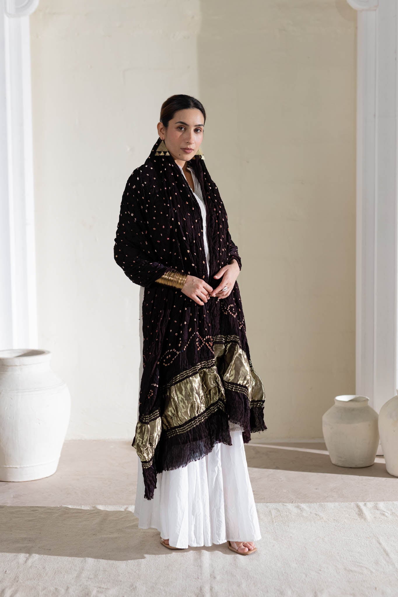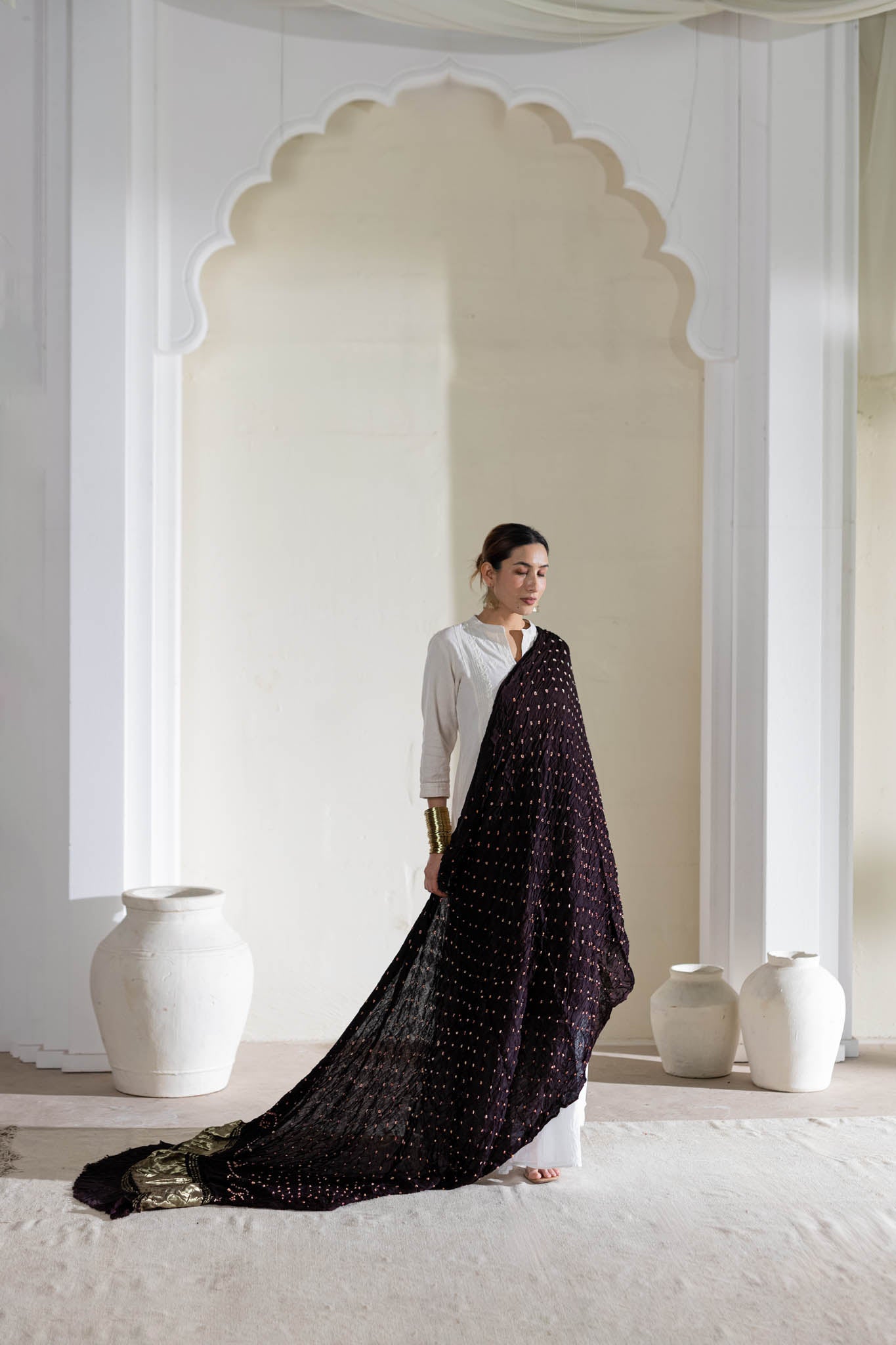 Black - Pure Modal Silk Bandhani Dani Dupatta with Zari Lagdi Patta