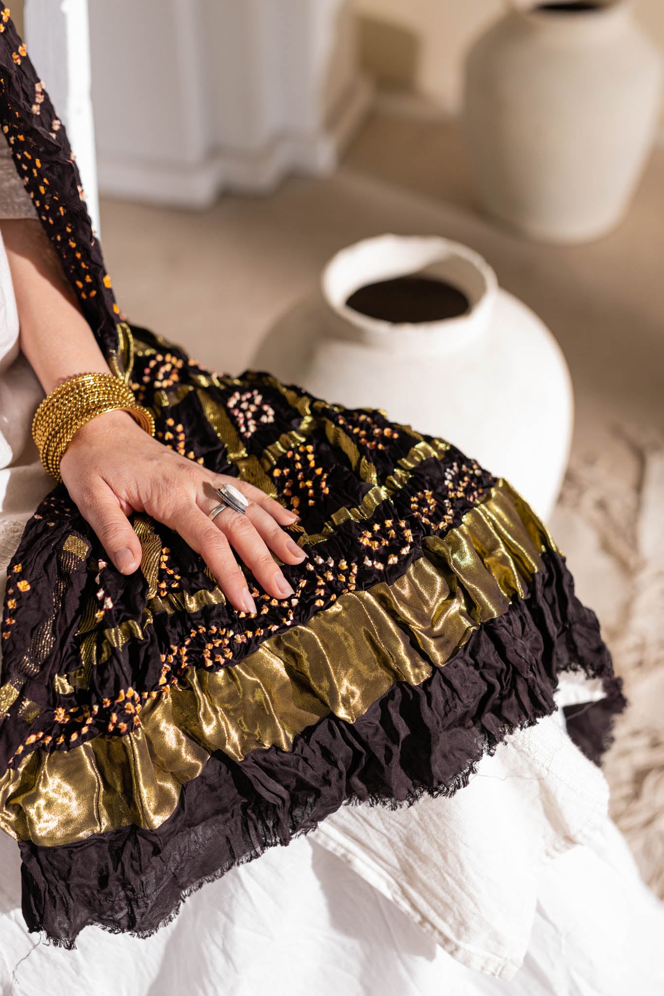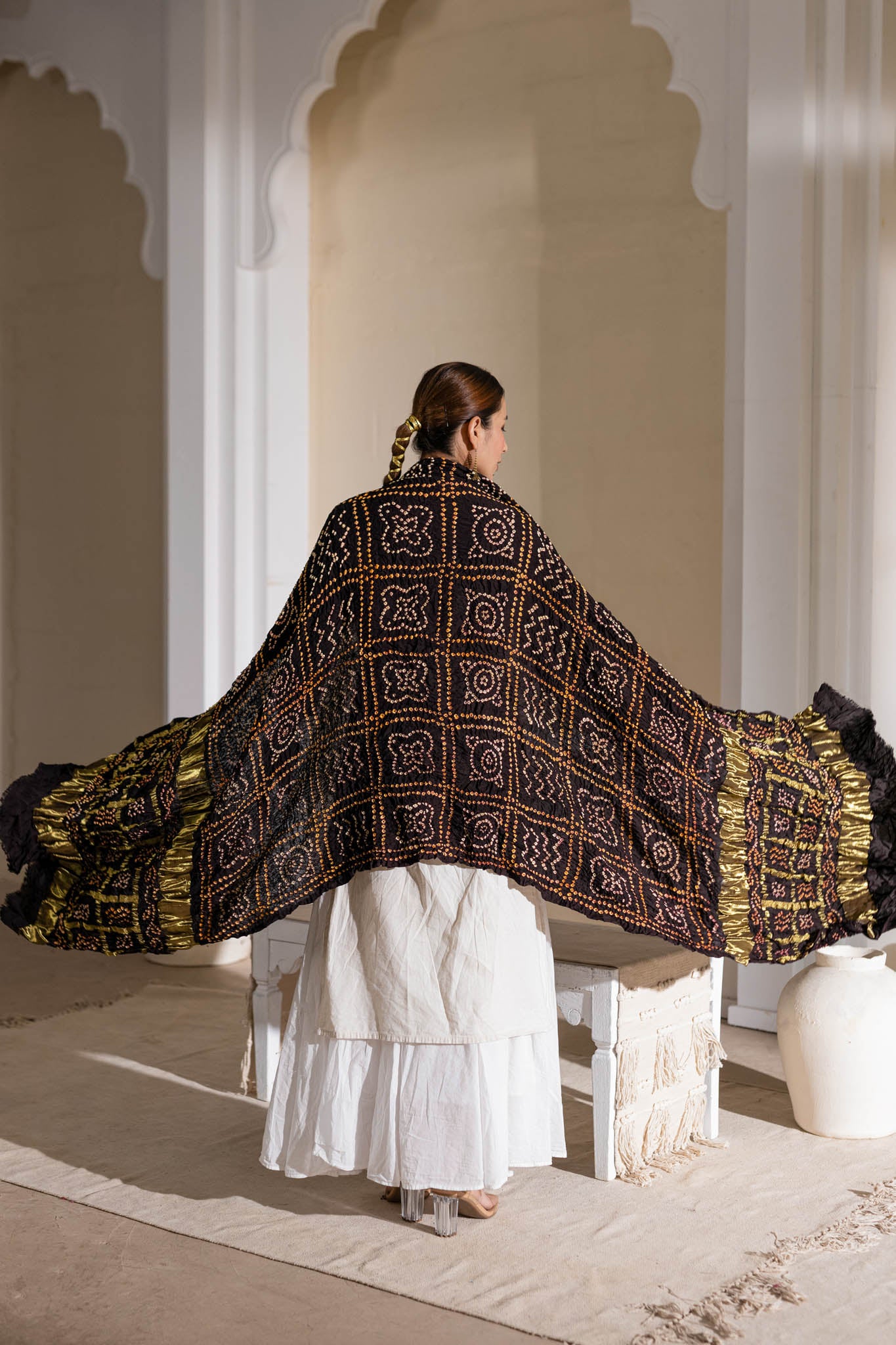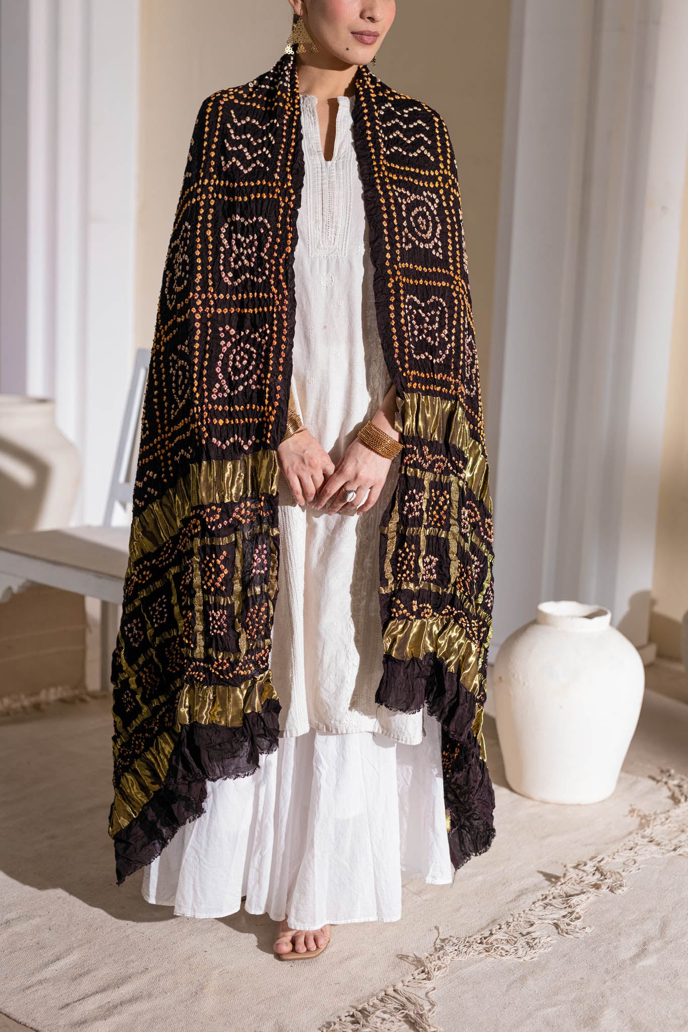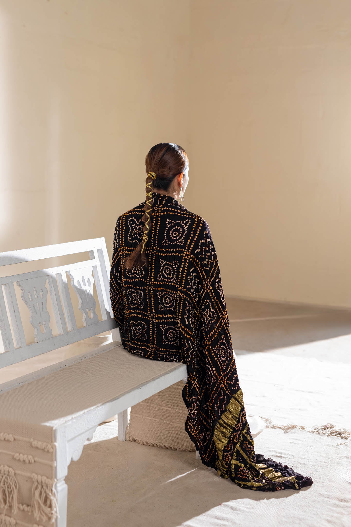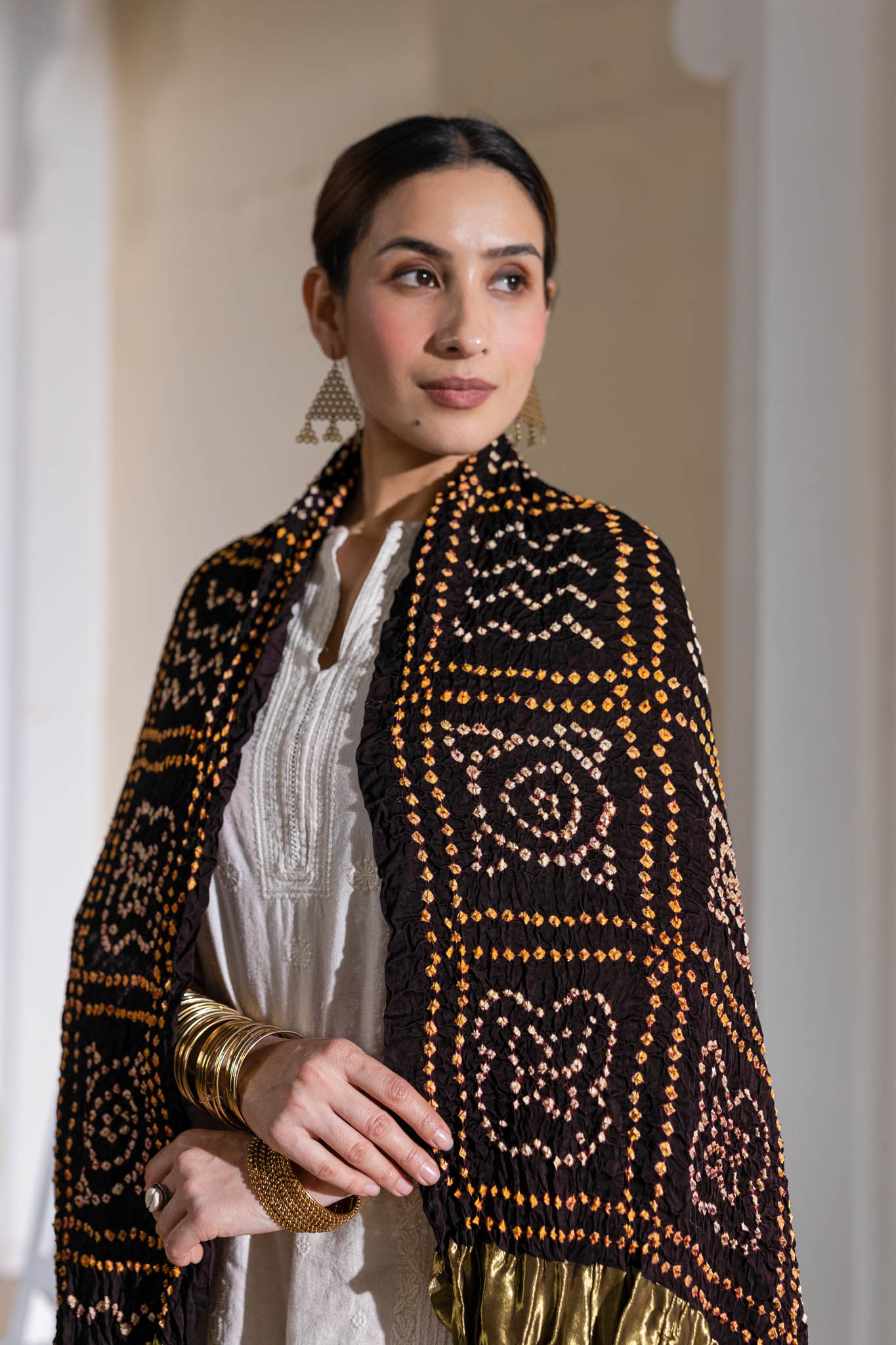 Black - Pure Modal Silk Bandhani Checks Pallu Dupatta with Zari Lagdi Patta