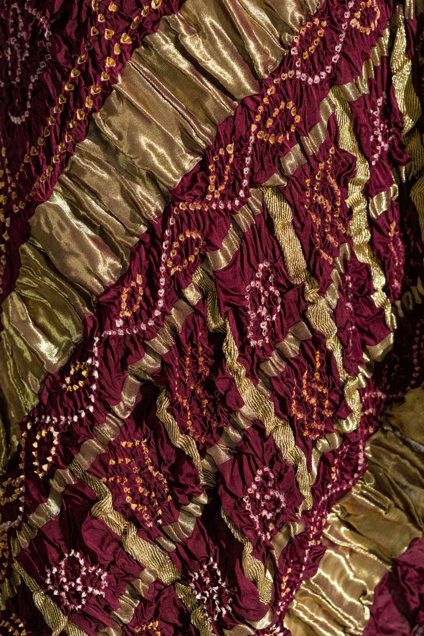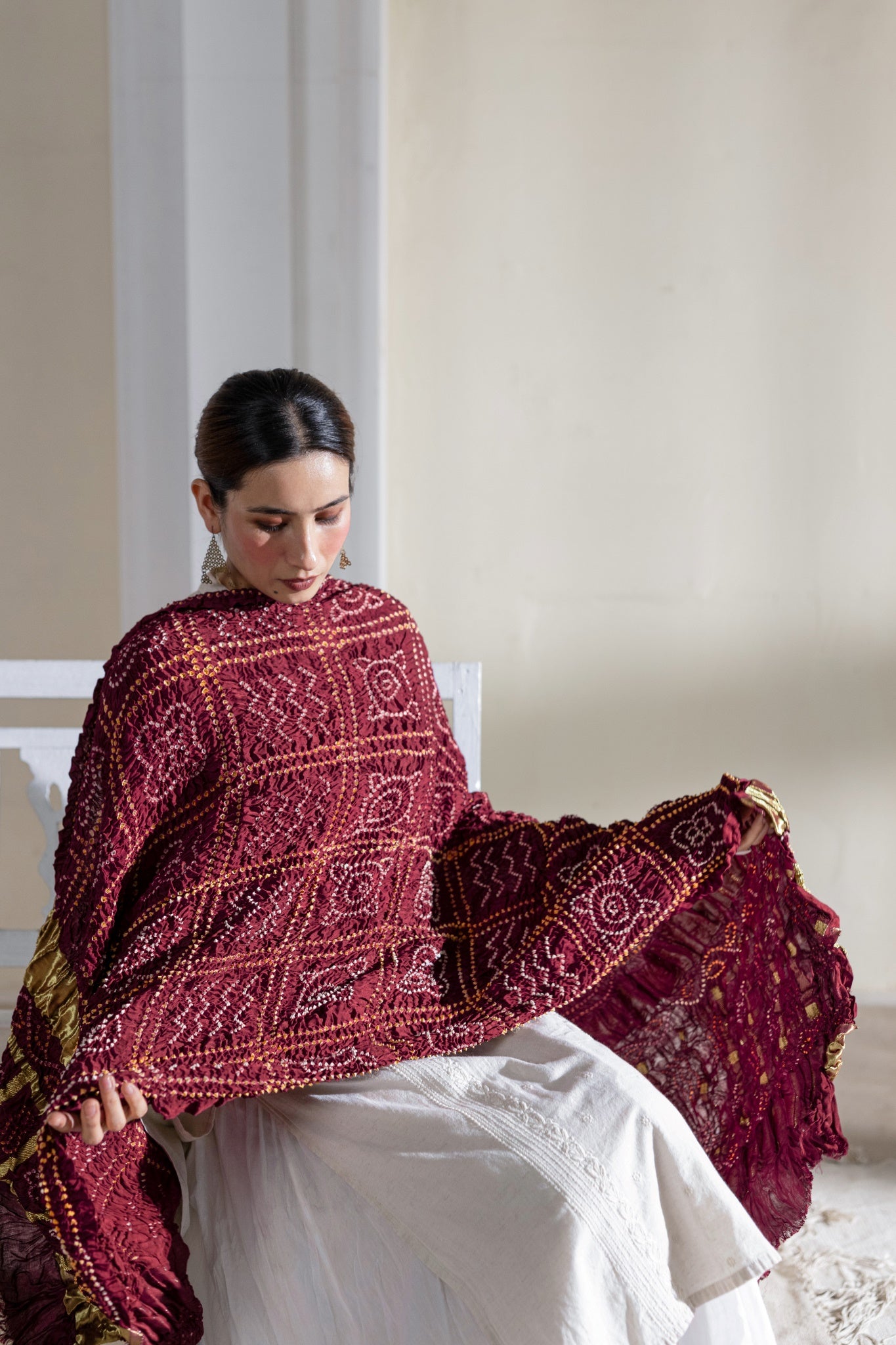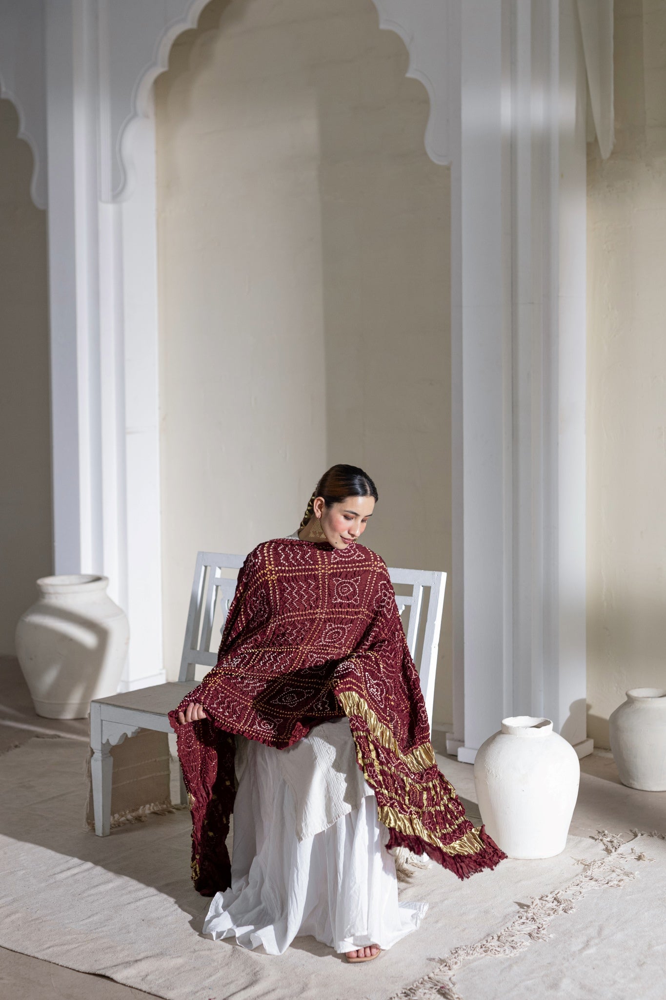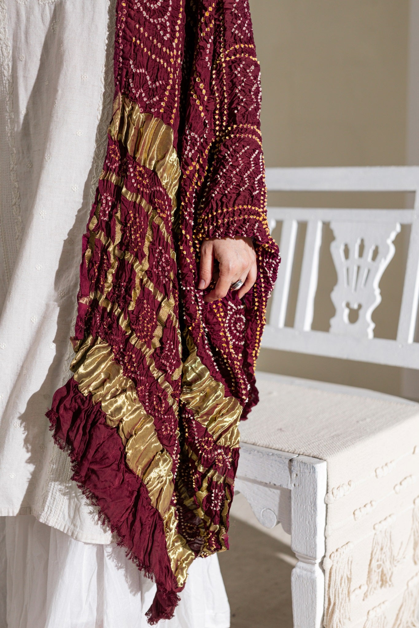 Maroon - Pure Modal Silk Bandhani Checks Pallu Dupatta with Zari Lagdi Patta