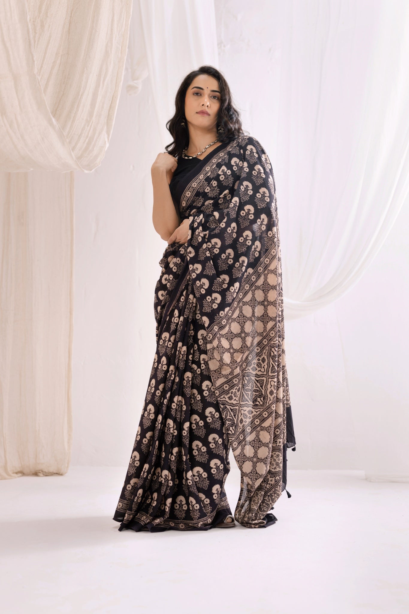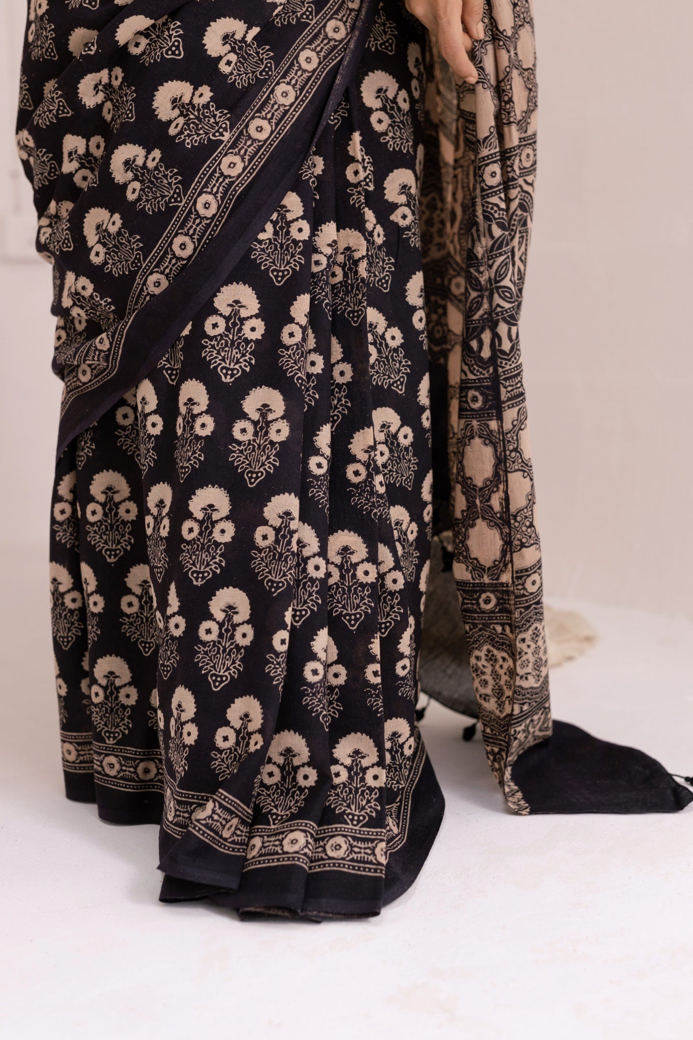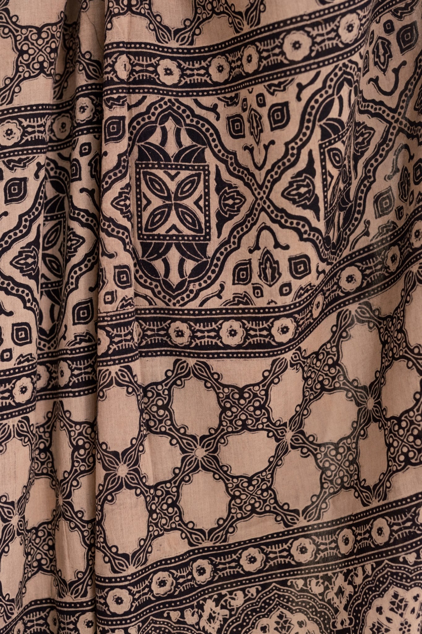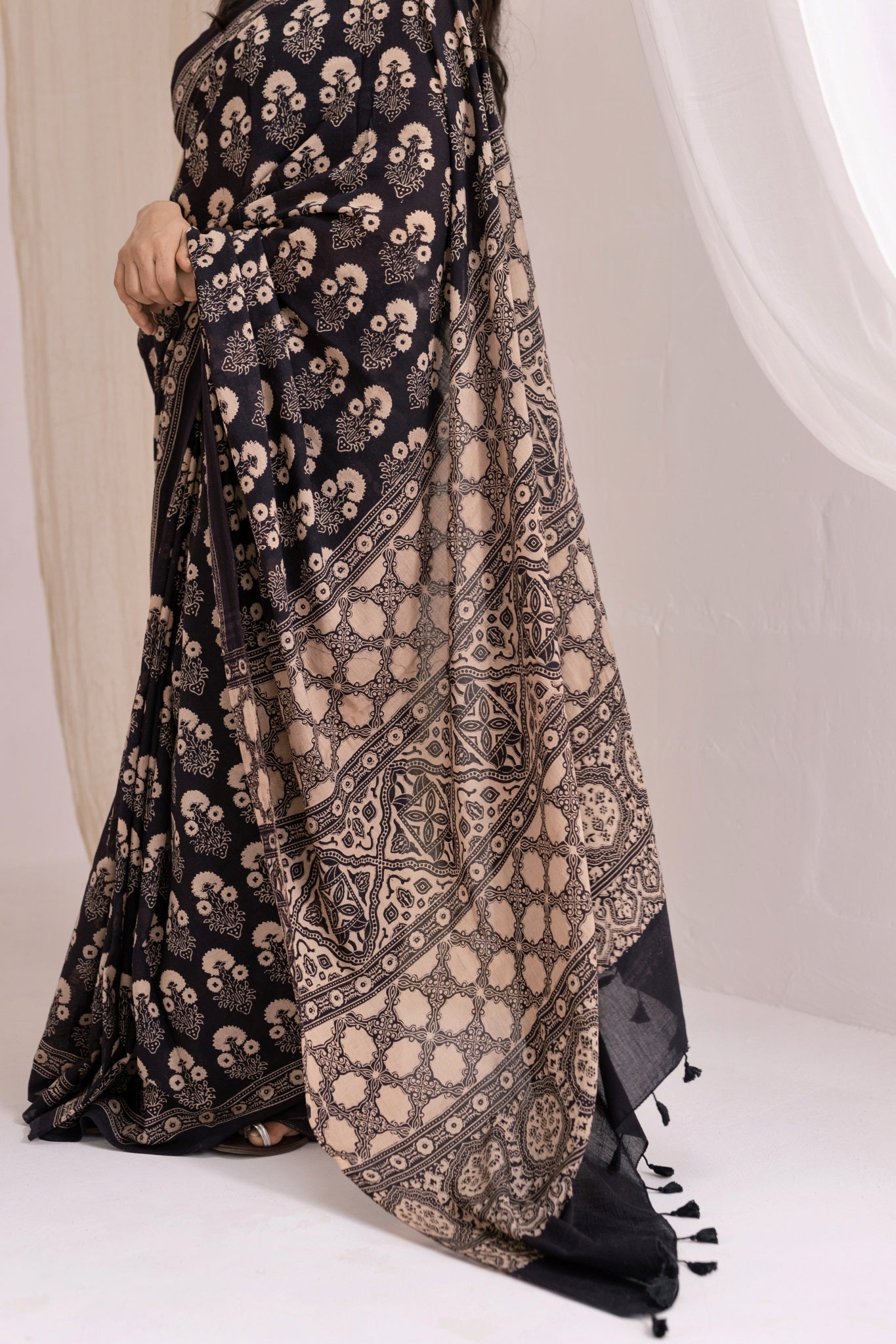 Pure Mul Cotton Ajrakh Hand Block Saree - Black/Brown