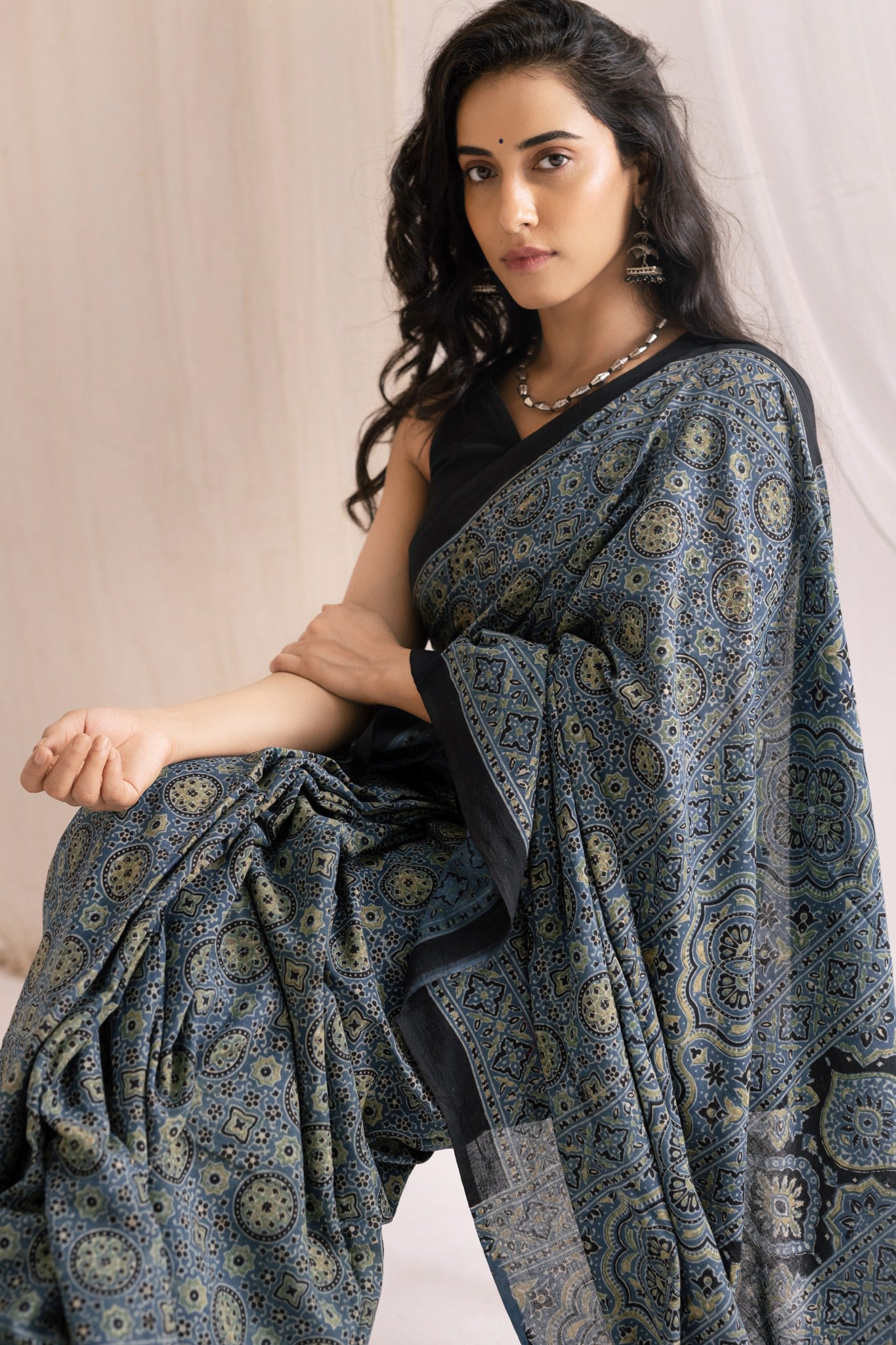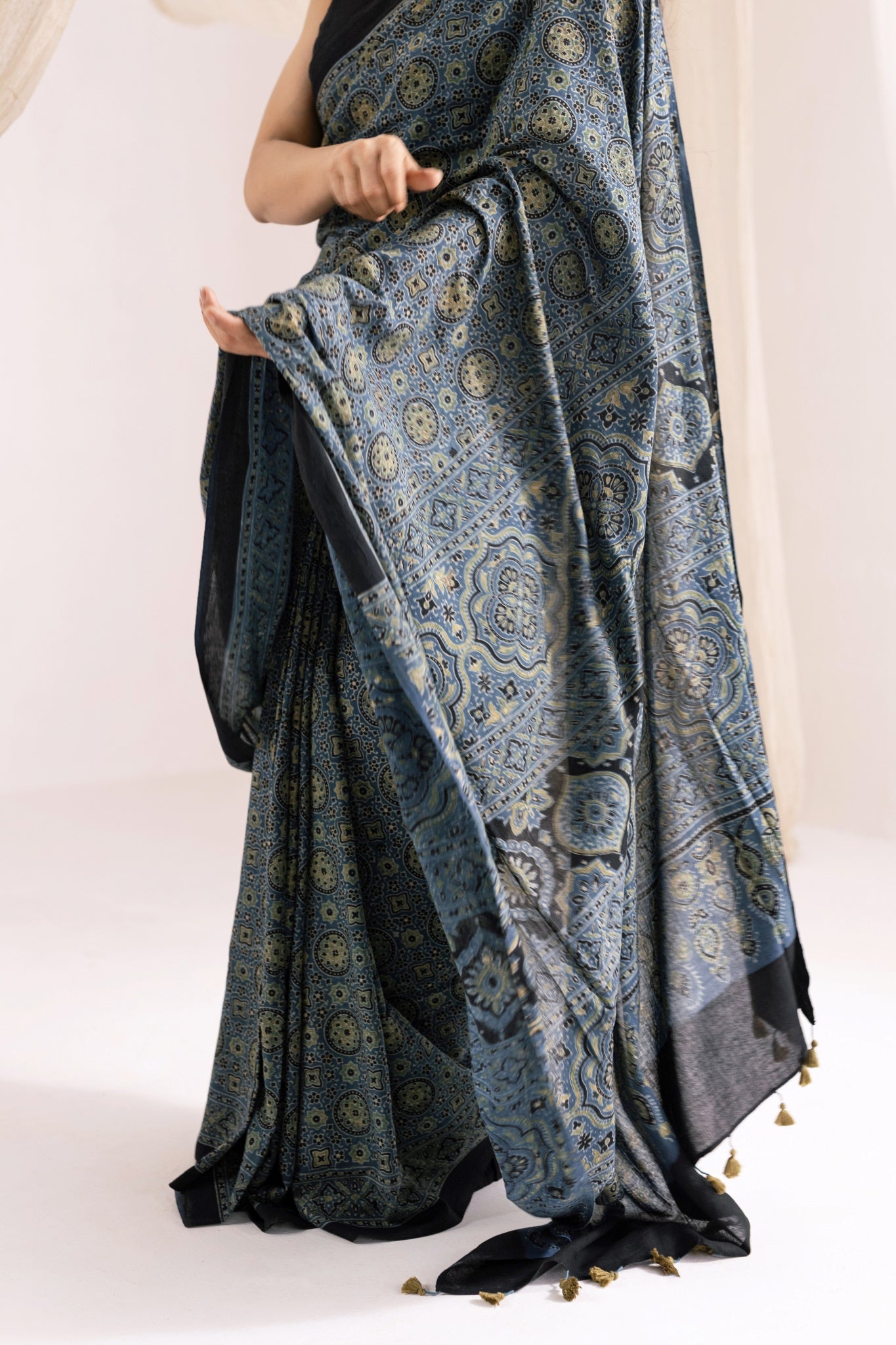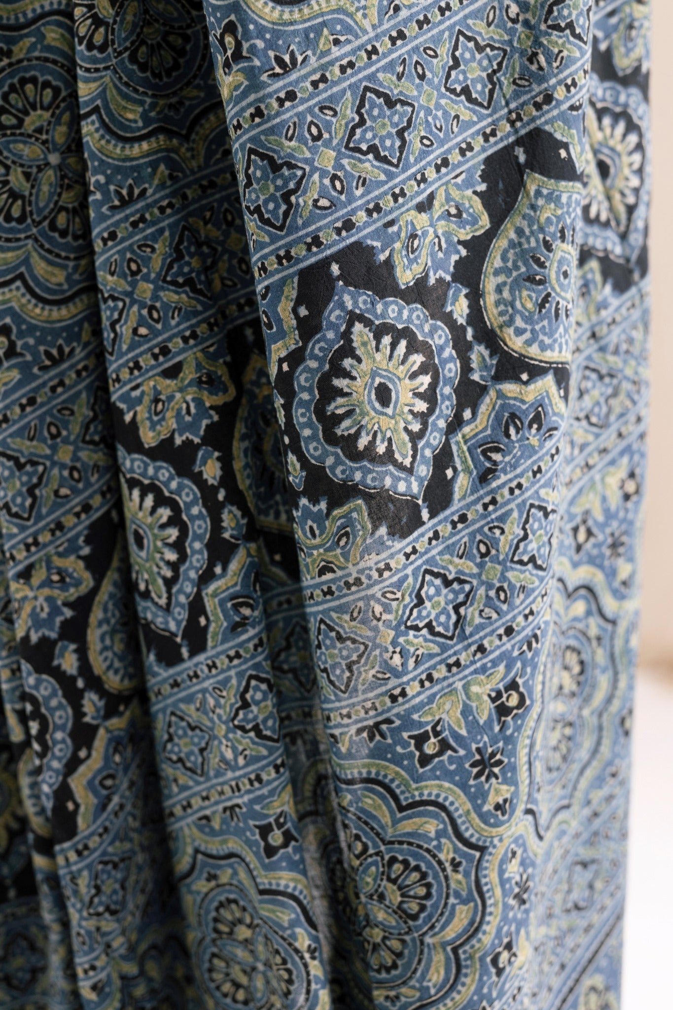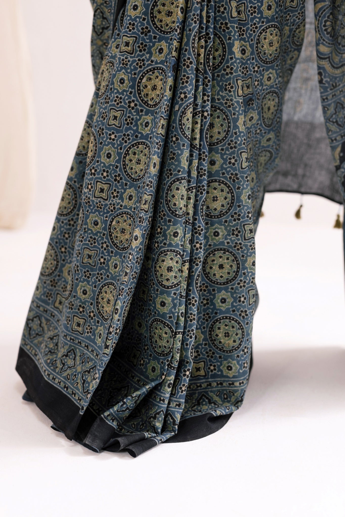 Pure Mul Cotton Ajrakh Hand Block Saree - Indigo