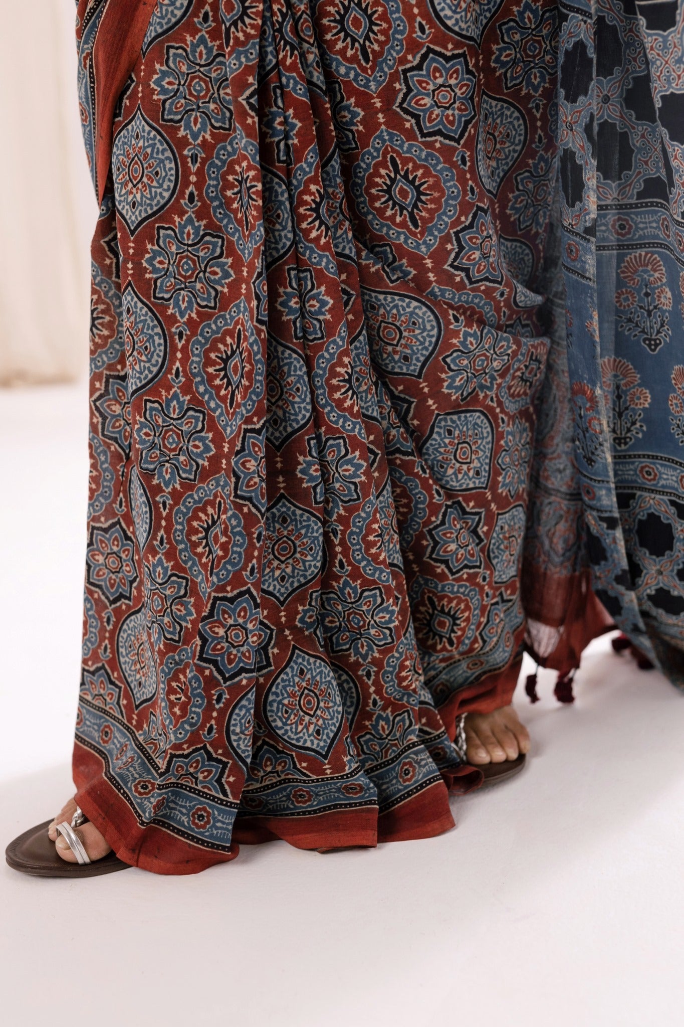 Pure Mul Cotton Ajrakh Hand Block Saree - Indigo/Maroon