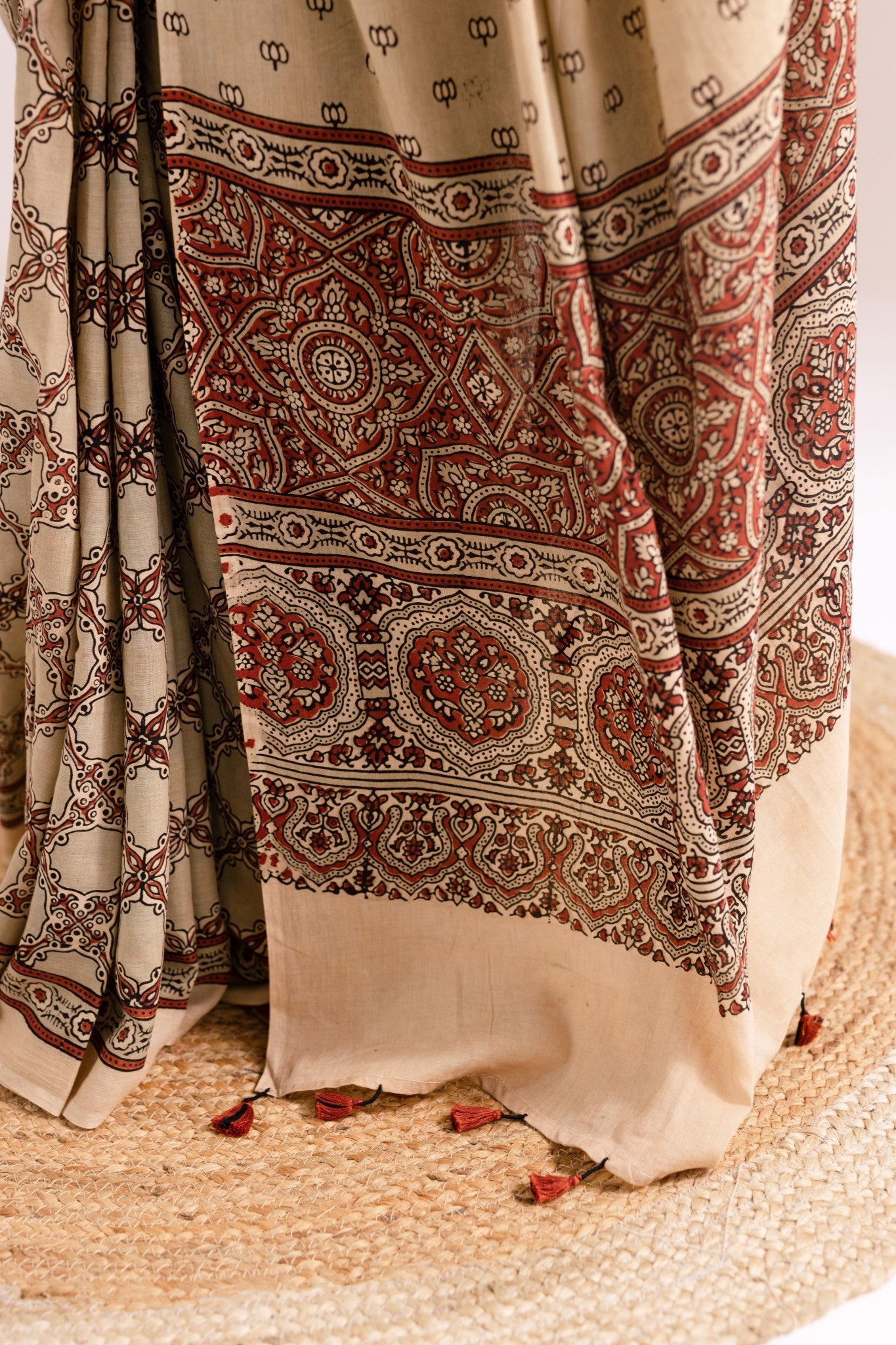 Pure Mul Cotton Ajrakh Hand Block Saree - Light Yellow