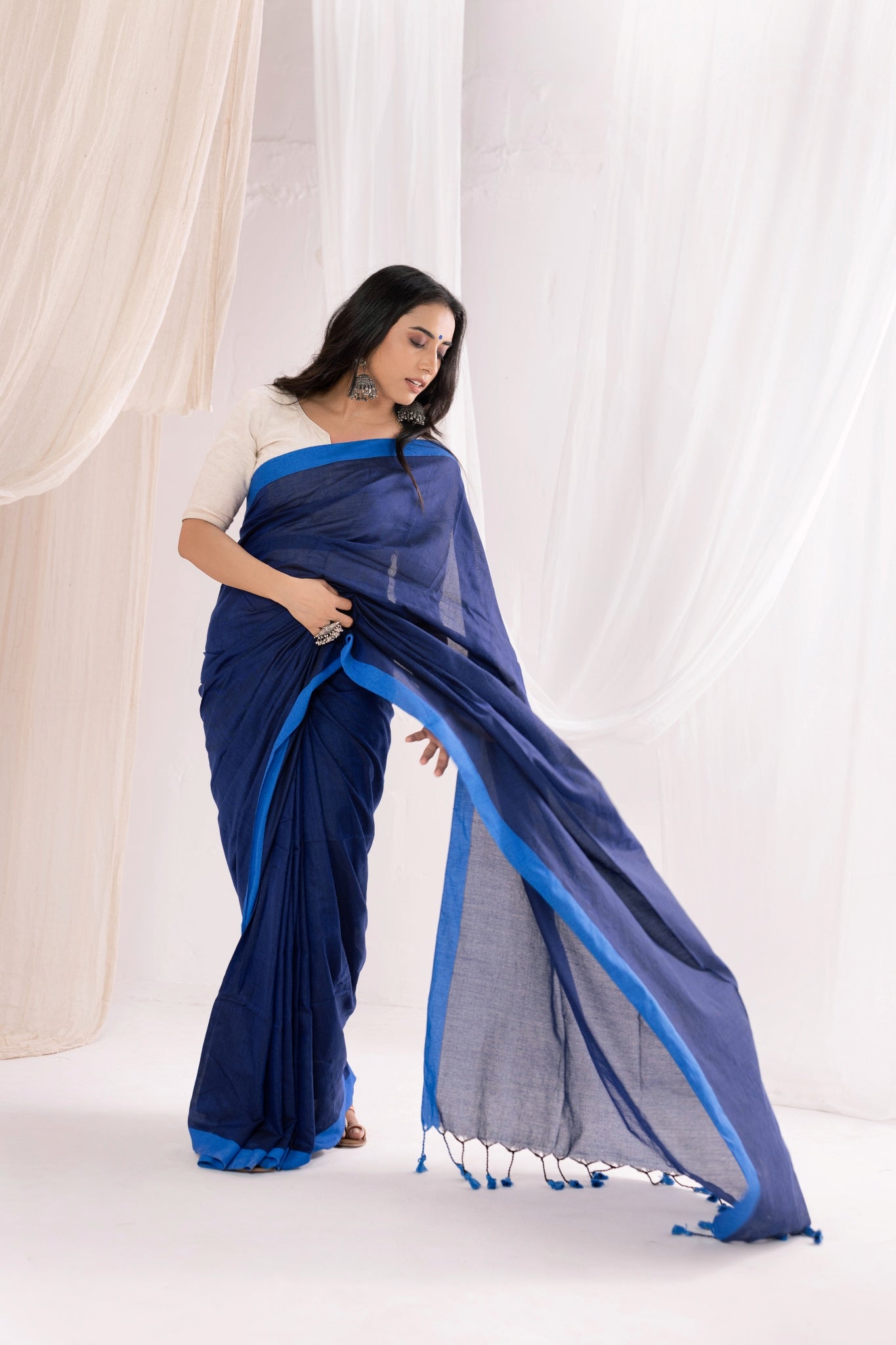 Pure Mul Cotton Handloom Contrast Color Border Saree - Navy Blue/Blue