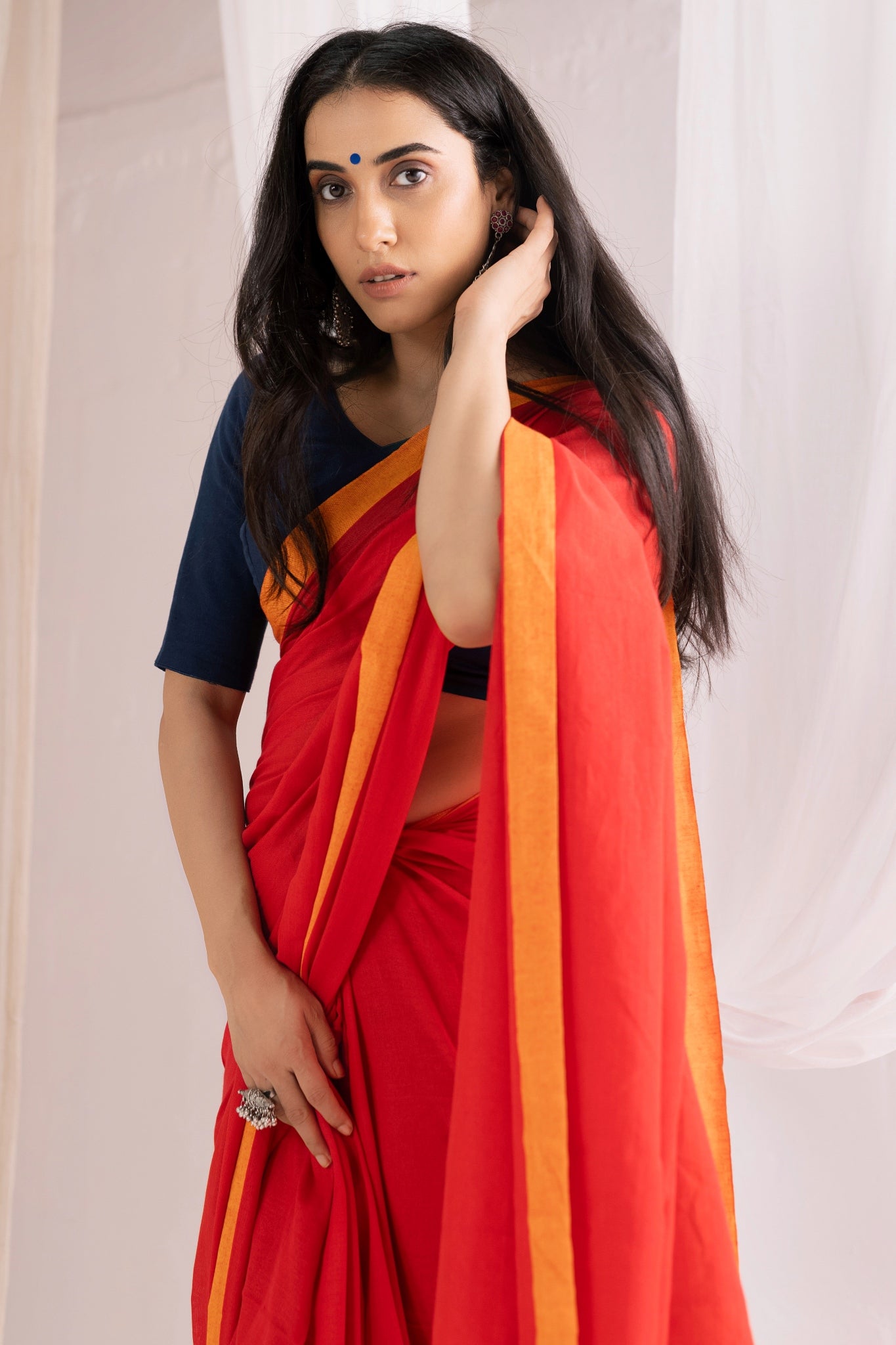 Pure Mul Cotton Handloom Contrast Color Border Saree - Red/Yellow