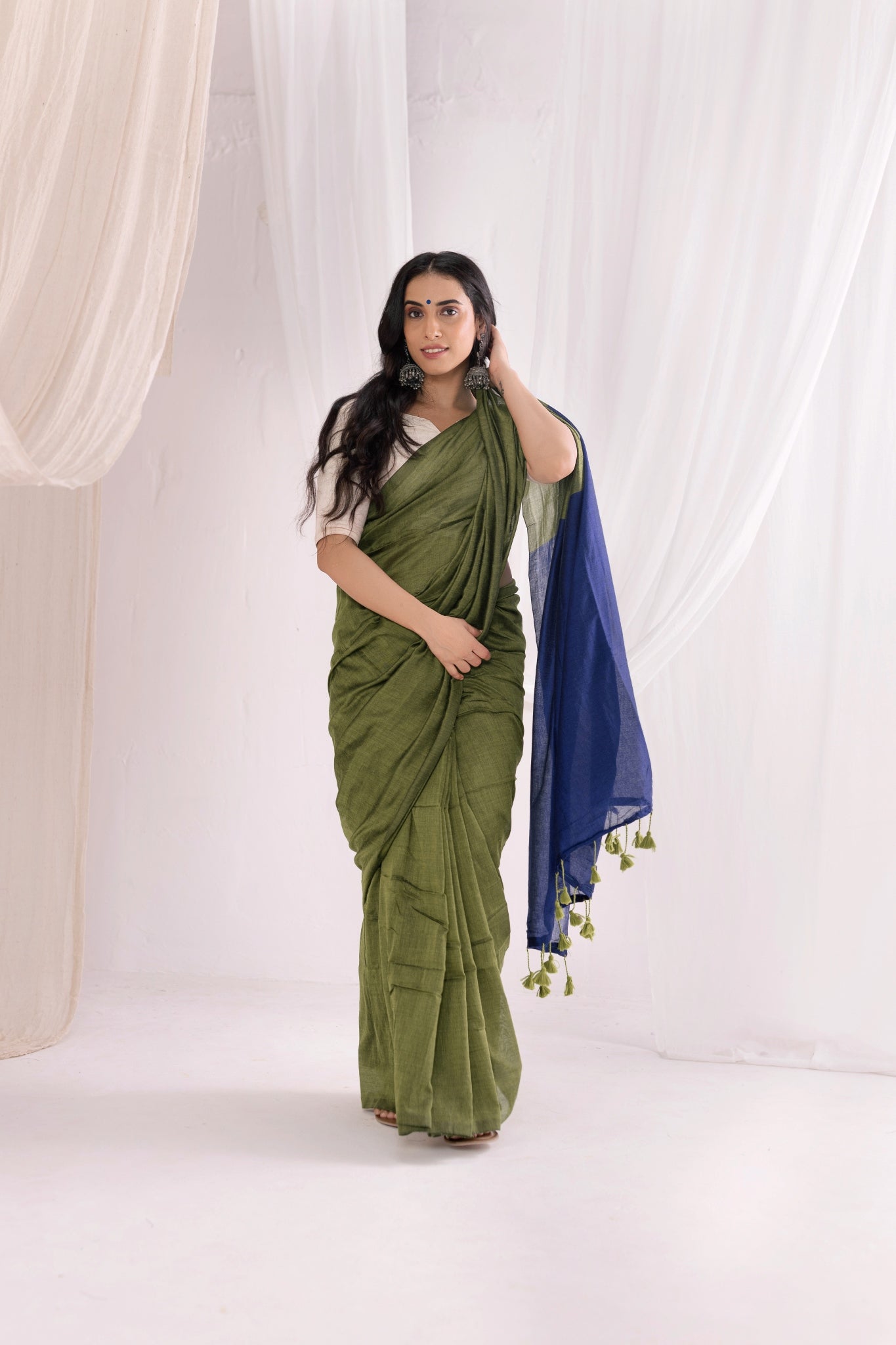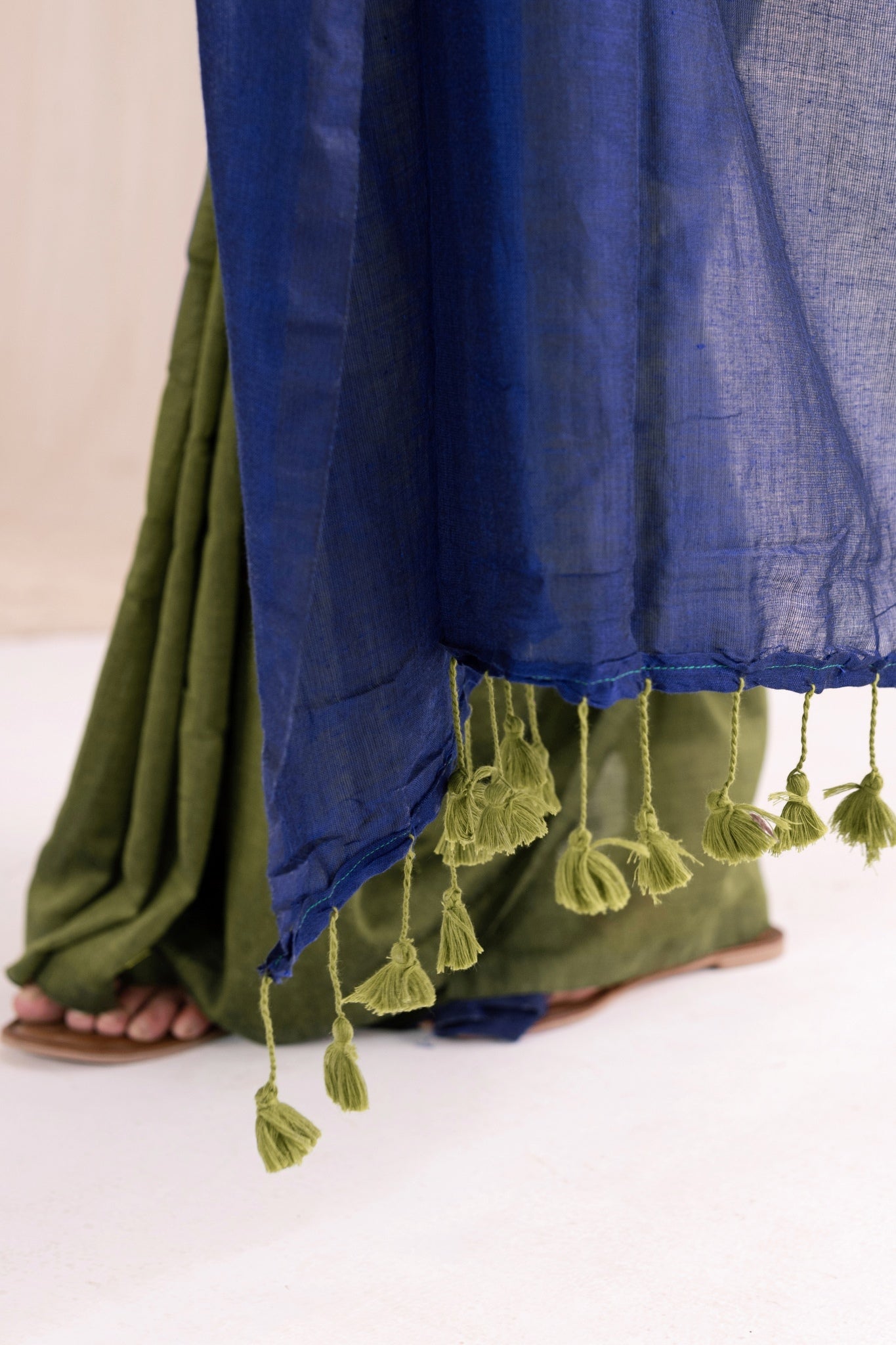 Pure Mul Cotton Handloom Contrast Color Pallu Saree - Green/Blue