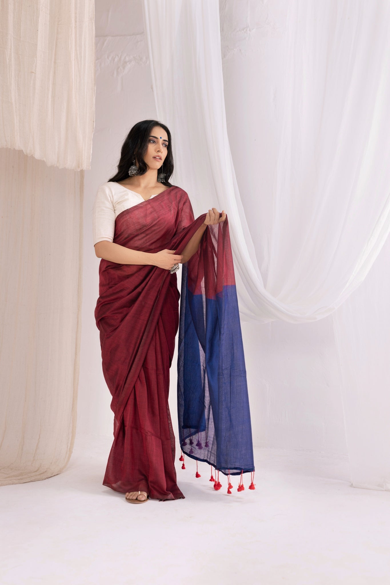 Pure Mul Cotton Handloom Contrast Color Pallu Saree - Maroon/Blue