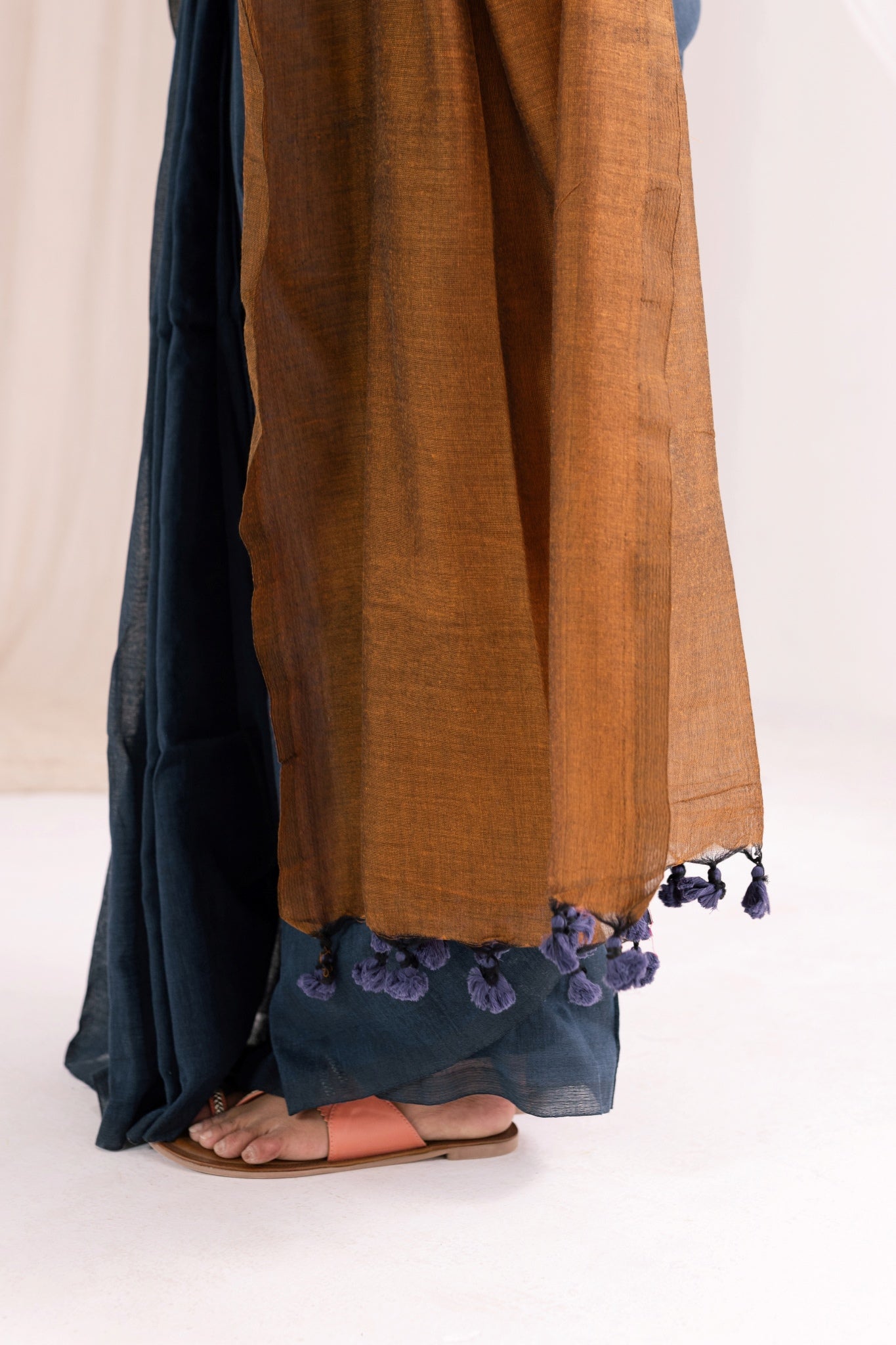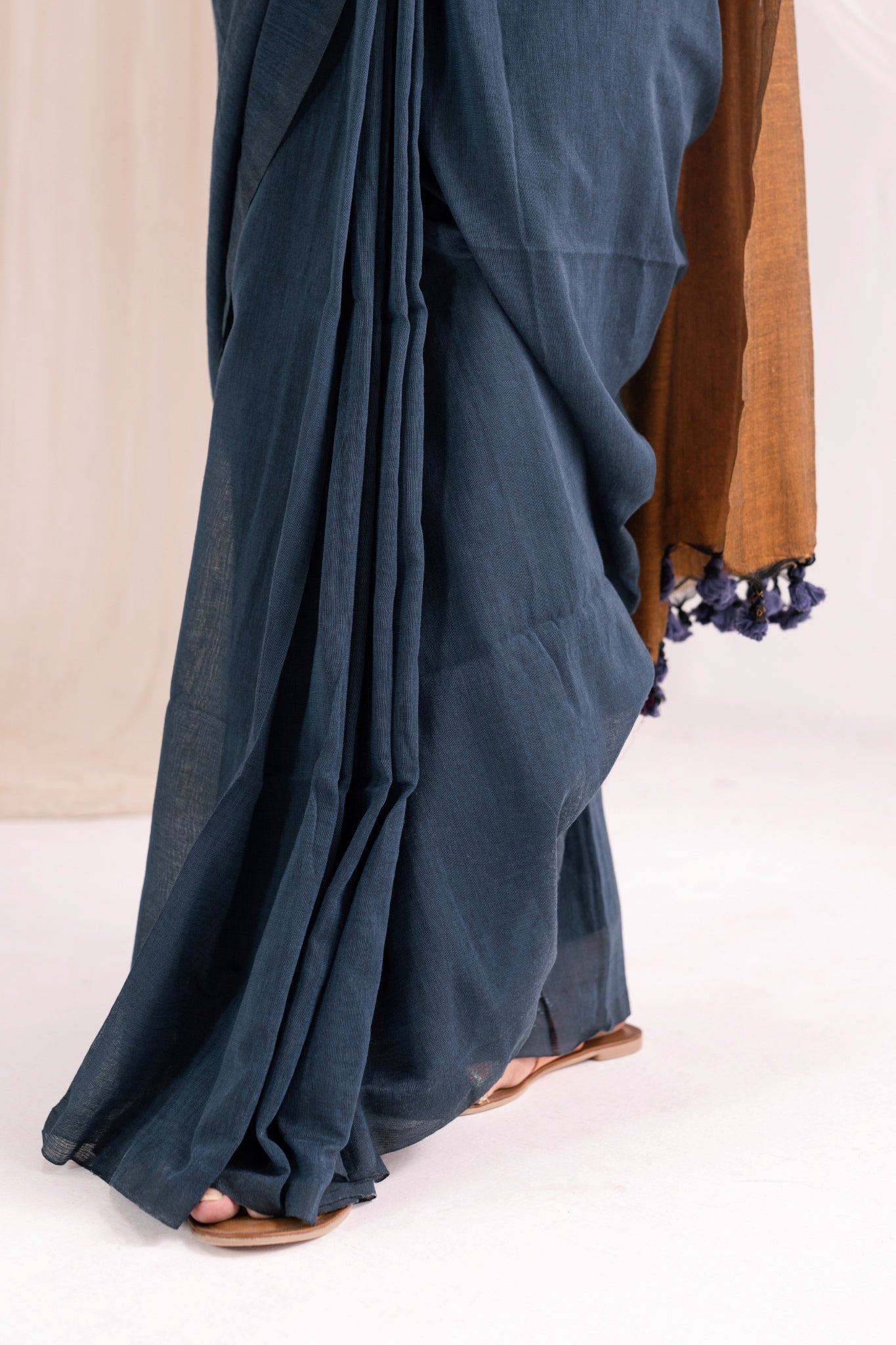 Pure Mul Cotton Handloom Contrast Color Pallu Saree - Navy Blue/Russet Brown