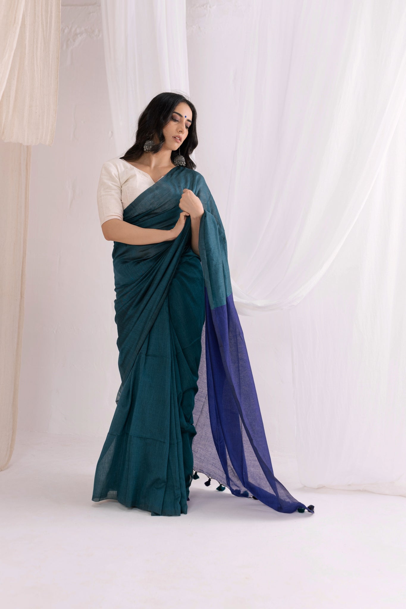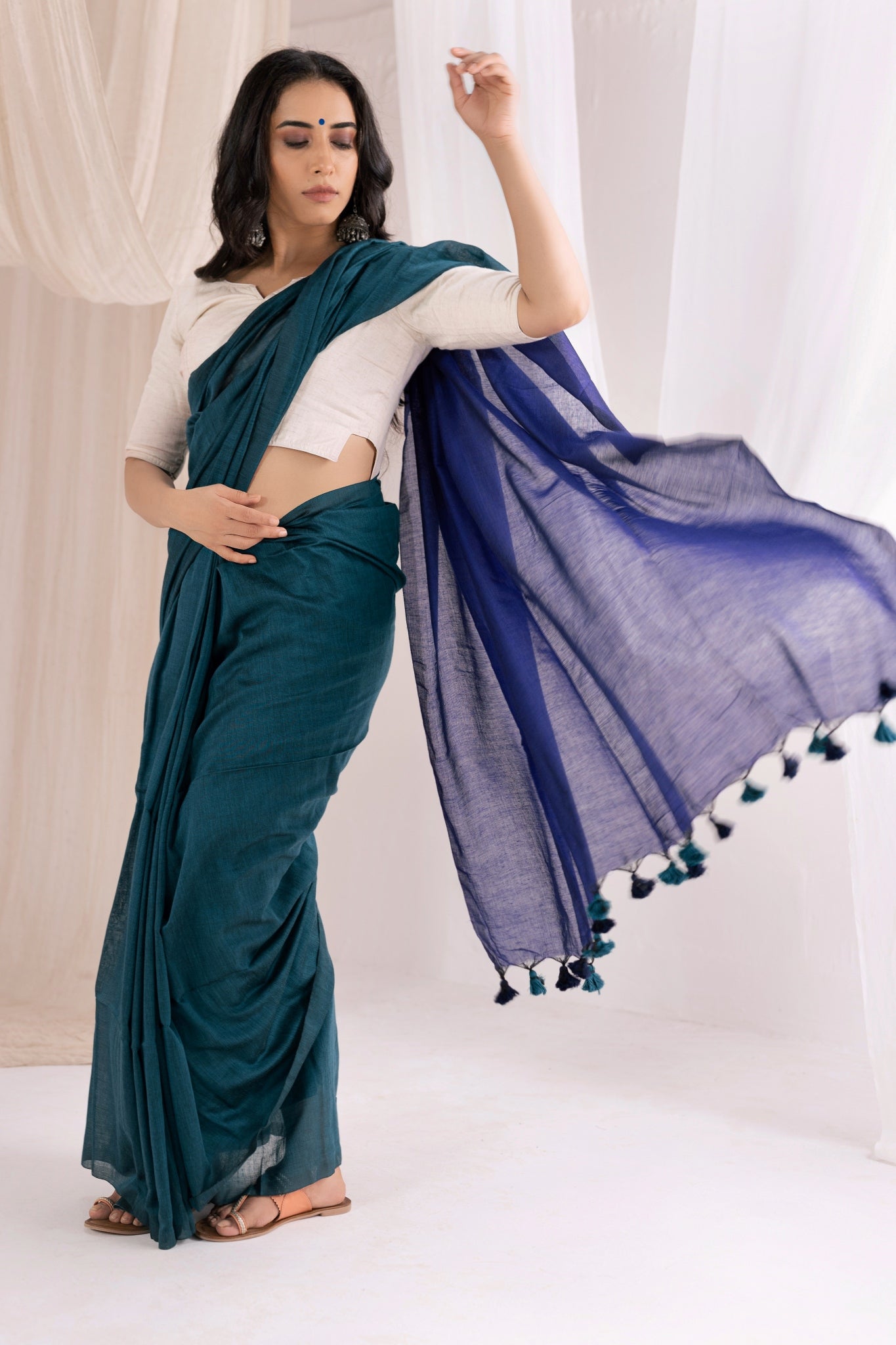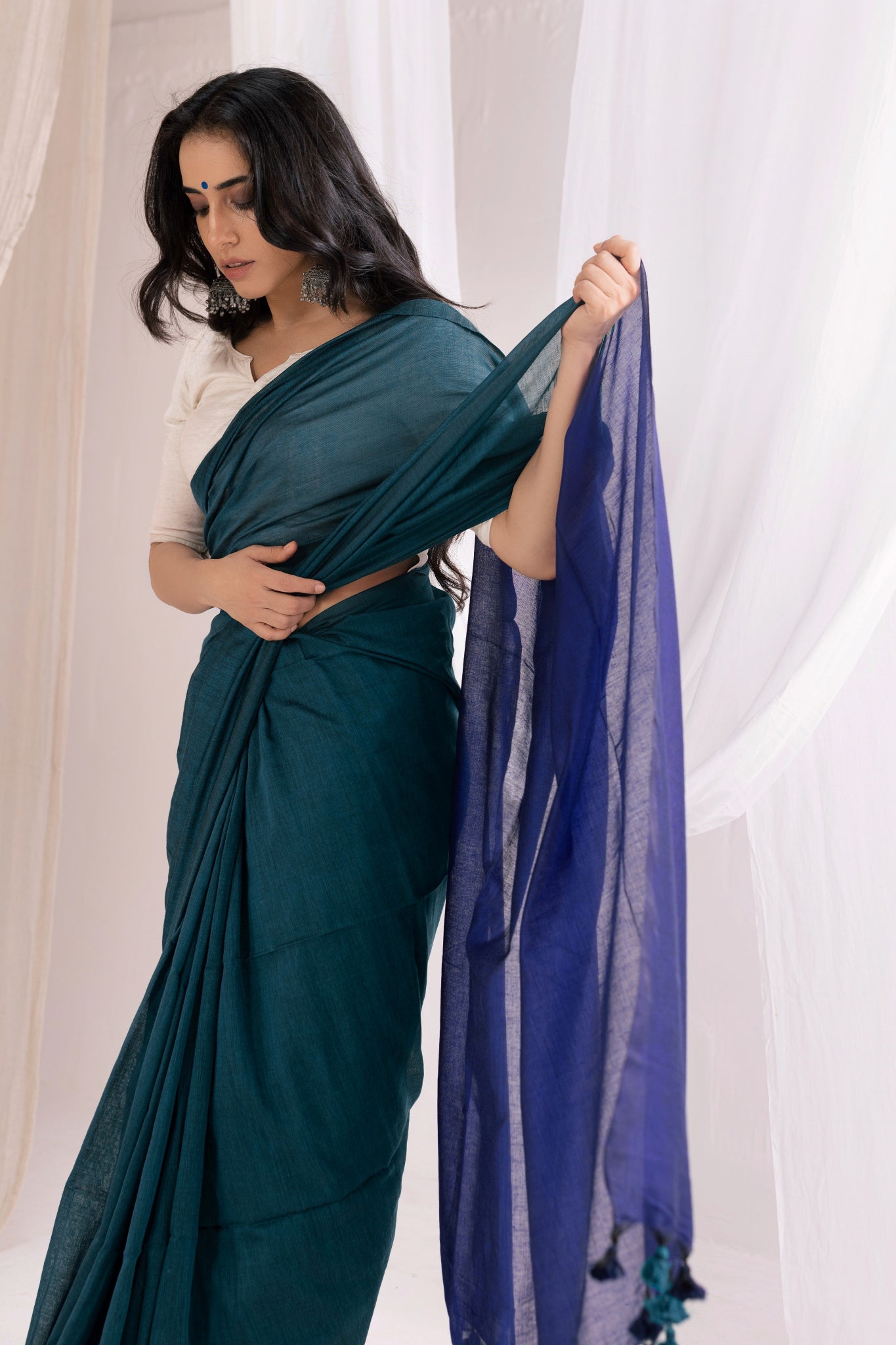 Pure Mul Cotton Handloom Contrast Color Pallu Saree - Rama Green/Blue