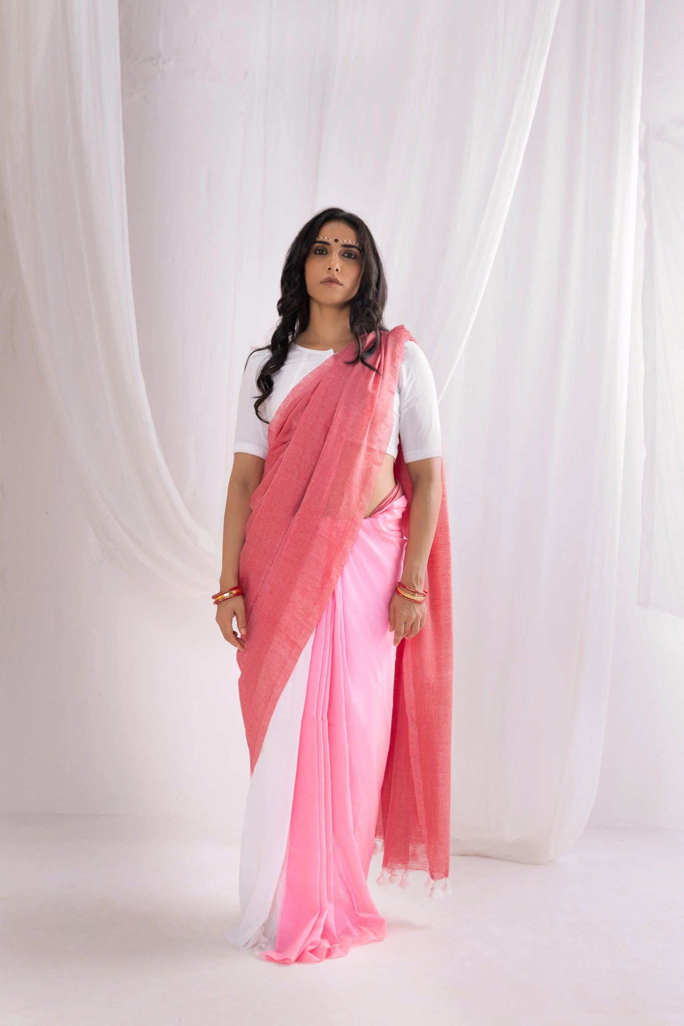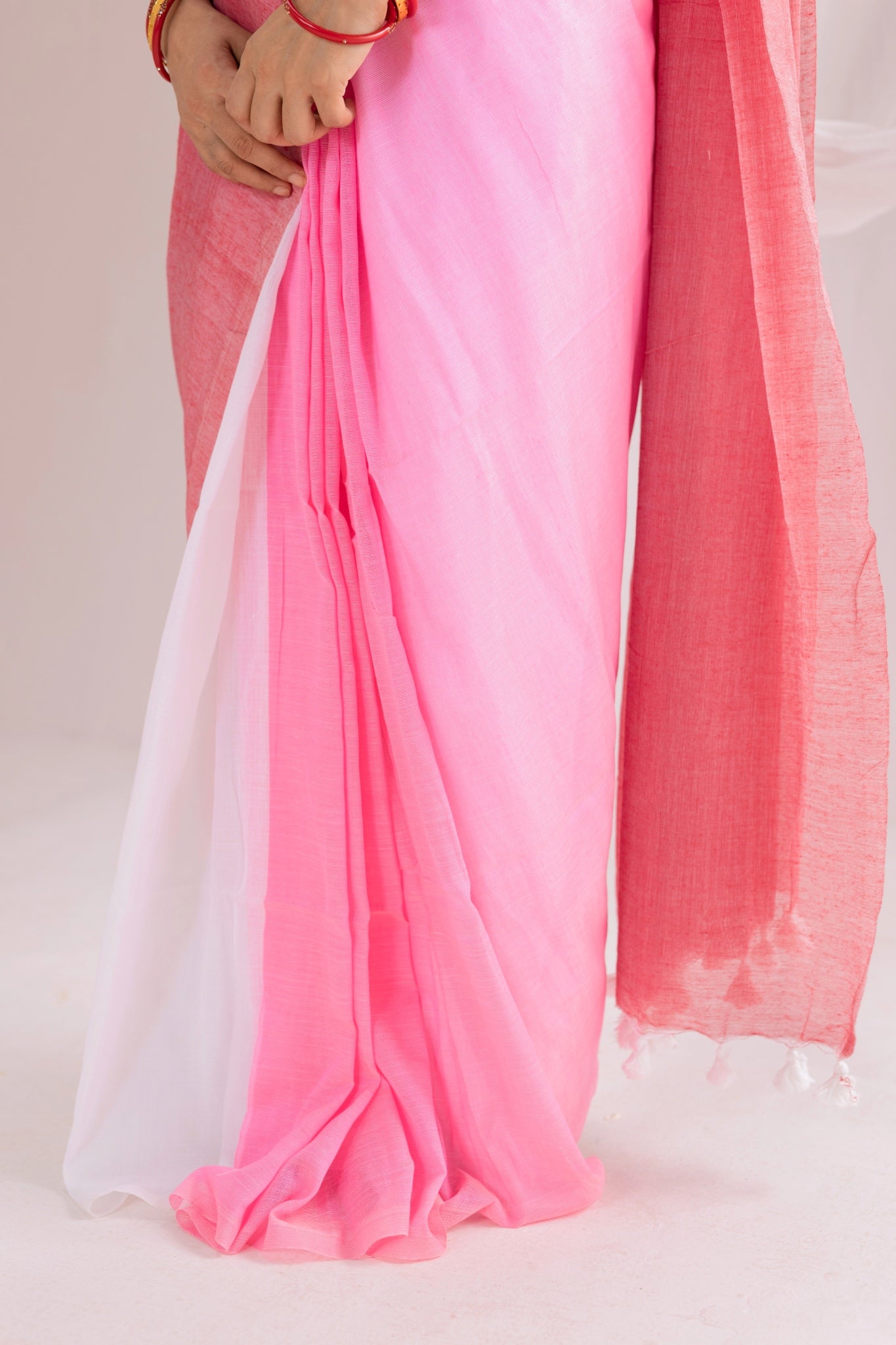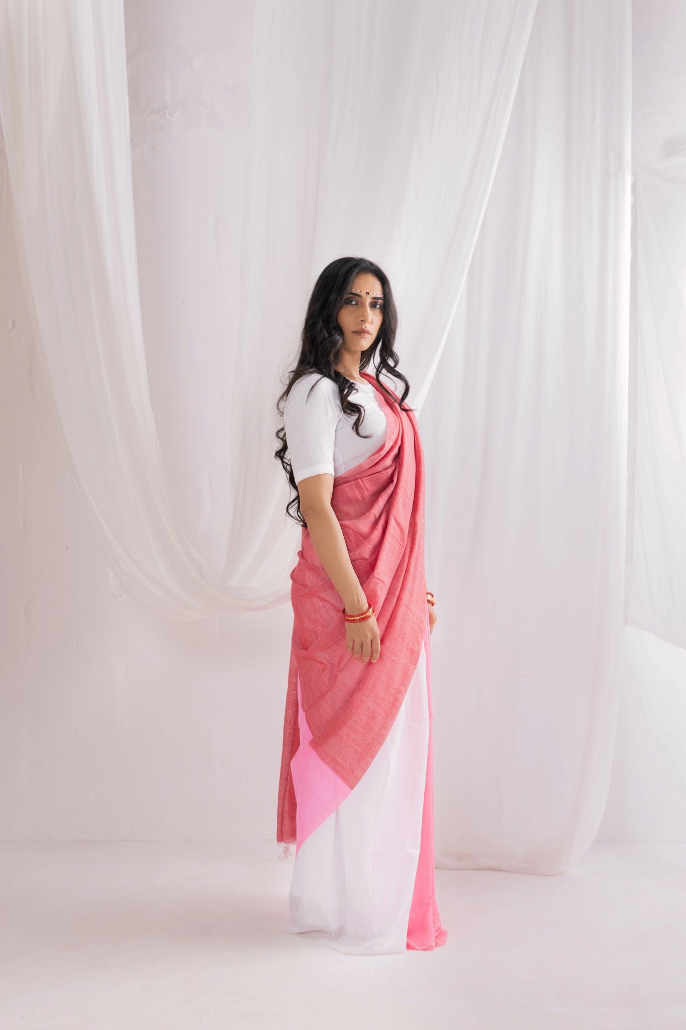 Pure Mul Cotton Handloom Contrast Color Pallu Saree - Red/Pink/White