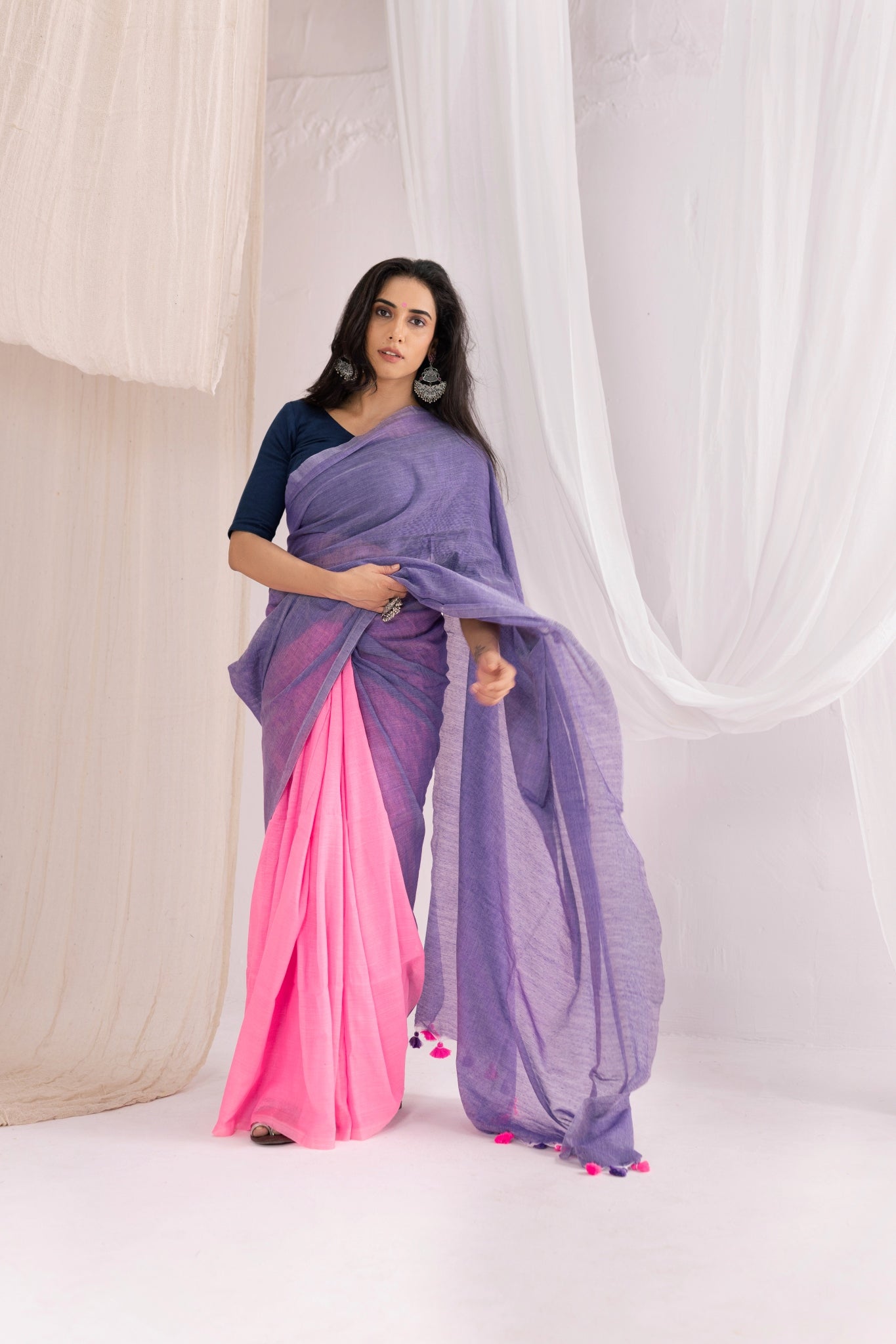 Pure Mul Cotton Handloom Contrast Color Pallu Saree - Violate/Pink
