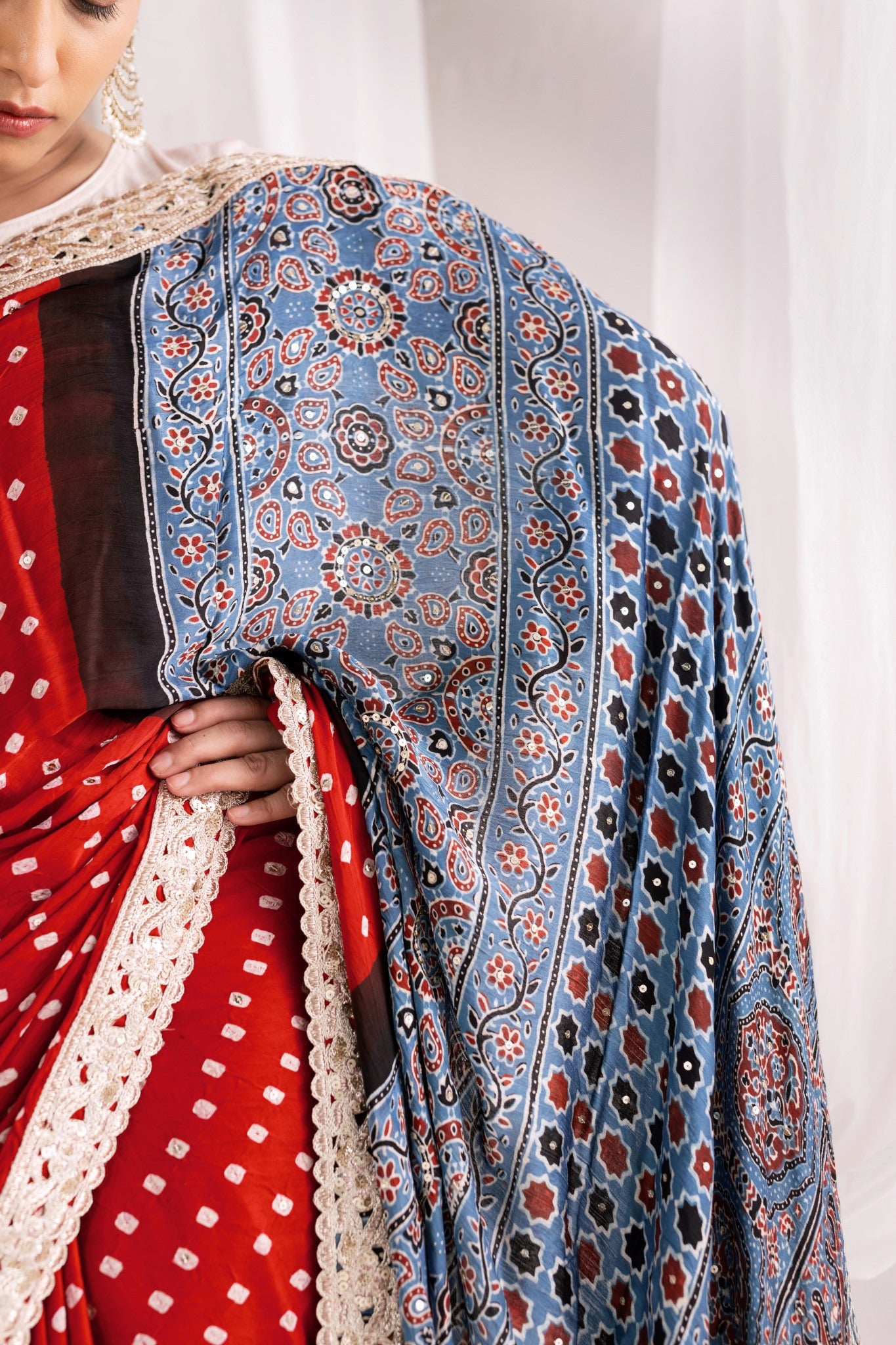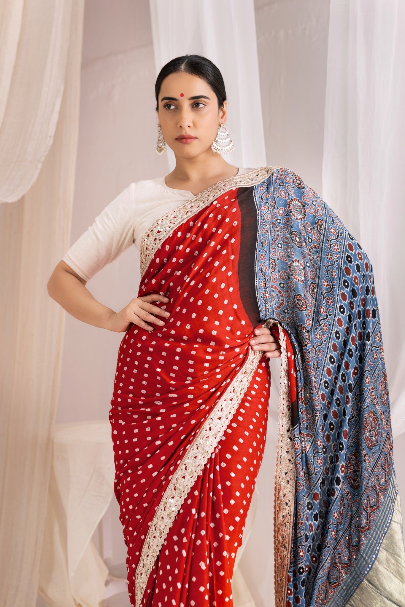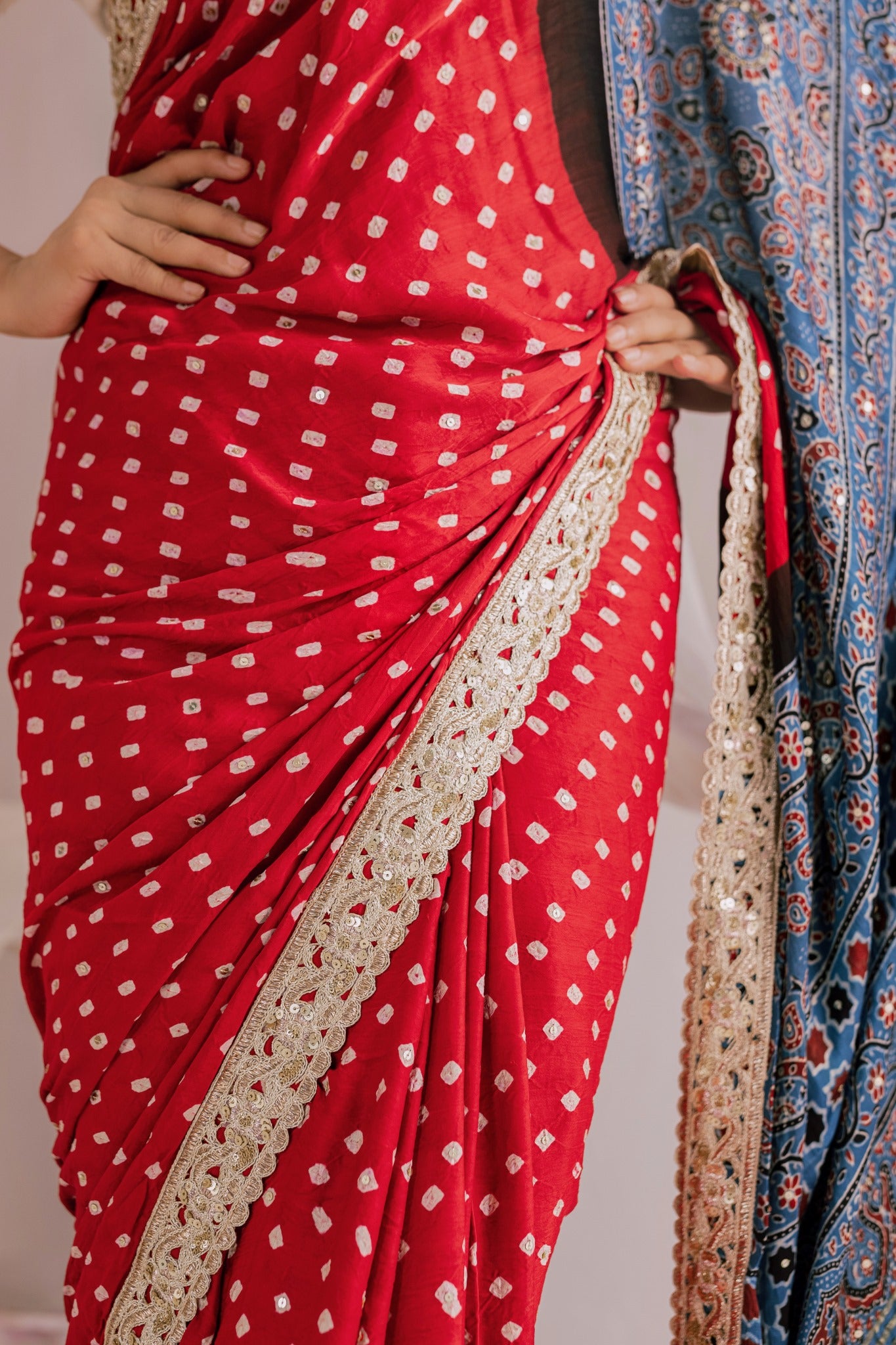 Red/Blue Handworked Modal Silk Bandhej Saree with Ajrakh Hand Block Pallu