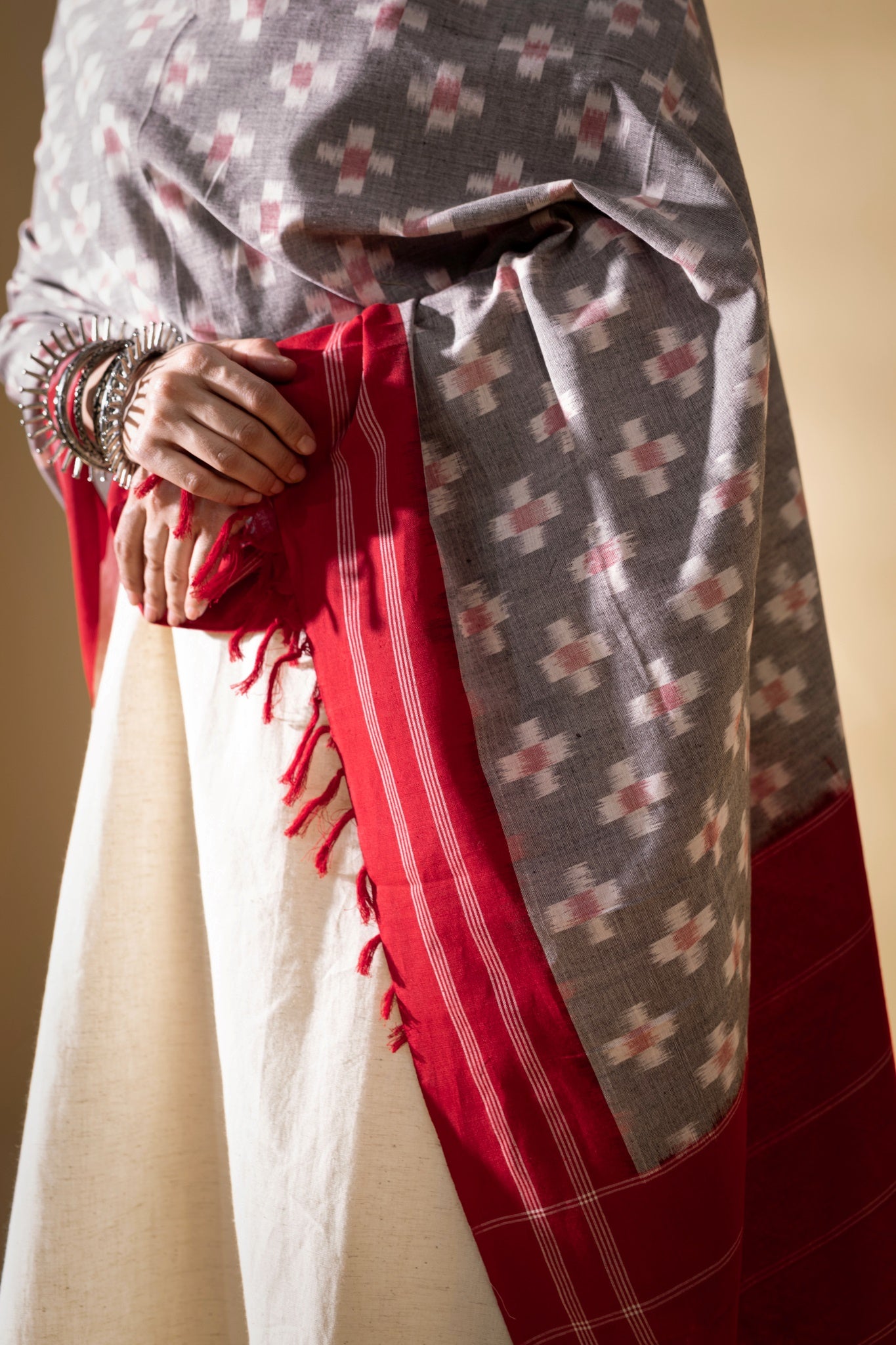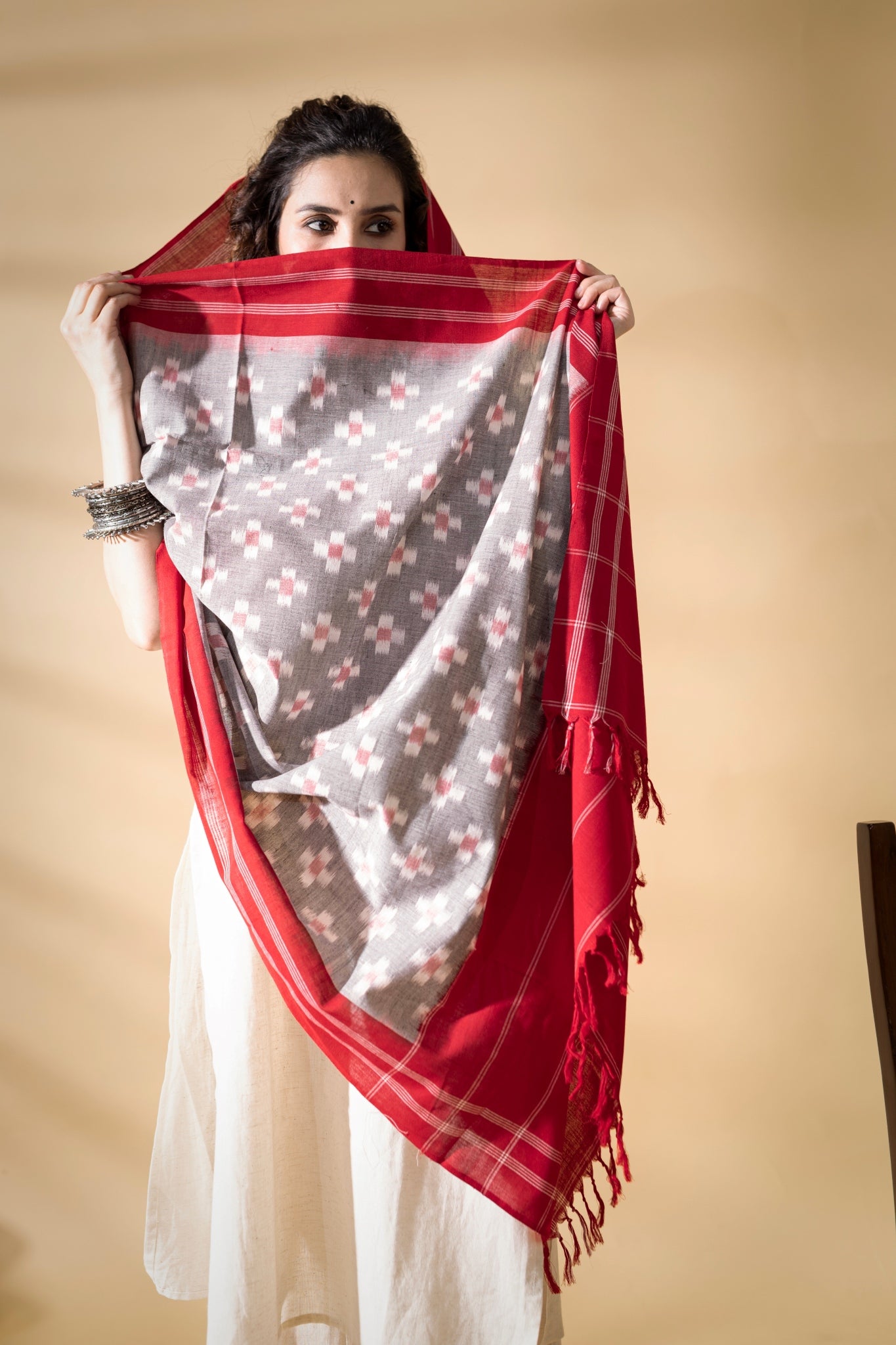 Red/Grey - Pochampally double Ikat cotton dupatta