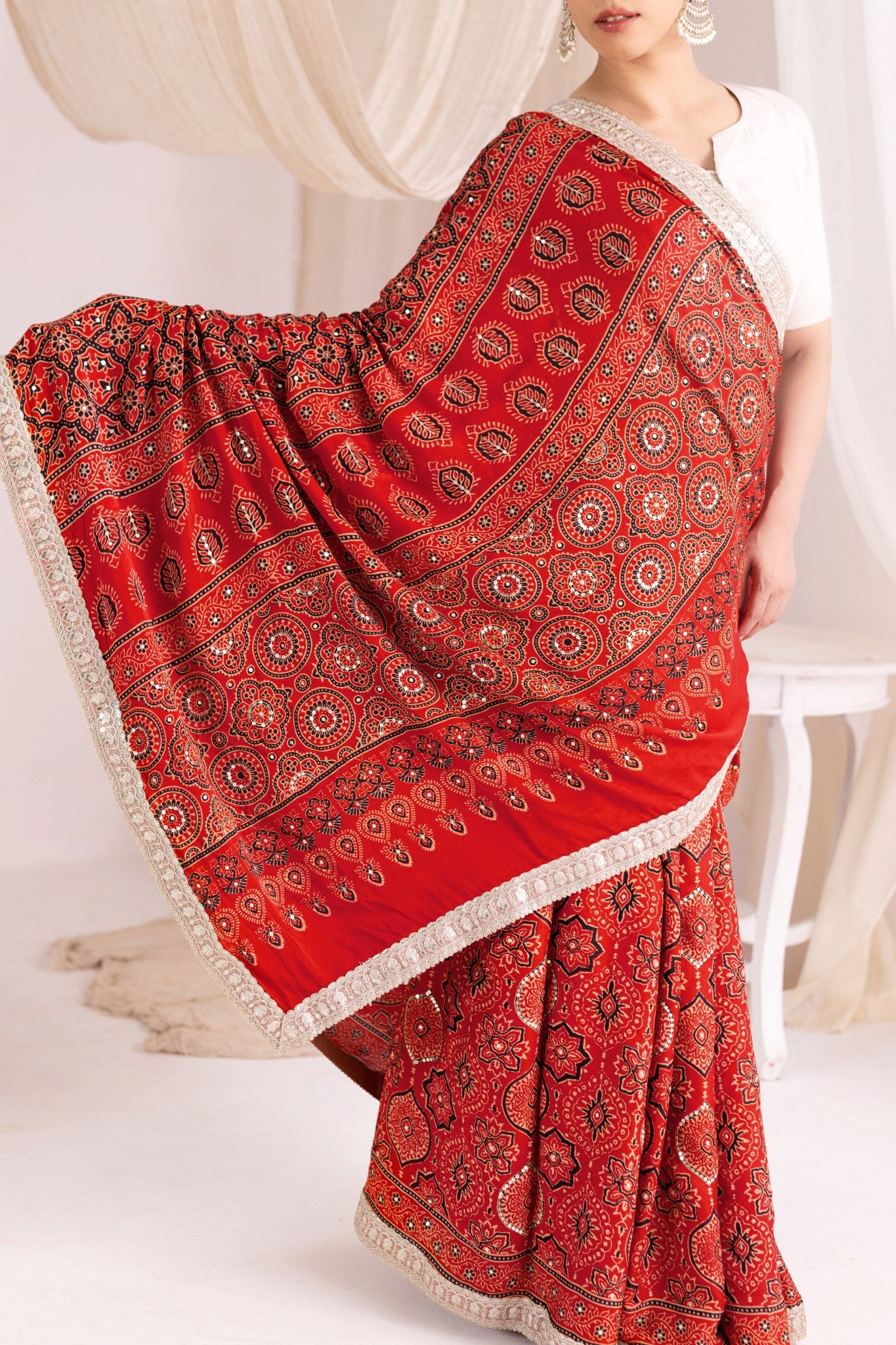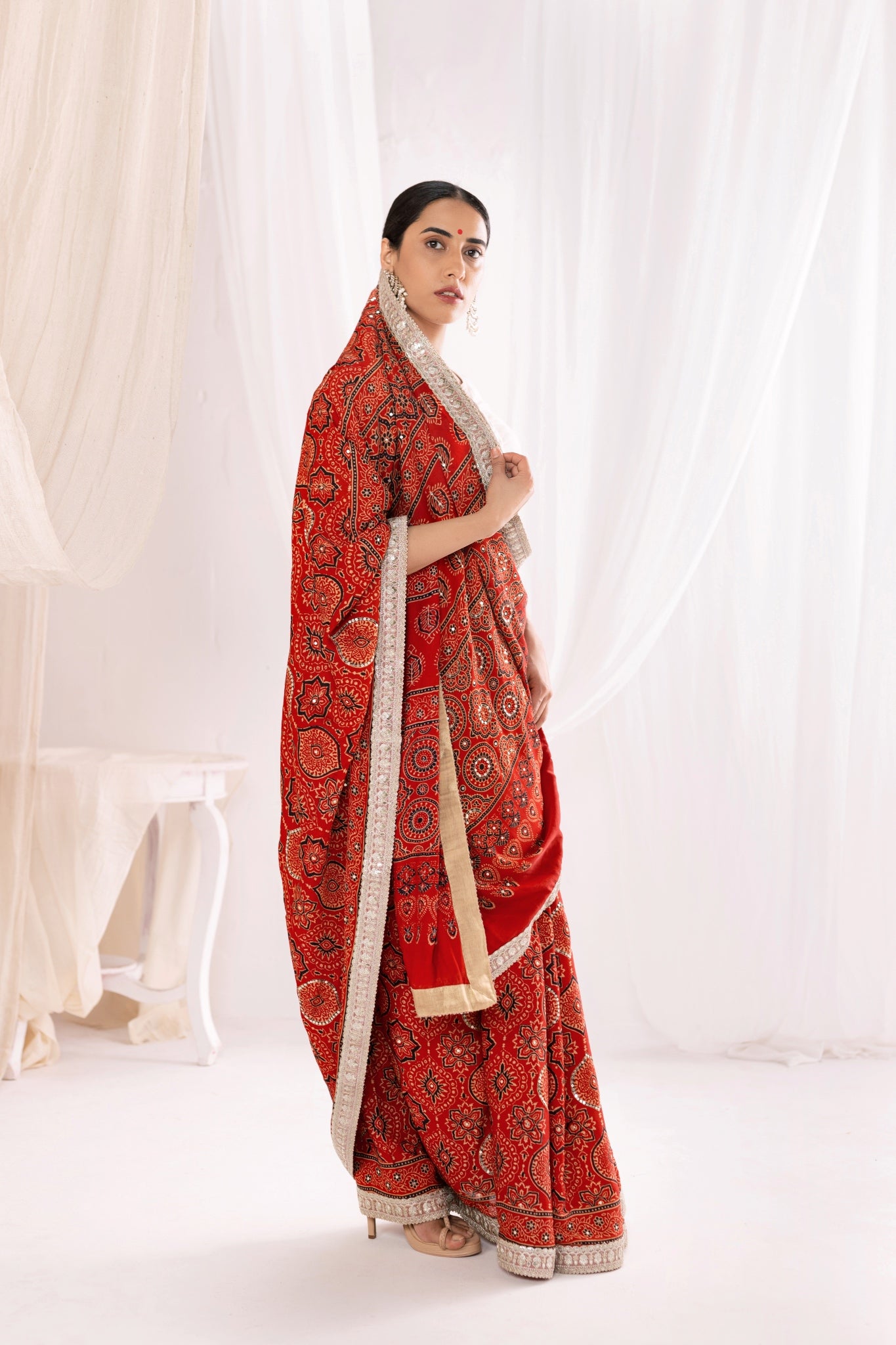 Red Modal Handworked Silk Ajrakh Hand Block Printed Saree with Hand Embroidery